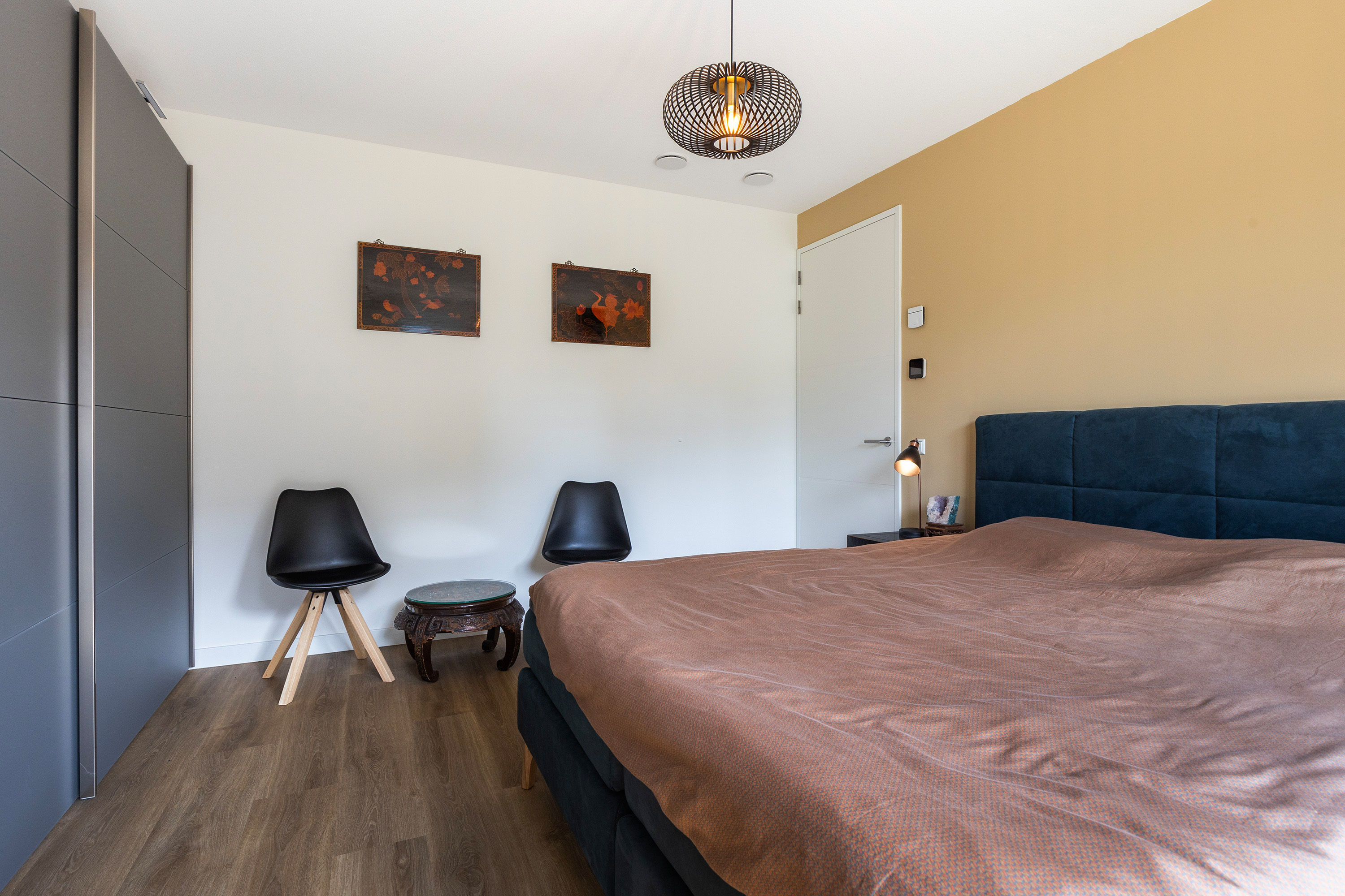 The living room, with its bay window and French balconies, is oriented towards the harbour and the sea. Thanks to the corner position and large glazed surfaces, you enjoy panoramic views that shift with the light throughout the day. The room offers excellent possibilities for a generous lounge arrangement, such as a large corner sofa paired with inviting armchairs facing the bay window. The view itself becomes a living artwork, continuously enhancing the atmosphere.