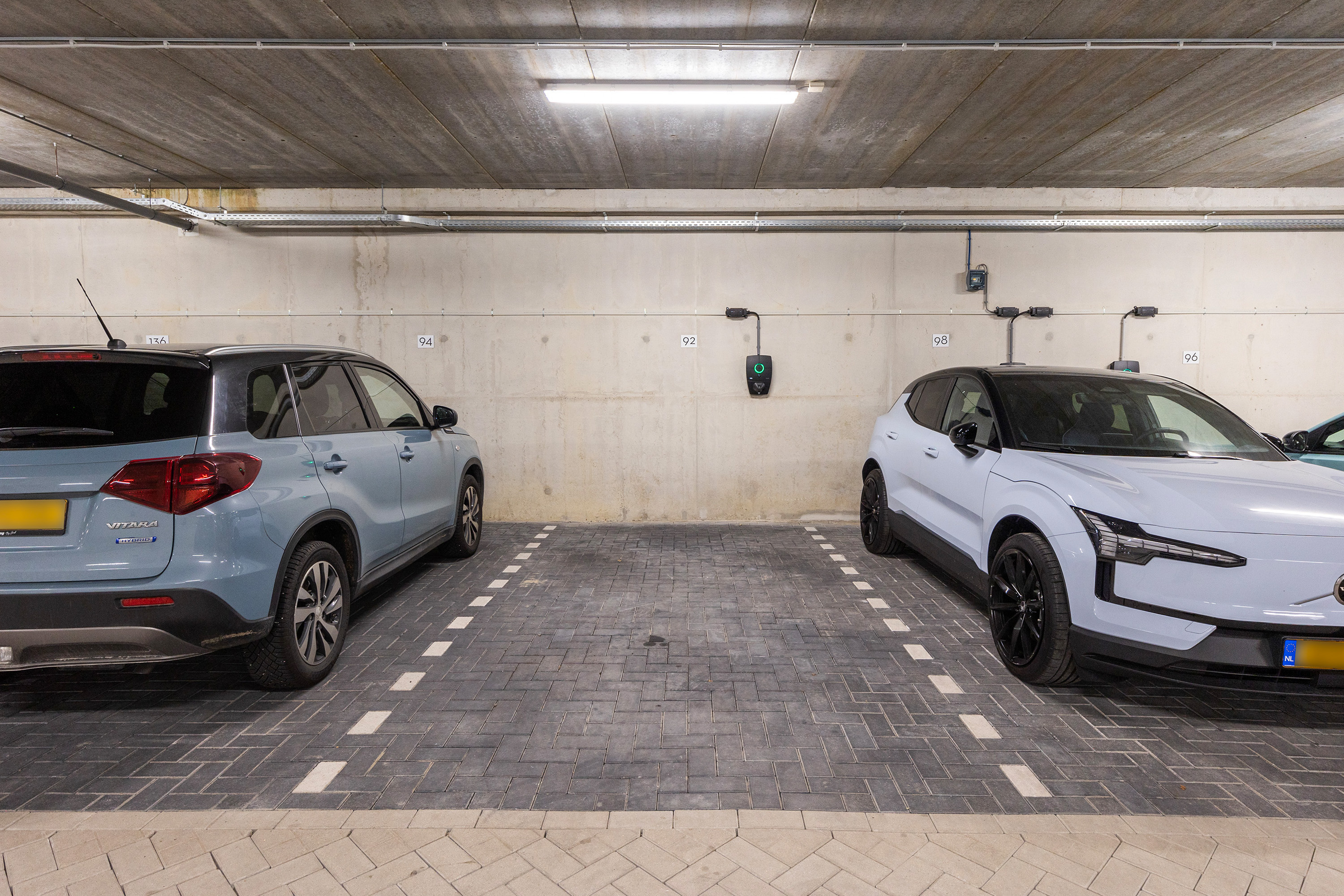 On the lower ground floor there is a private parking space equipped with an individual charging station for an electric vehicle (available for takeover), as well as a spacious private storage room with electricity. There is also a shared indoor bicycle storage area with charging facilities for e-bikes.