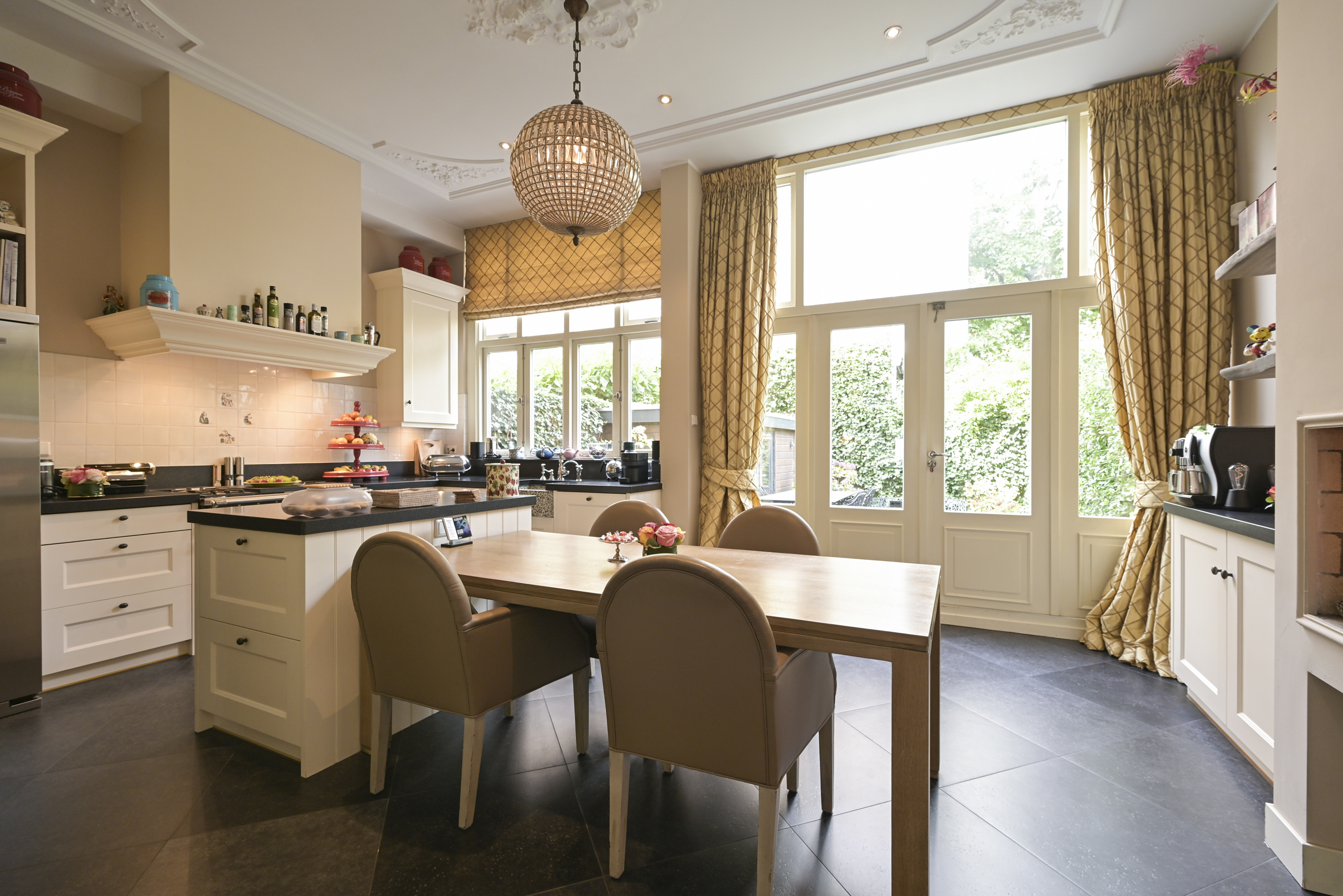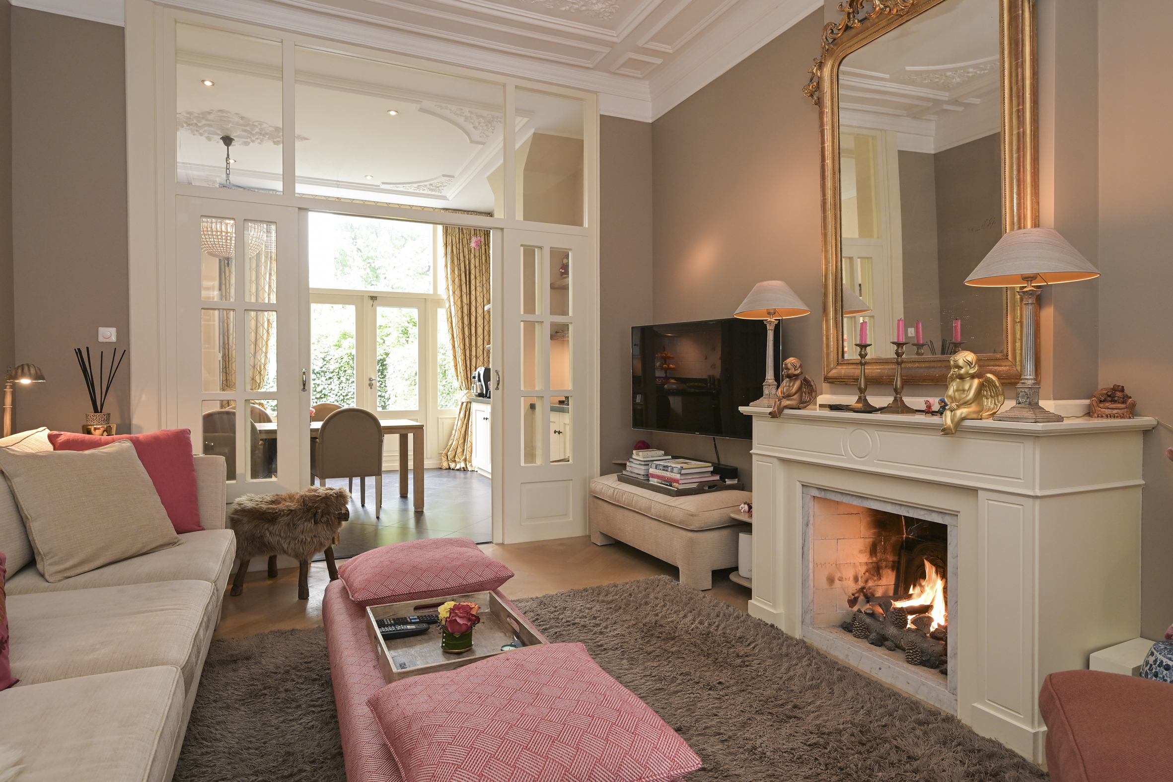 Layout: entrance, vestibule with built-in wardrobes and draft separation, hallway with storage space under the stairs, modern toilet with washbasin, and access to the cellar. Delightful, spacious living/dining room with suite separation featuring high sliding doors and built-in cupboards. Both rooms feature high ornate ceilings, beautiful oak parquet floors, and marble fireplaces with (gas) fires. The back room is connected to the full-width eat-in kitchen by a transparent partition, featuring built-in appliances, an island, and a gas fireplace. Double French doors lead to the delightfully private rear garden with a back entrance.