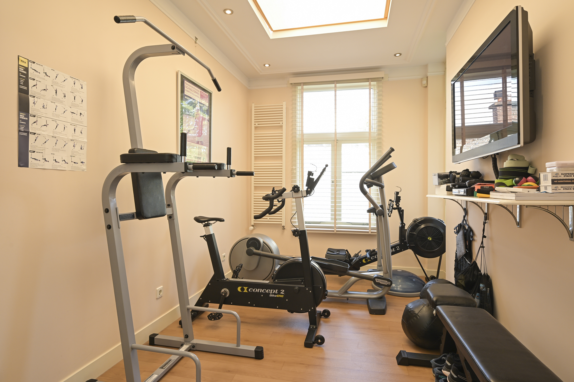 The 2nd floor features a bright landing thanks to the skylight, a modern toilet with a washbasin, a rear side room currently used as a gym, a large bedroom at the rear with French doors opening onto a balcony, a front side room with connections for a washing machine and dryer, a large bedroom at the front, and a complete intermediate bathroom with two separate showers, double sinks with vanity units, and natural light. All rooms on this floor feature oak flooring and air conditioning units.