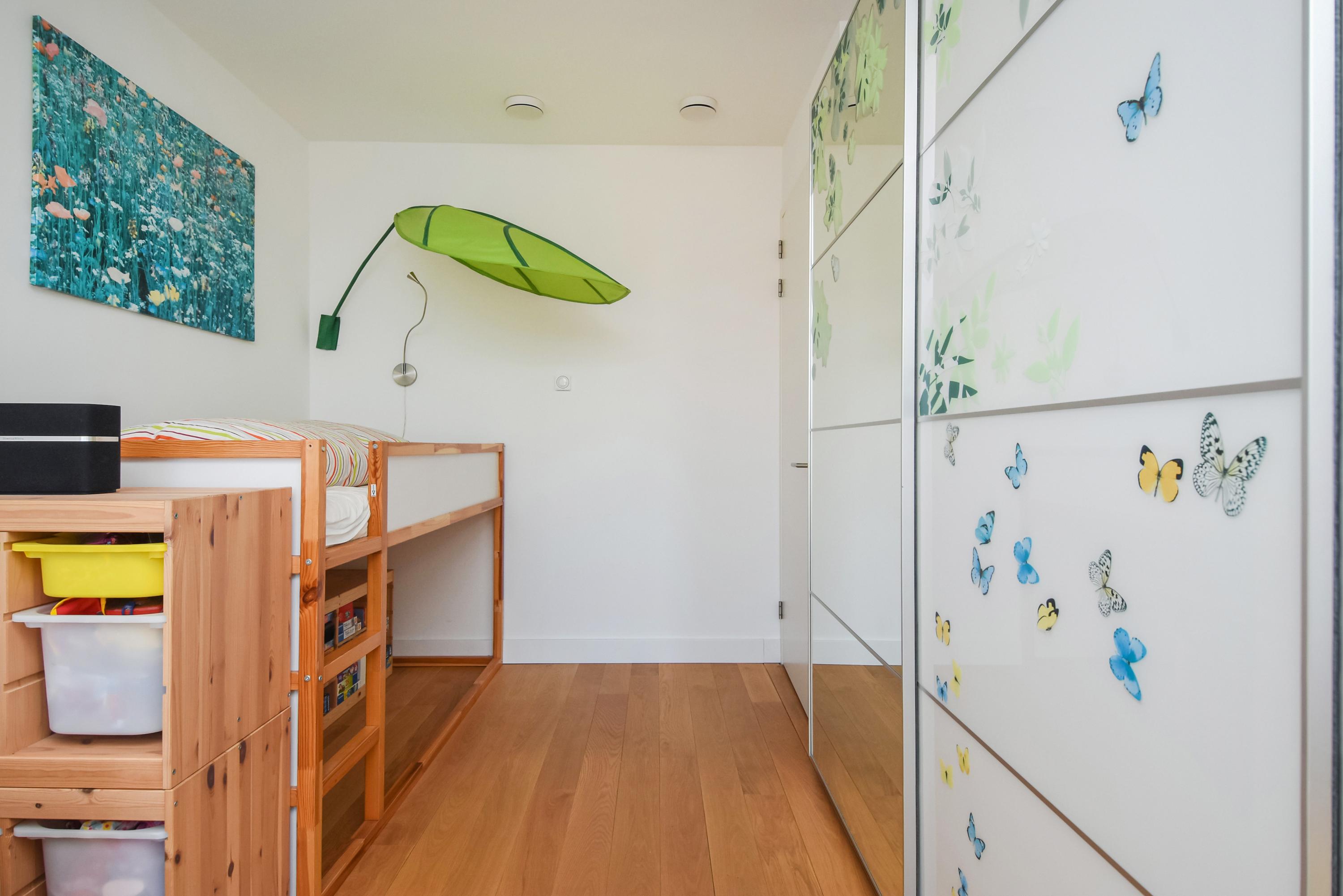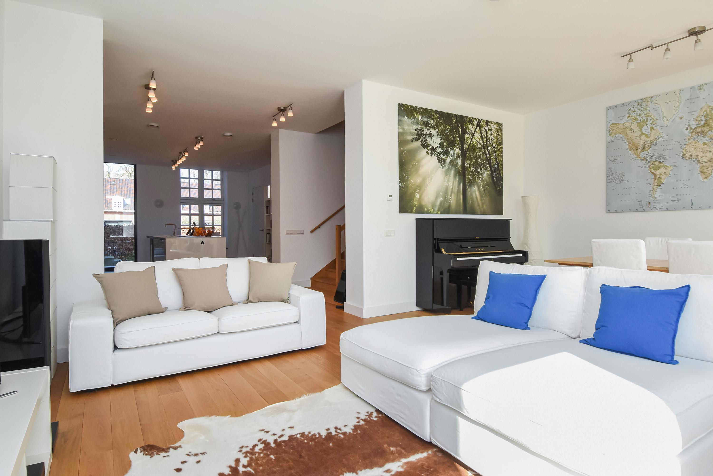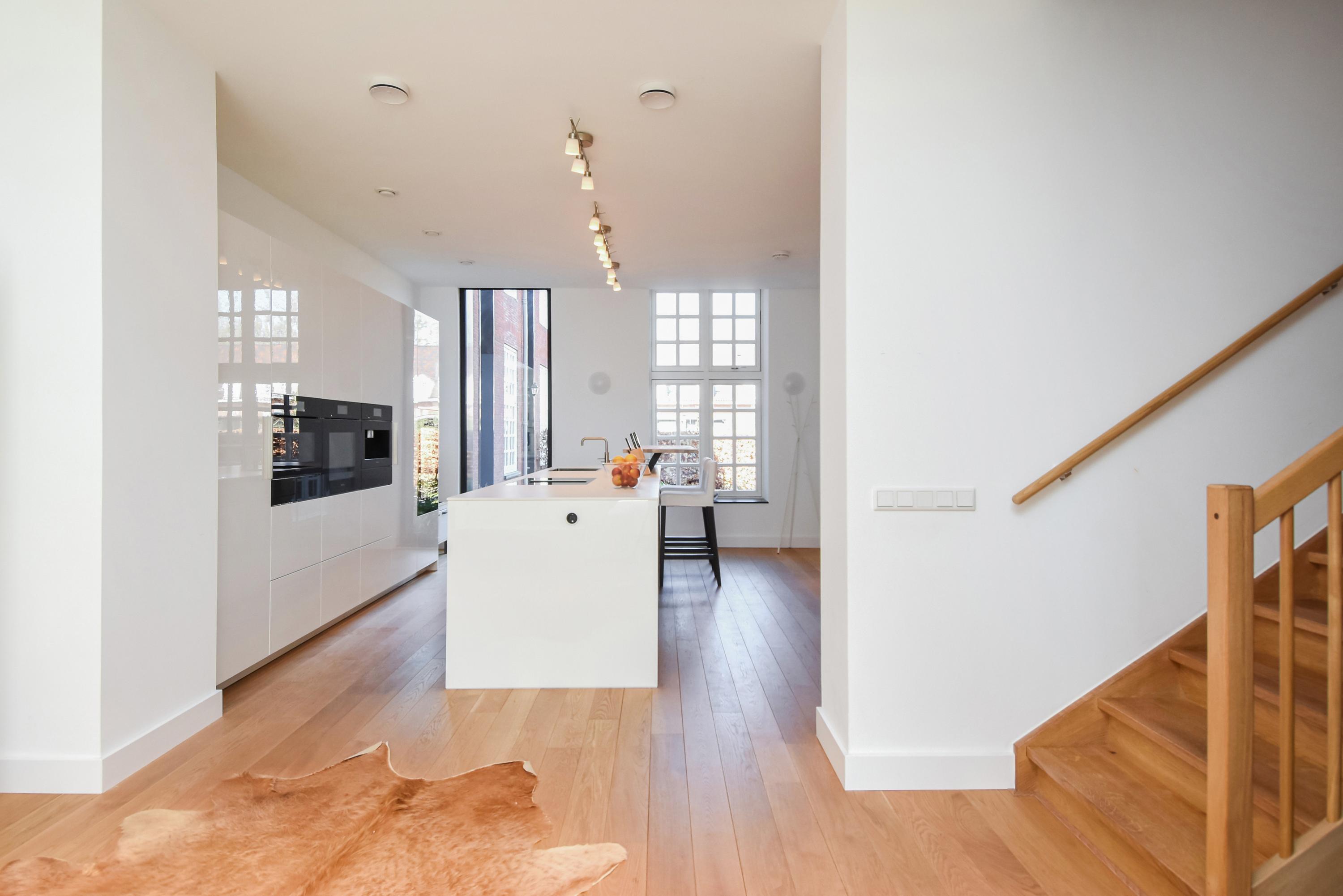 Floor-to-ceiling windows and high ceilings create luminous interiors, while solid oak floors and underfloor heating offer tactile comfort. Double doors open from the main living area to a southeast-facing garden of approximately 58 m², directly adjoining the private park reserved for residents. The ground and upper levels, connected by a fixed staircase, provide expansive spaces for family life or privacy.