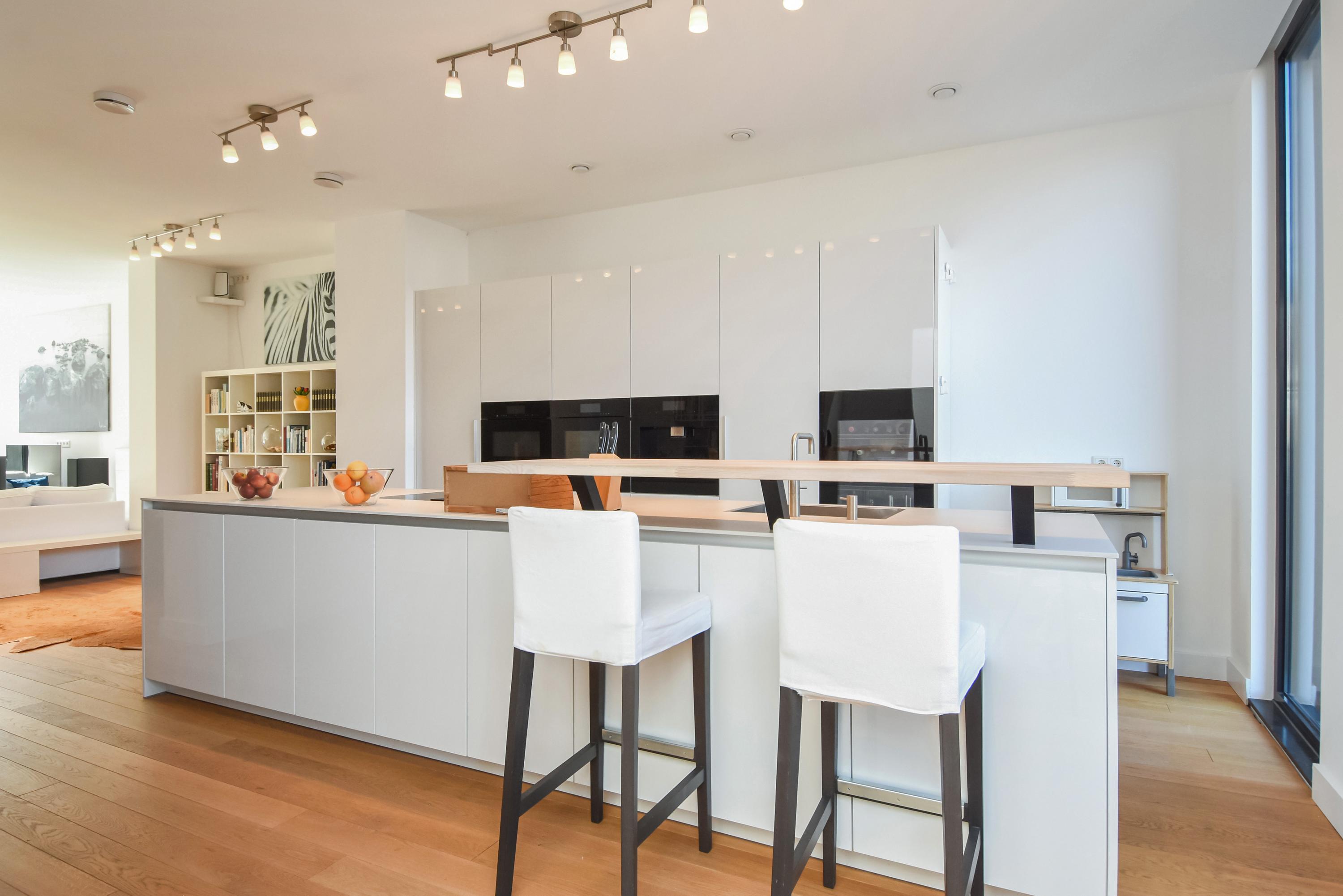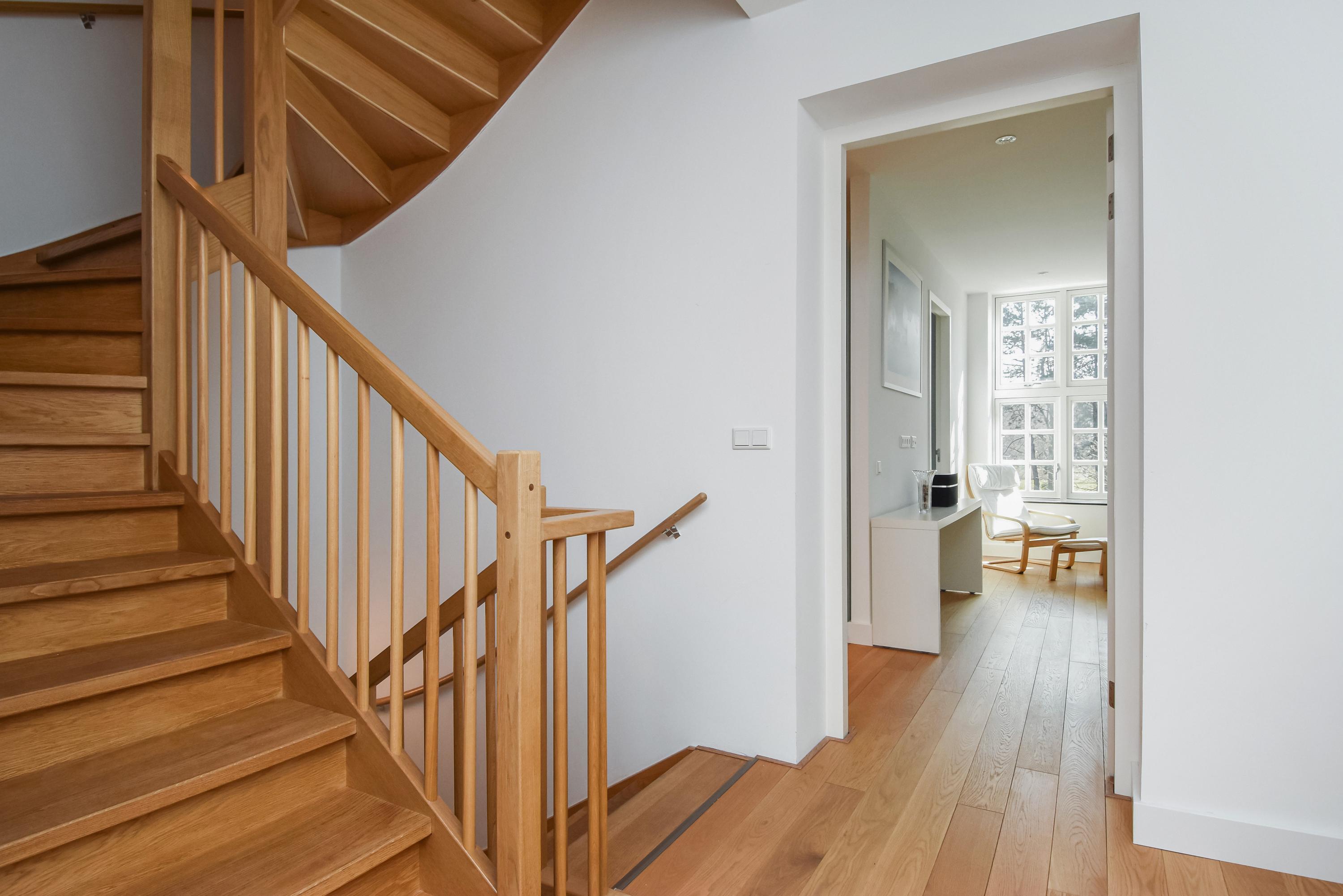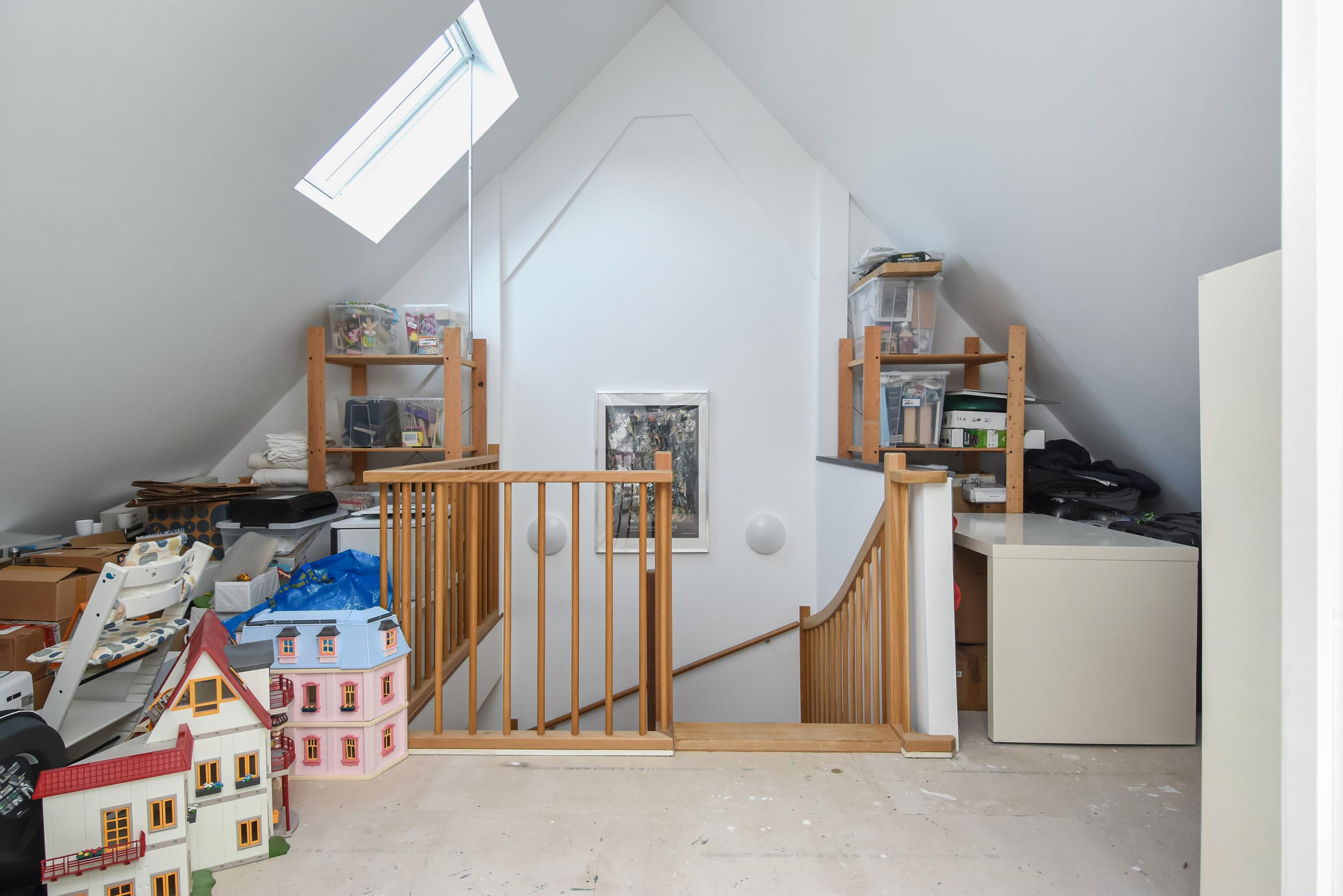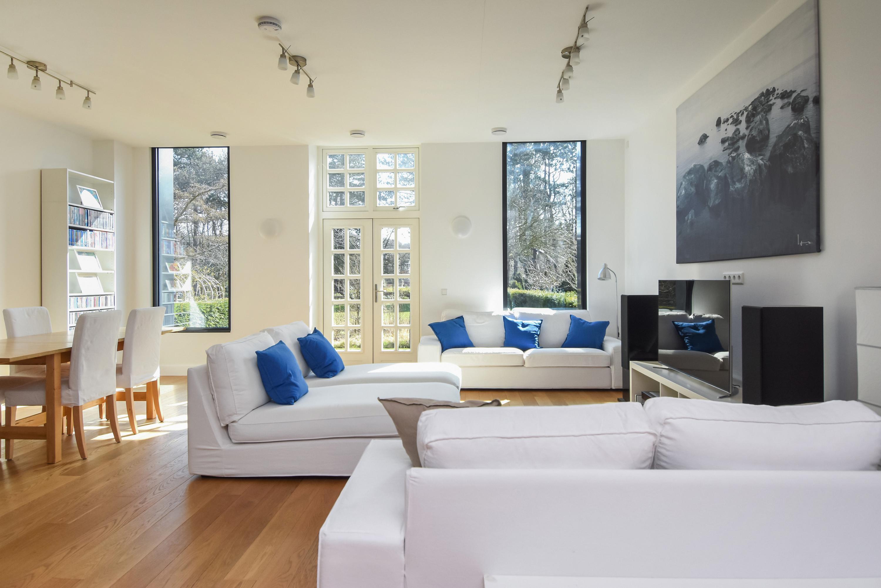 Floor-to-ceiling windows and high ceilings create luminous interiors, while solid oak floors and underfloor heating offer tactile comfort. Double doors open from the main living area to a southeast-facing garden of approximately 58 m², directly adjoining the private park reserved for residents. The ground and upper levels, connected by a fixed staircase, provide expansive spaces for family life or privacy.
