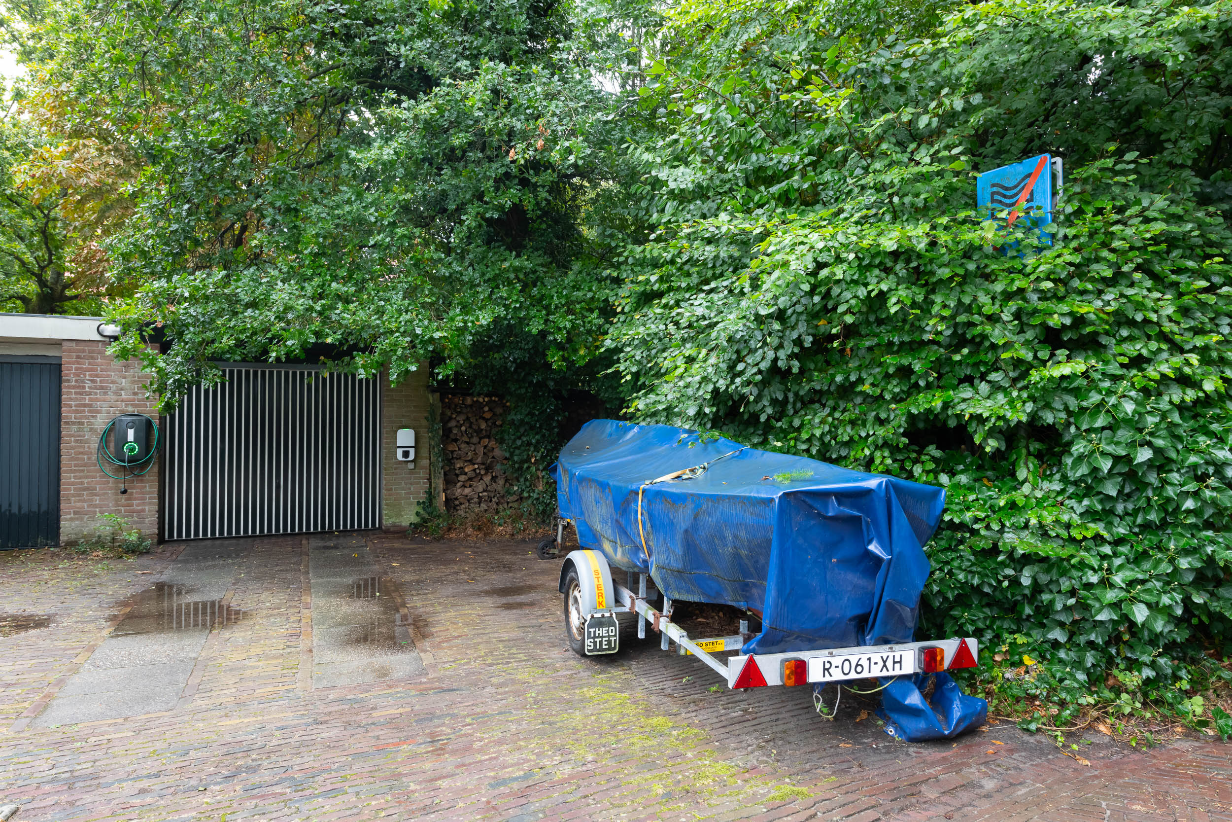 There are various buildings in the garden: a wooden detached shed in the backyard and a garage.