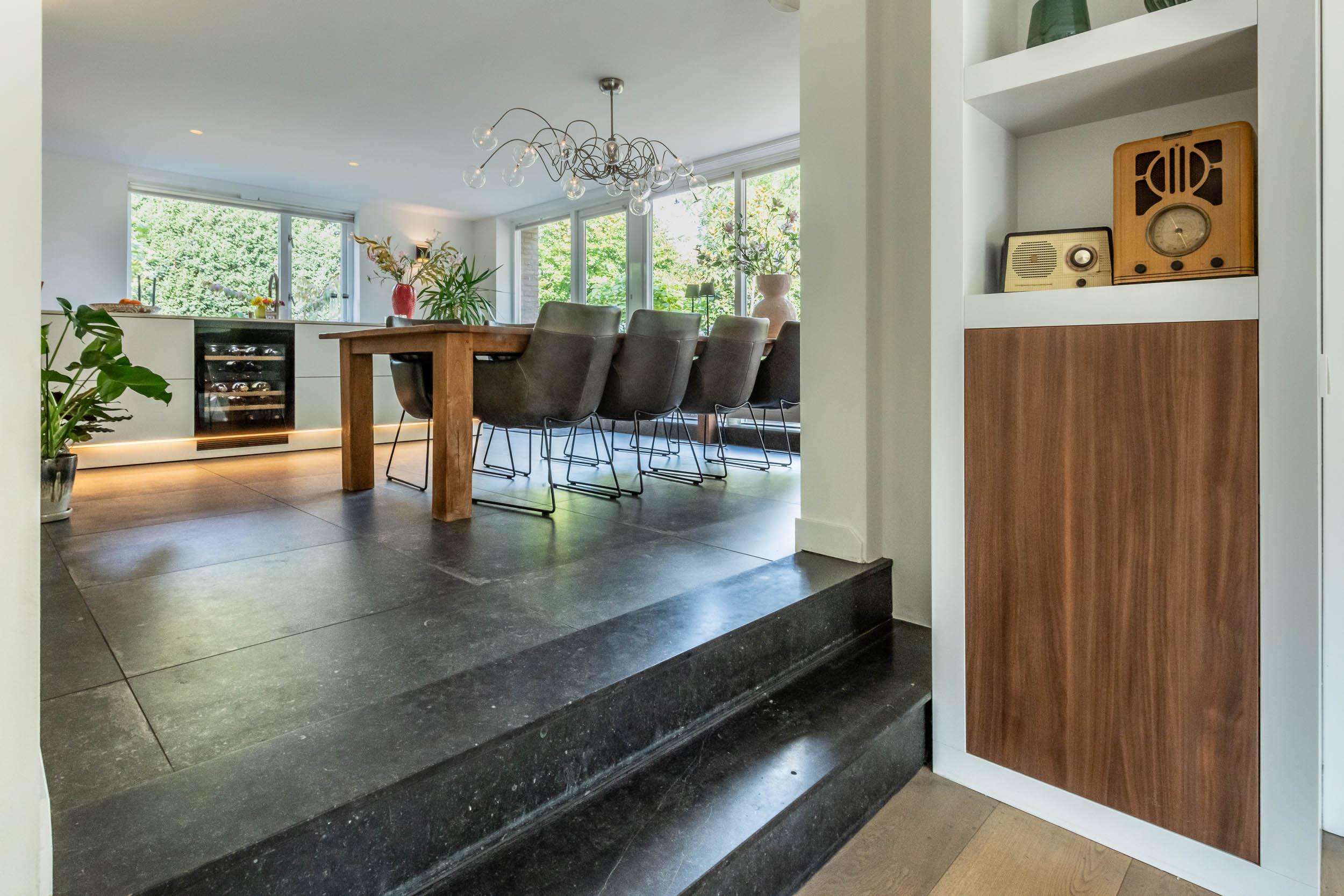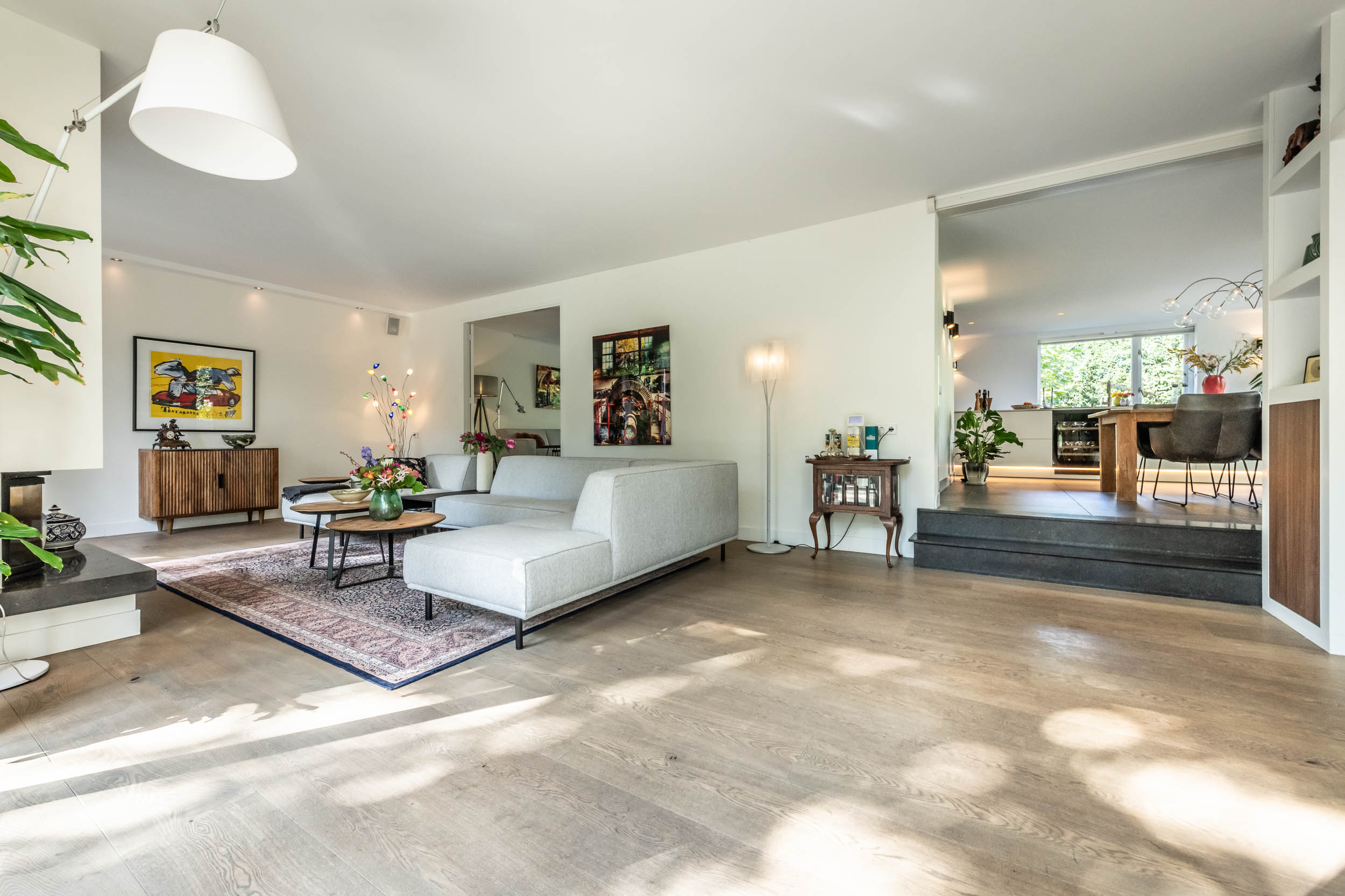 Entrance hall, spacious hallway with toilet and urinal, bright and spacious living room with fireplace, oak flooring and doors to the front terrace. A double door connects to the second living room/TV room with large windows and a view of the back garden. Luxurious, tailor-made kitchen-diner (’t Spant in Heemstede, 2022) featuring underfloor heating, a sink/kitchen island and various built-in appliances: wine climate cabinet, ovens, Quooker with sparkling water feature, coffee machine, Bora electric hob with flex zones and dishwasher. Door to the side garden.