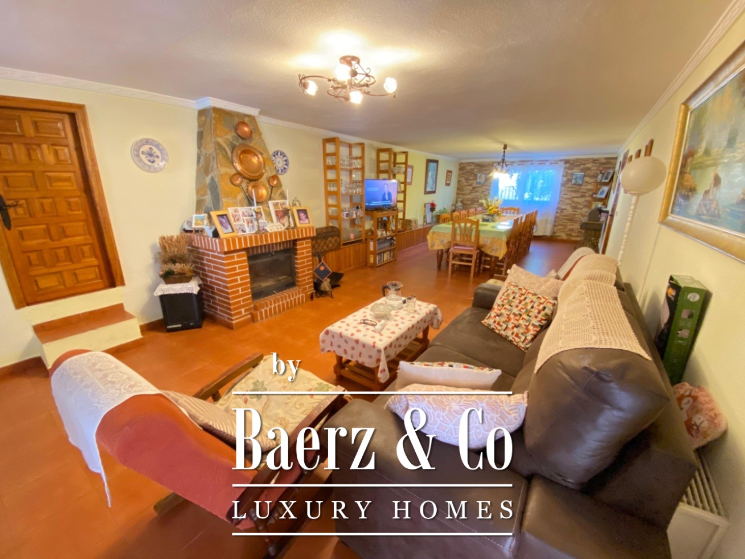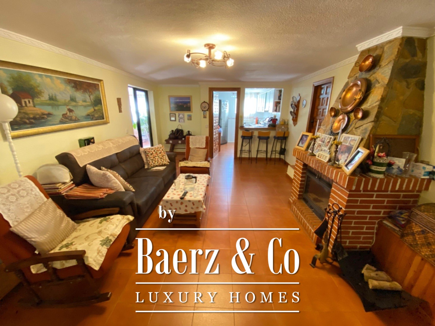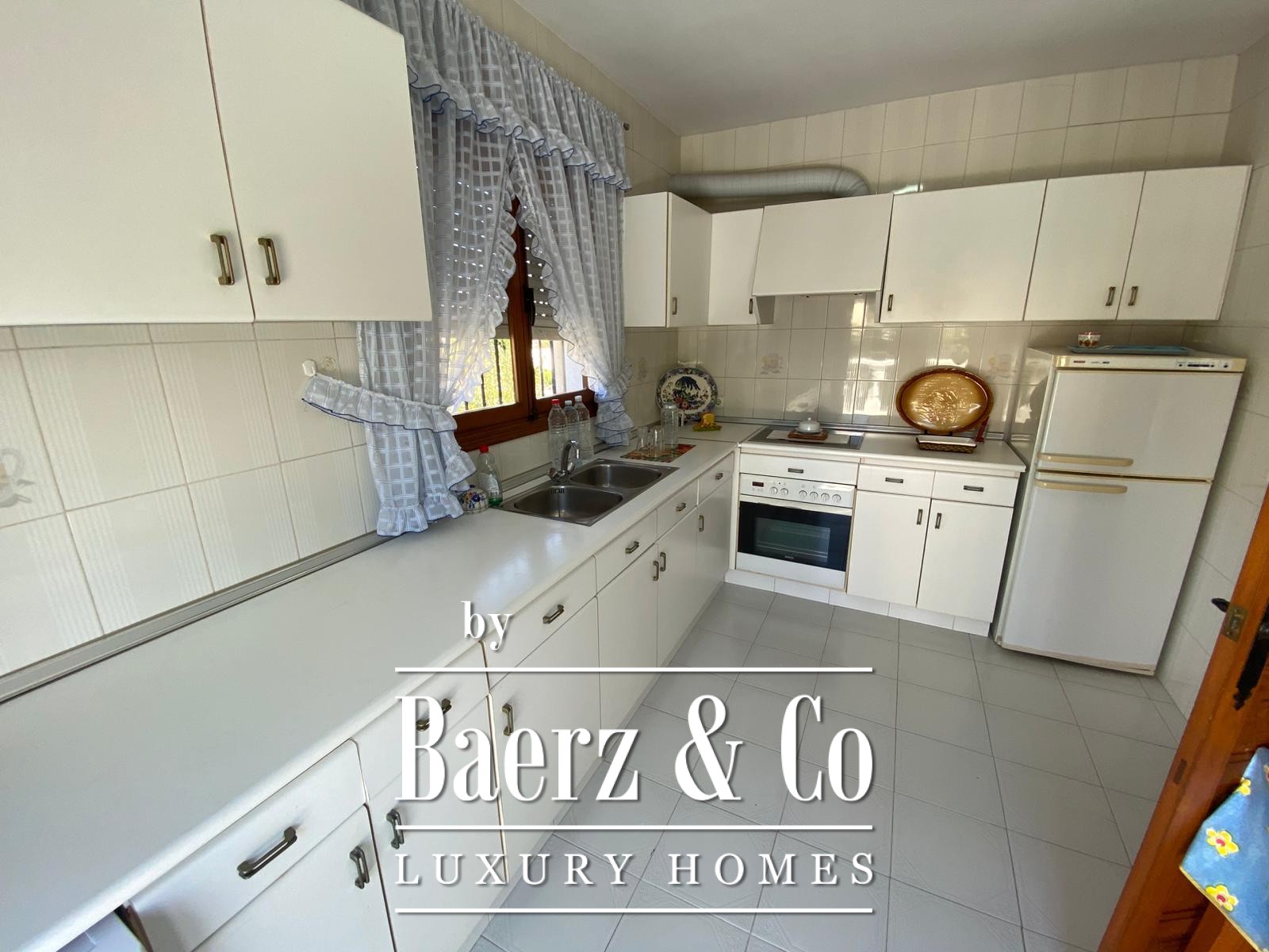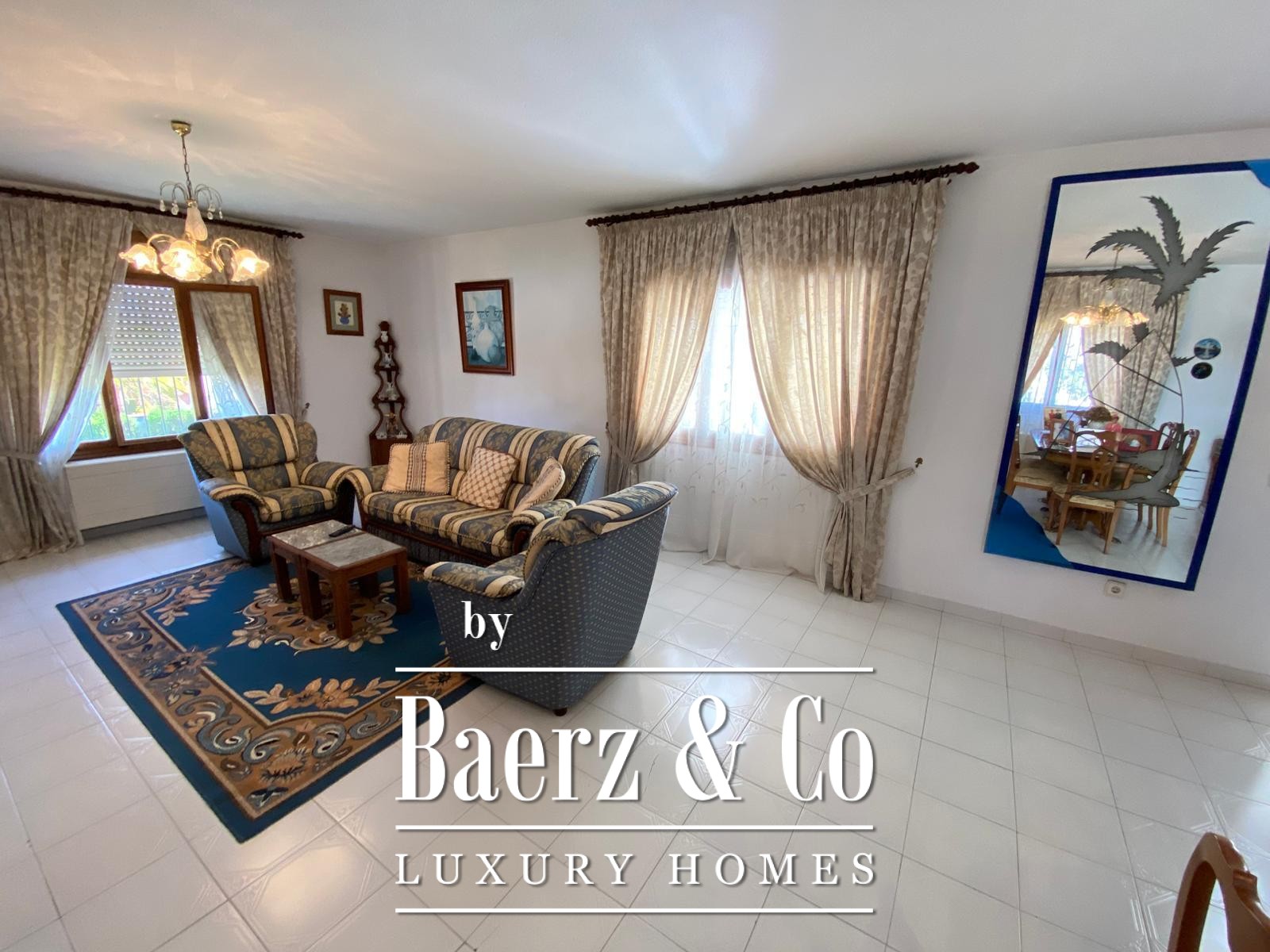 The elegant living and dining room, complete with a fireplace, connects to an independent kitchen. Three bedrooms are thoughtfully designed for comfort, the principal suite with its own en-suite bathroom, complemented by two additional bathrooms. Floor-to-ceiling windows throughout draw in Mediterranean light, and central heating, air conditioning, and double-glazed windows ensure the villa is suited to year-round living.