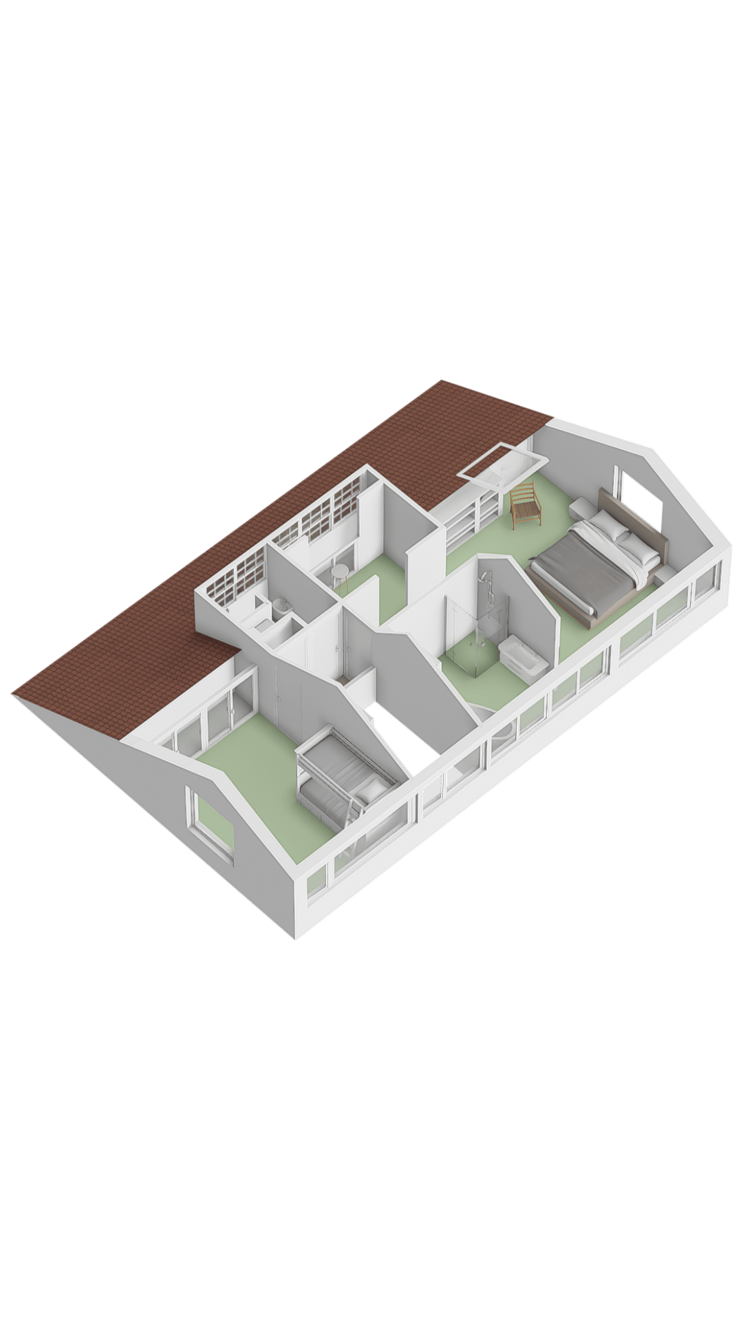At the rear, you’ll find the impressive master bedroom — bright, spacious, and equipped with a large walk-in closet and a luxurious open-plan bathroom featuring a double washbasin, walk-in shower, and freestanding bathtub. This bedroom also enjoys a stunning view over the garden and includes additional storage in the eaves.
