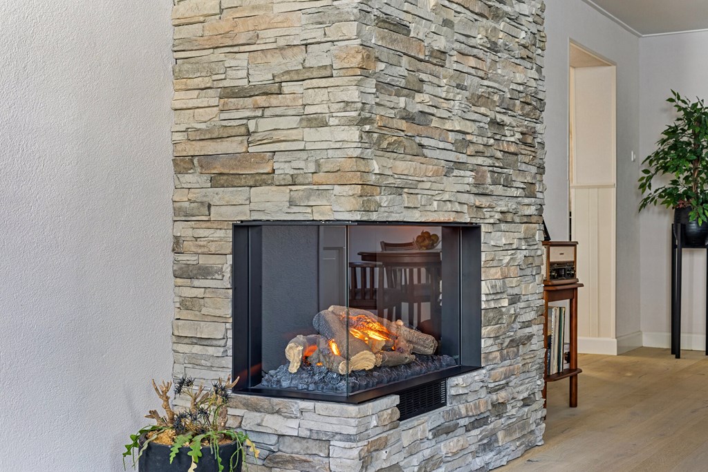 The front living room has an open layout, is filled with natural light, and offers plenty of space to create a comfortable sitting and dining area. A characteristic electric fireplace adds atmosphere and warmth to the room.