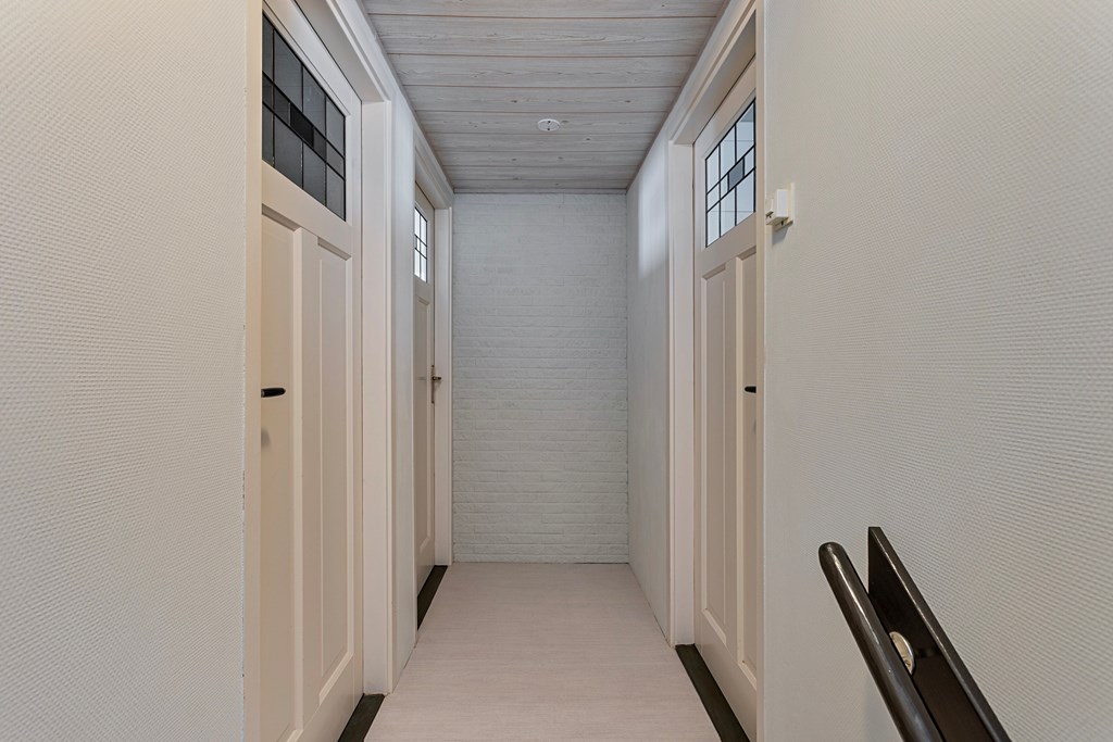 The house is entered from the street side. Along the side of the property is a private driveway with carport, ideal for parking a car or bicycles. Inside, you arrive in a spacious hallway, which provides access to the WC, stairs to the first floor, the basement, and the passage to the kitchen and living room.