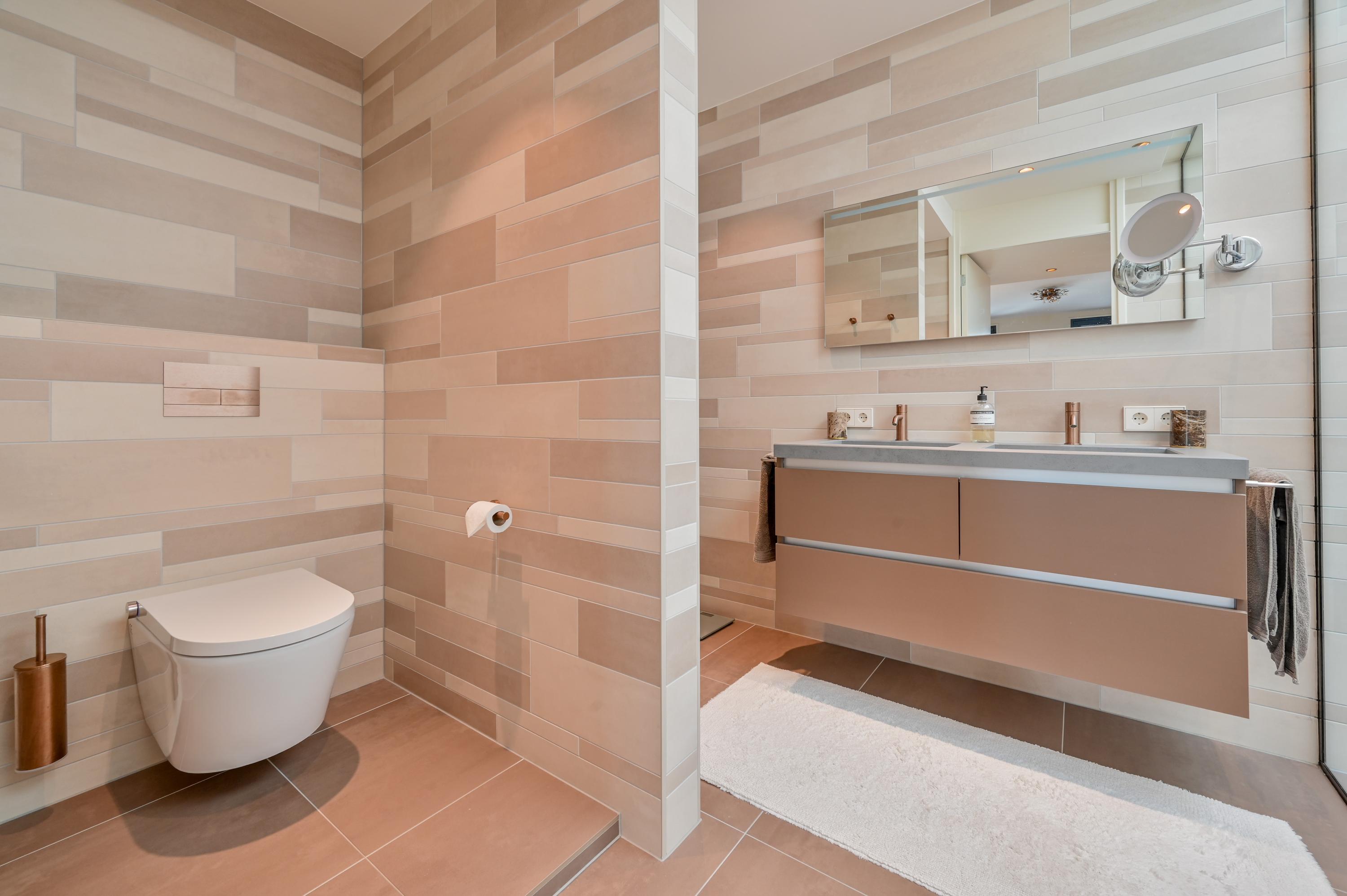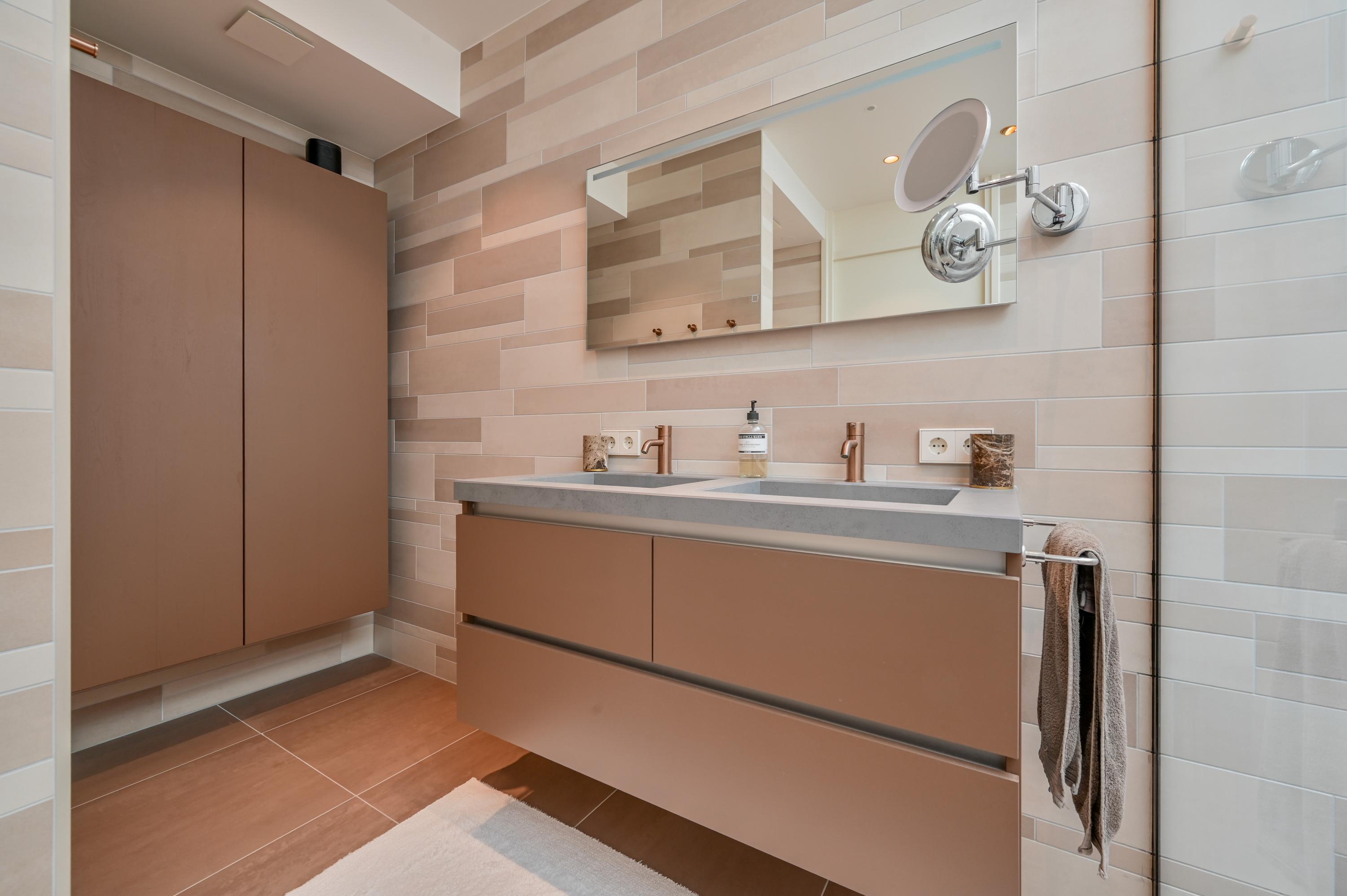 The second floor reveals a rooftop terrace with unobstructed views over the Amstel and polder, enriched by a pergola, integrated lighting, and water connection, creating an inviting setting for quiet reflection or hosting guests. Beneath the house, the garage is configured as a versatile studio, complete with kitchen, toilet, underfloor heating, and air conditioning, accessible via both the terrace and an electric entry.