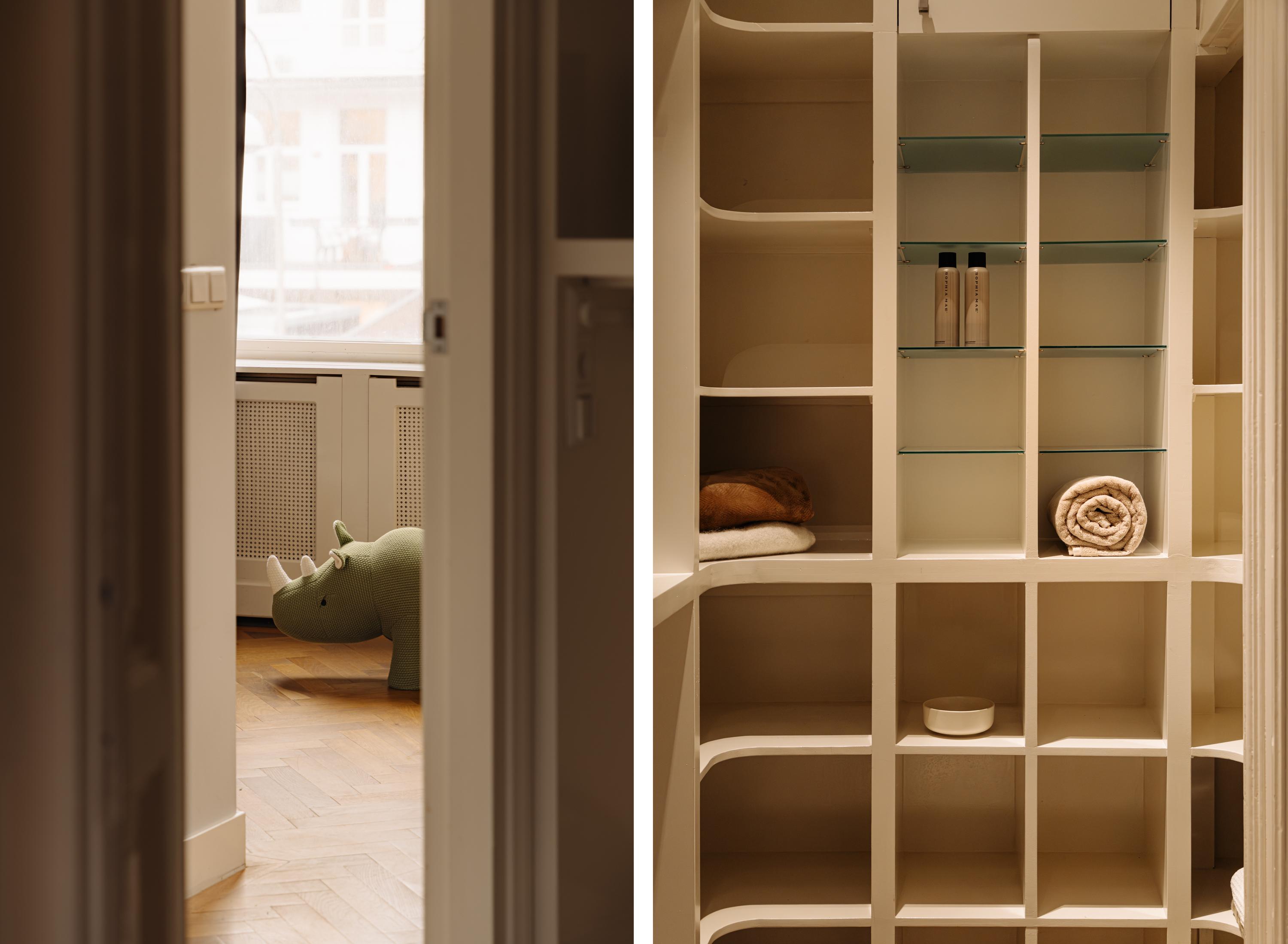 The first floor features two spacious and atmospheric bedrooms and a generous bathroom. The rear bedroom radiates tranquillity thanks to the high ceilings, herringbone floor, warm tones and a classical mantelpiece. Adjacent is a beautiful walk-in closet with custom-made cabinetry, open shelving and integrated lighting—a particularly comfortable and luxurious space to start the day.