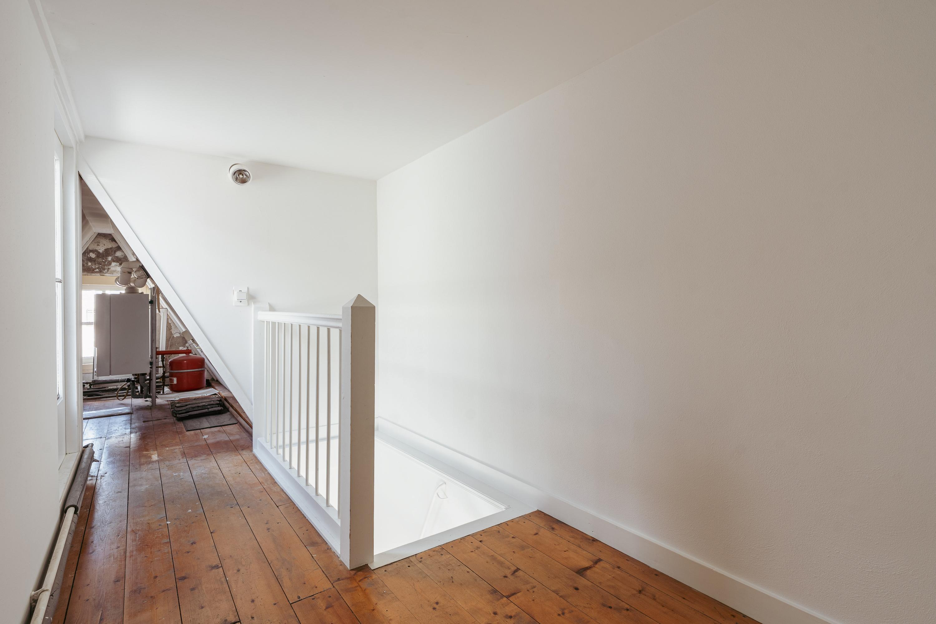 On the third floor is the second spacious bedroom, also with a beautiful canal view at the front. This floor has its own bathroom, fitted with a bathtub with shower, toilet, and washbasin. Several built-in wardrobes are also present here. An open staircase leads up to the attic.