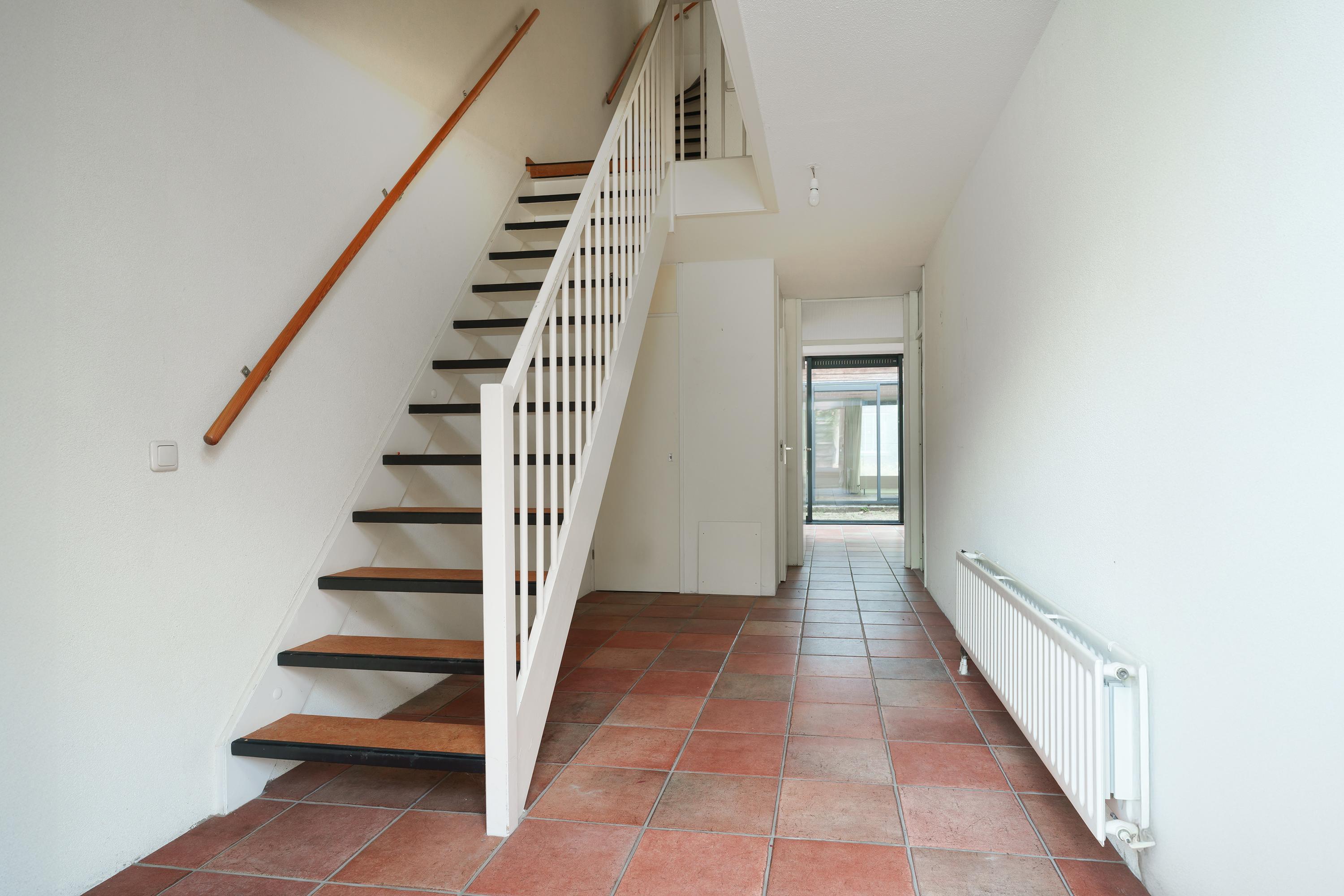 You enter the home through the front entrance. Here you will also find the spacious indoor storage/garage (21 m²), equipped with electricity, water, heating and an electric door. In the generous hallway you will find the meter cupboard, toilet and stairs to the upper floor.