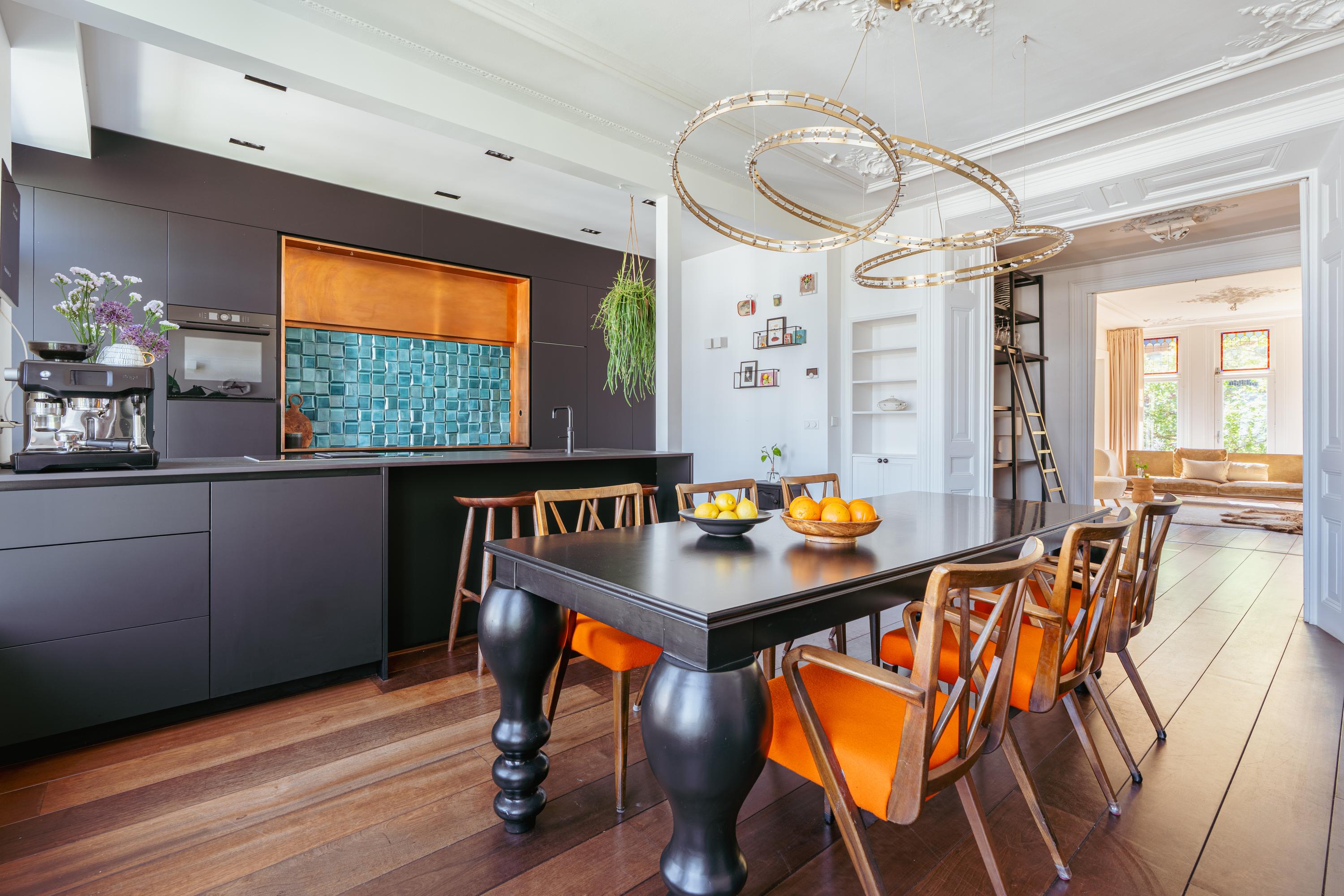 The modern open kitchen, located at the bright rear side of the home, boasts a unique island with a Dekton countertop and a copper backsplash featuring Portuguese 3D tiles. Luxury appliances include an induction cooktop with integrated extractor, (steam) oven with sous-vide and plate-warming functions, large refrigerator and separate freezer, dishwasher, and a Quooker tap with sparkling water function. The expansive dining area spans an impressive 35 m², perfect for unforgettable gatherings with family and friends.
