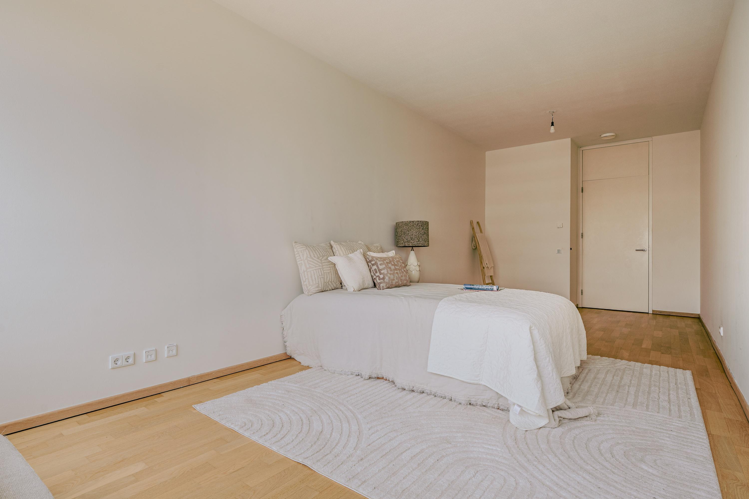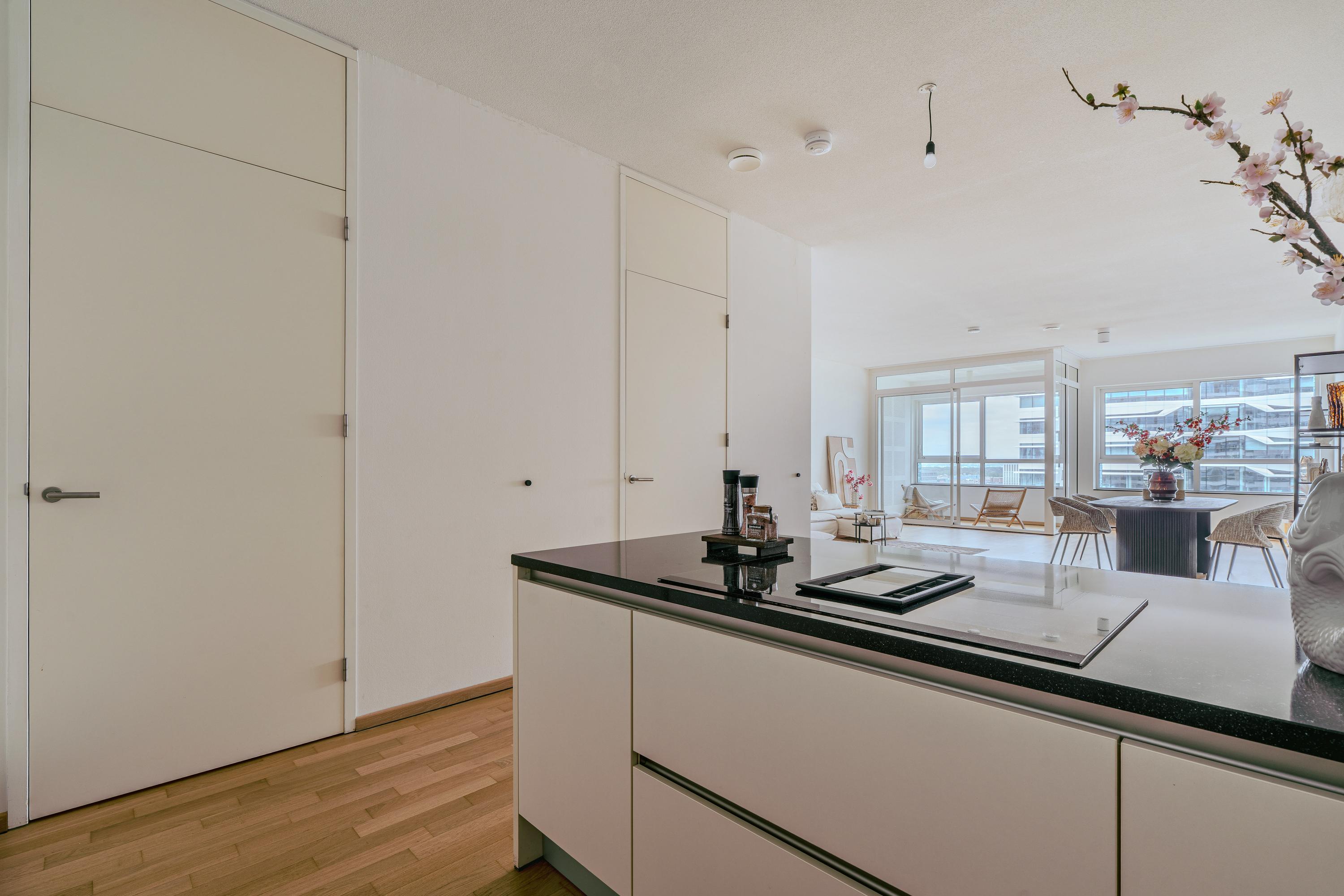 Upon entering, a spacious hallway welcomes you with a meter cupboard, separate toilet, and room for a coat closet. From here, you walk into the expansive and open-plan living room, where the breathtaking views immediately capture your attention. Floor-to-ceiling windows enhance the sense of space and light throughout. At the front of the apartment, you’ll find a sunroom — the perfect spot to unwind, read a book, or simply enjoy the panoramic view. The open kitchen at the rear is equipped with high-quality built-in appliances, including a refrigerator, freezer, induction hob with integrated extractor, Quooker, and dishwasher. A separate utility room offers additional storage space.