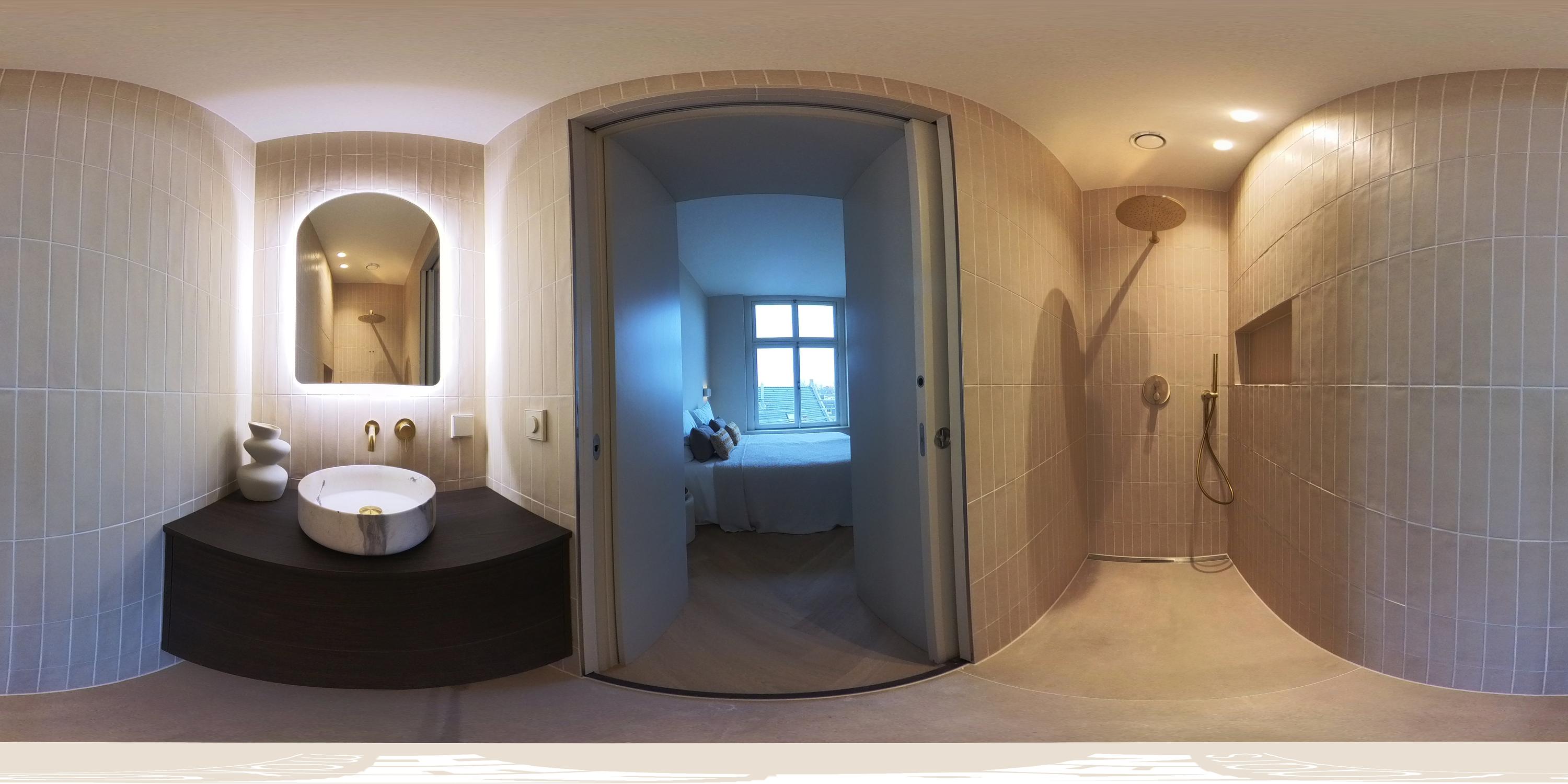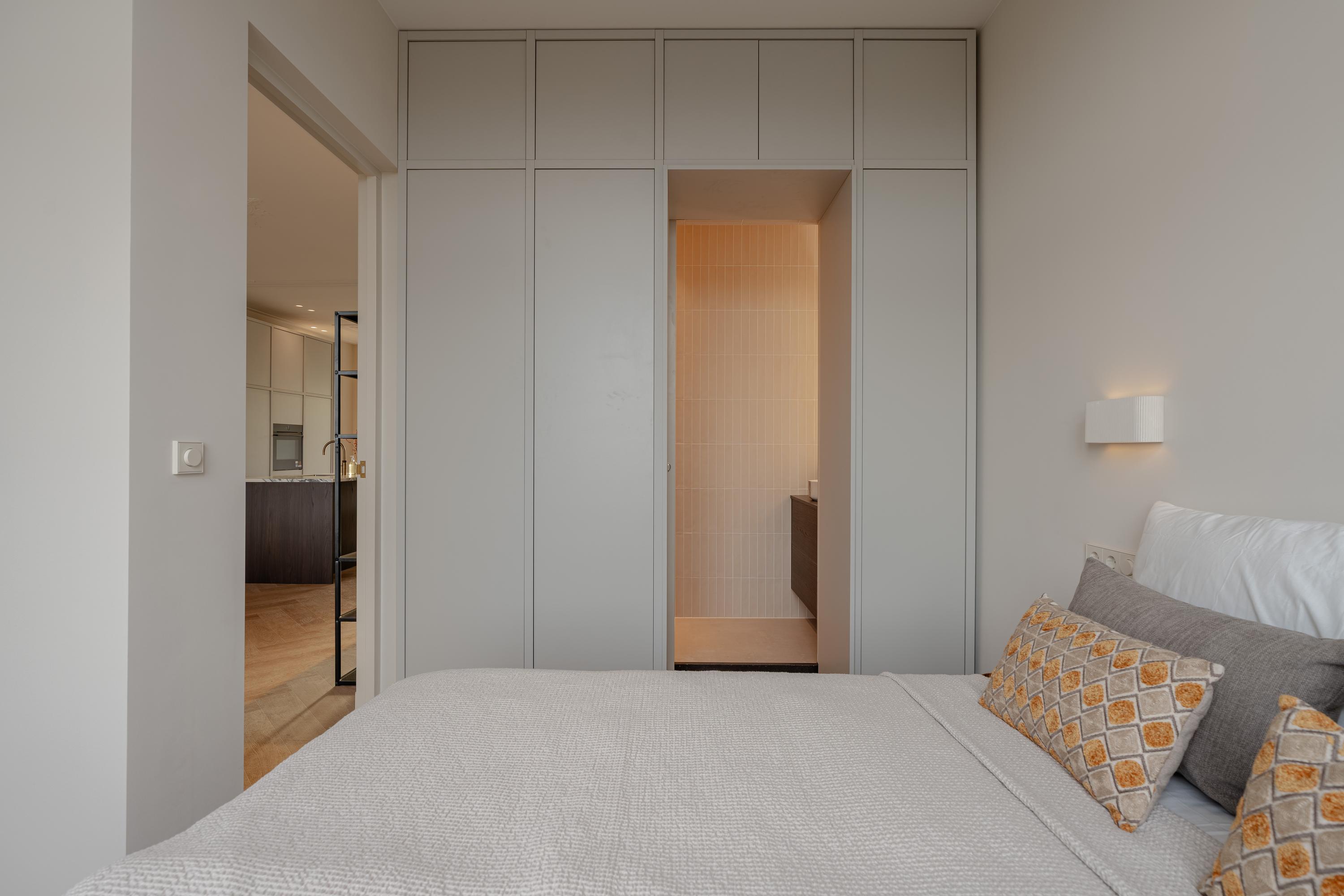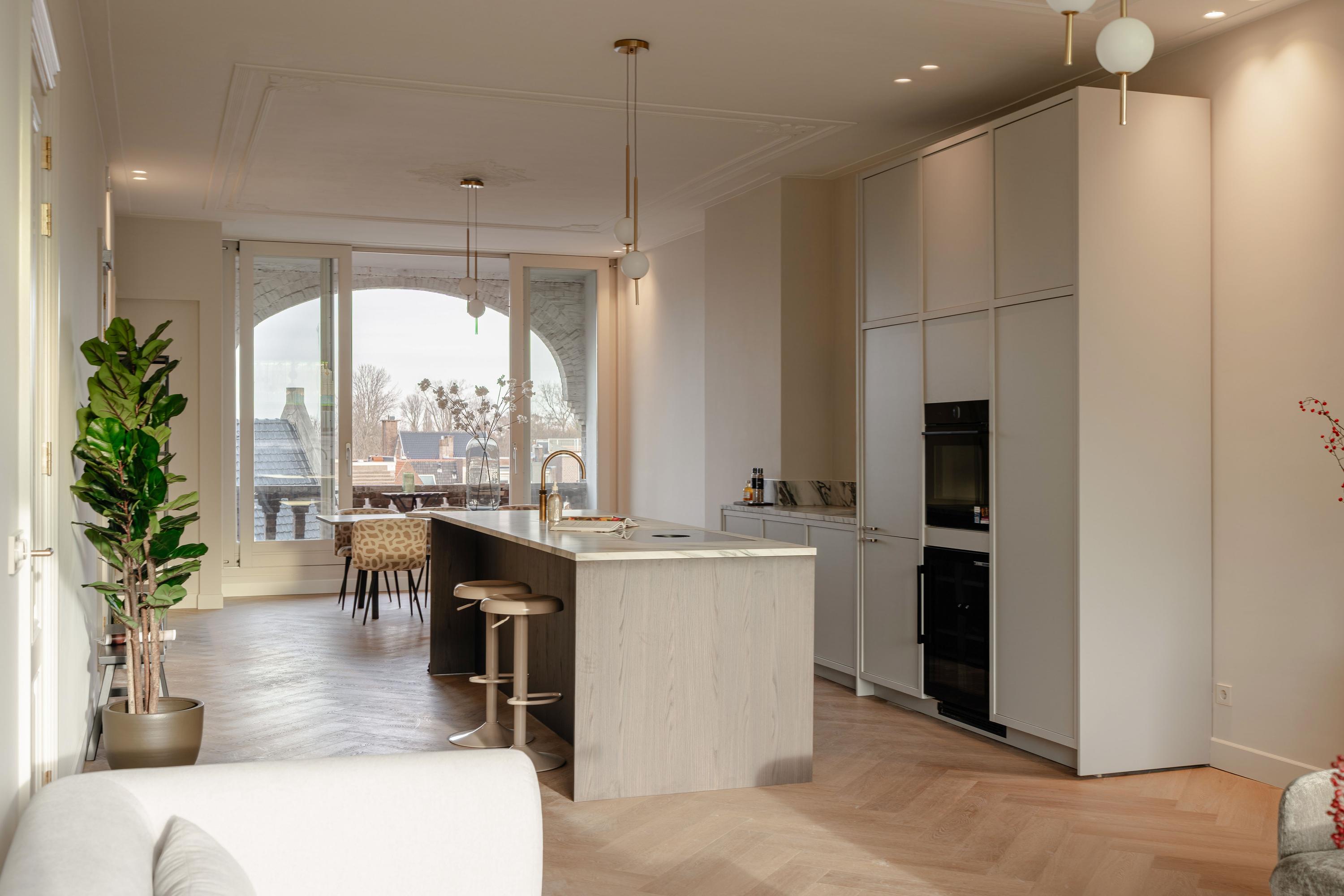 This luxurious apartment is located on the third floor and is characterised by a spacious and open layout, with large windows at both the front and rear providing pleasant natural light throughout the day. The apartment is finished to a high standard and offers a comfortable living environment with a calm and refined atmosphere. The living room is situated at the front of the apartment and features a ceiling height of approximately 3.07 metres. Together with the kitchen and dining area, it forms one generous open-plan living space. The luxurious kitchen is centrally positioned within the apartment and is designed around a spacious cooking and sink island, fitted with an induction hob, sink and Quooker. In addition, the kitchen is equipped with a refrigerator, freezer, combi oven, climate cabinet and ample cupboard space. The island also functions as a comfortable bar area. At the rear of the apartment is the covered balcony, offering attractive views over the green gardens at the back and providing a peaceful outdoor space to relax. At the front of the apartment, the hallway provides access to the first bedroom, the separate toilet, the laundry/storage room and the first bathroom. This bathroom is fitted with a walk-in shower and a double washbasin with vanity unit. The second bedroom is located at the rear of the apartment and features fixed wardrobe space and an en-suite bathroom, equipped with a walk-in shower and a washbasin with vanity unit.