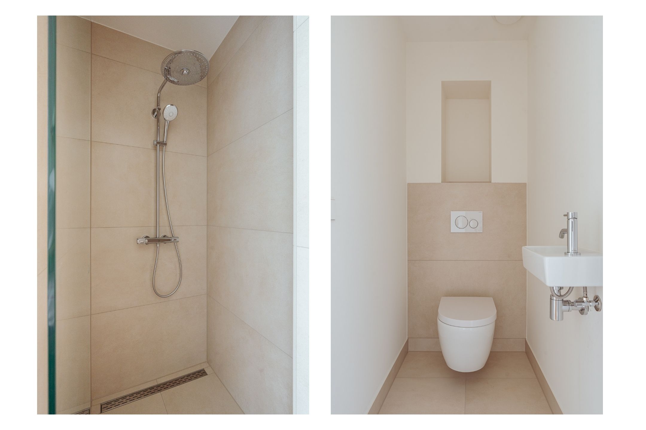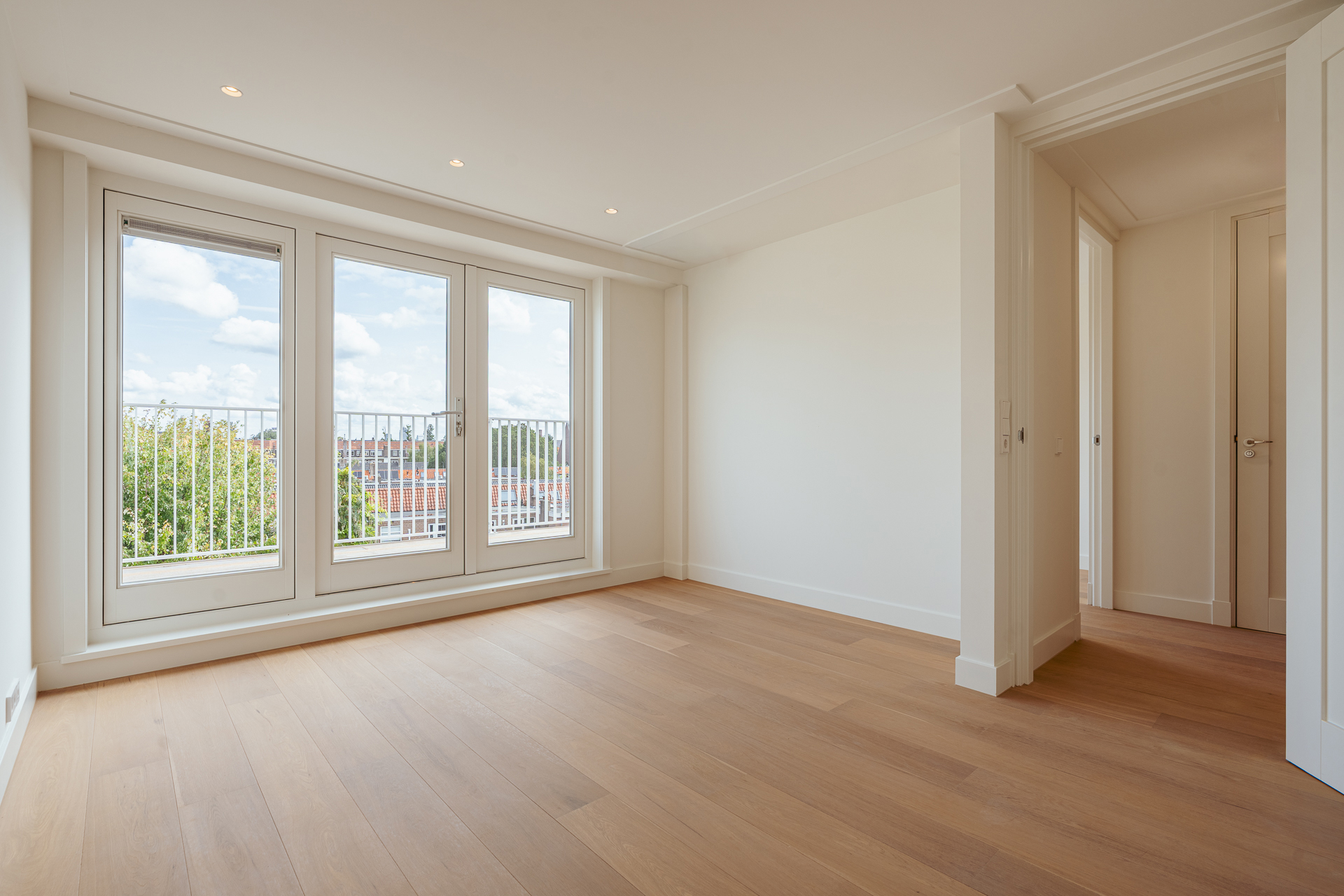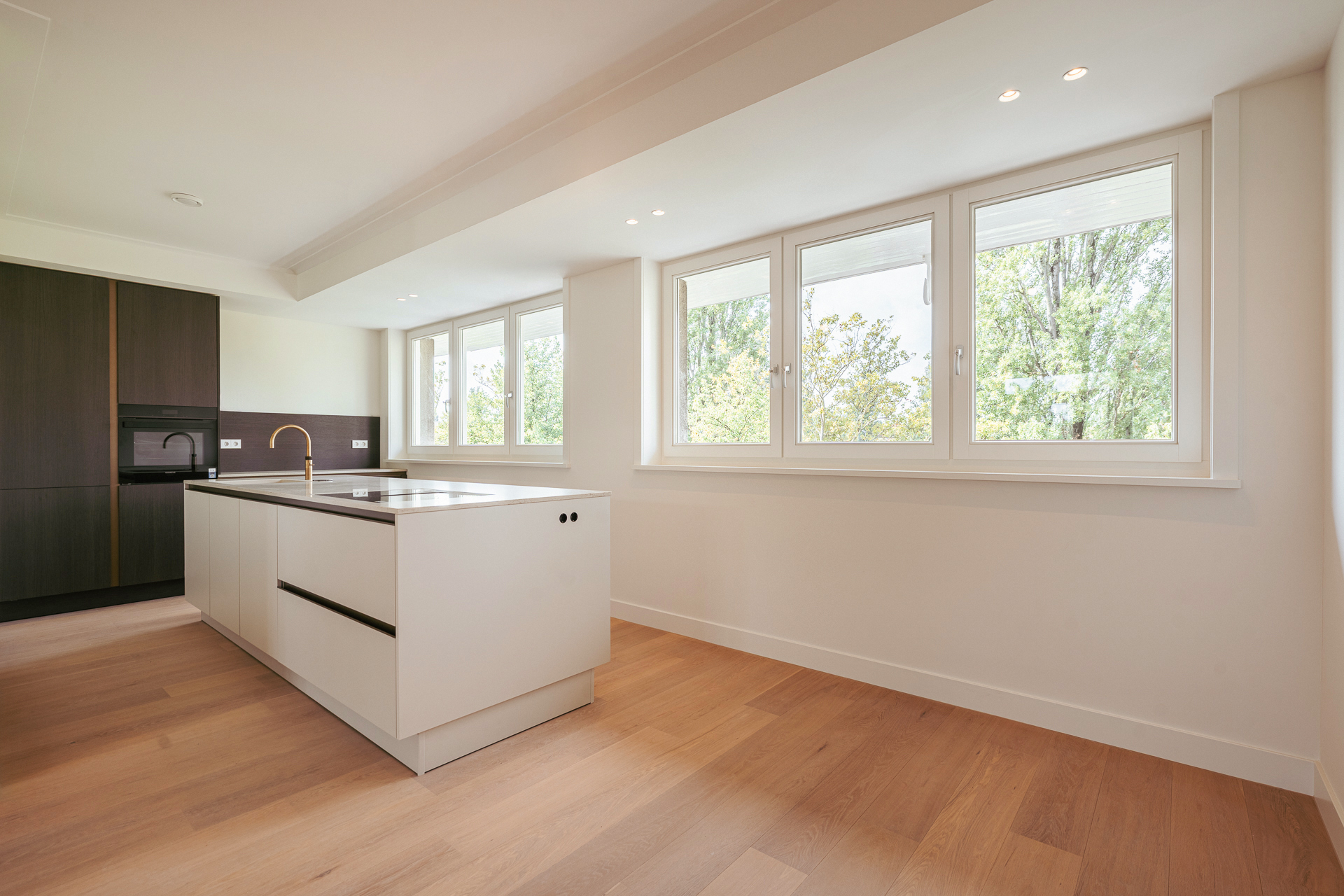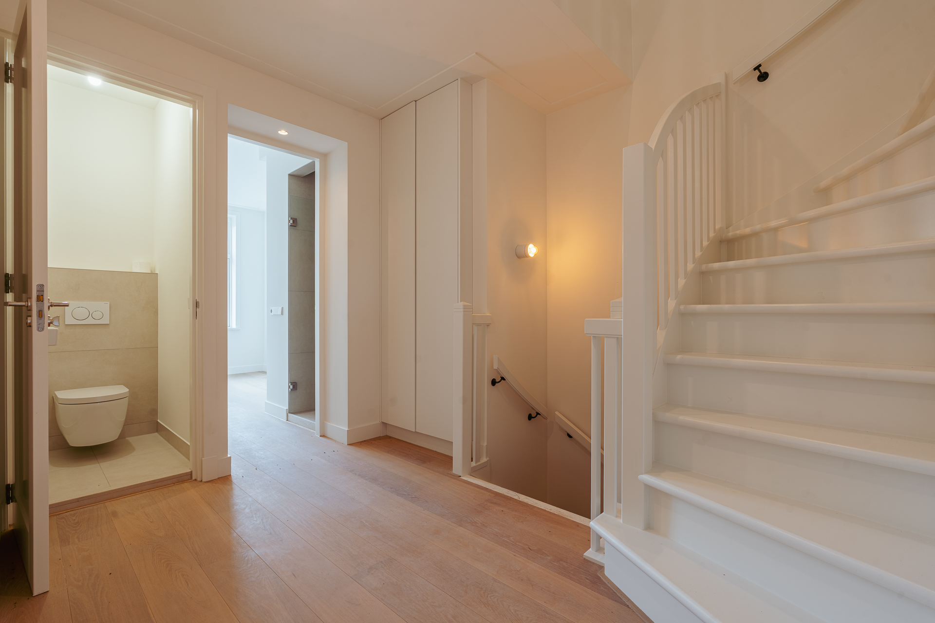 The open-plan kitchen is a true eye-catcher, fitted with high-quality built-in appliances: an induction hob with integrated extractor, dishwasher, combi-oven and Quooker tap. The combination of sleek handleless cabinetry and warm wooden accents gives this floor a modern yet inviting feel. From the living room you have access to a sunny southeast-facing balcony, perfect for a morning coffee or an afternoon drink in the sun.