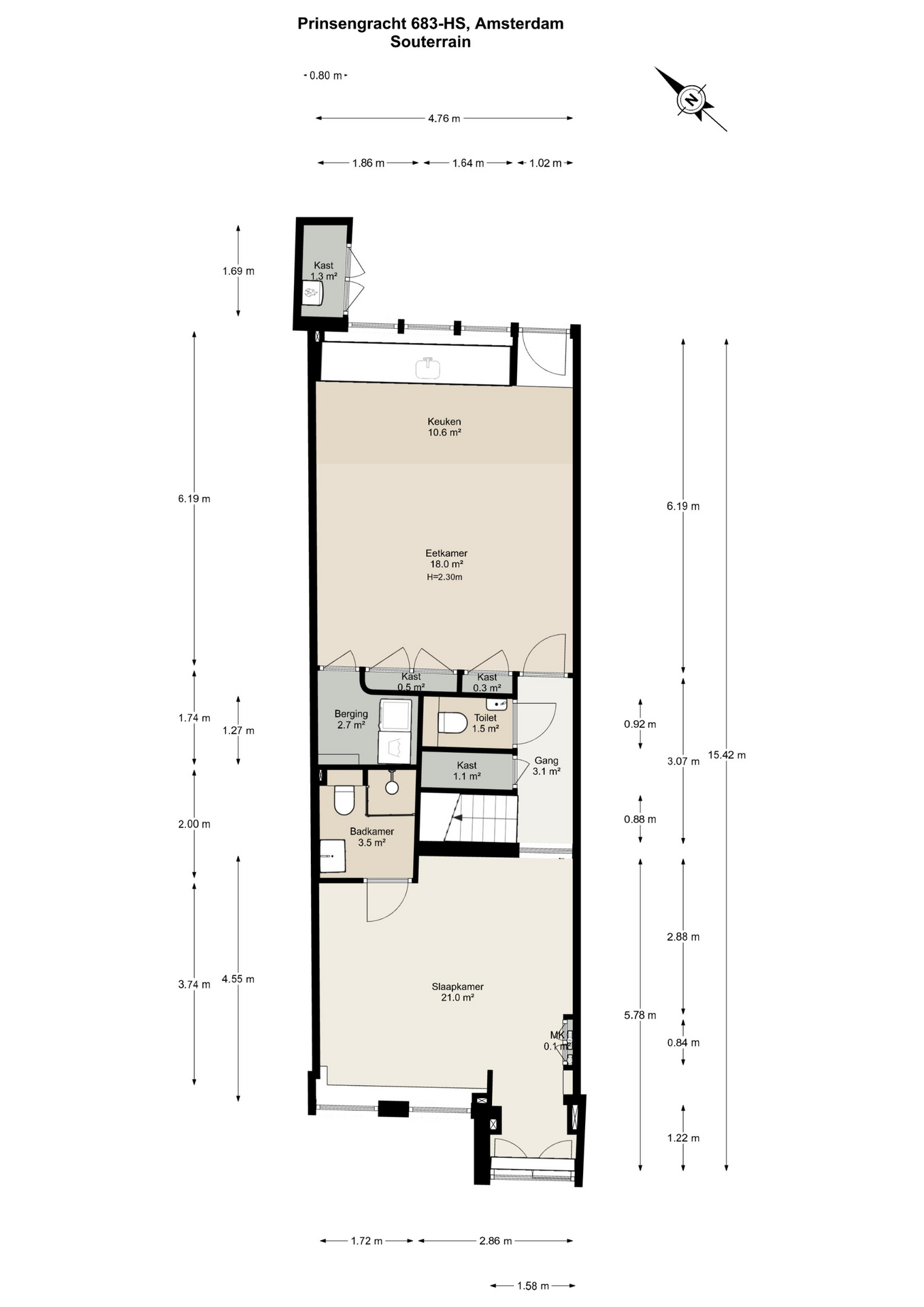 The basement is reached via the internal staircase and is spacious and functionally laid out. At the rear is the dining room with adjoining kitchen. The kitchen is located on the garden side and offers direct access to the deep rear garden, creating a pleasant connection between indoor and outdoor living. The kitchen is equipped with a Quooker, dishwasher, a freestanding gas stove with oven and a fridge-freezer combination. In addition, the kitchen features beautiful built-in wooden cabinets, ideal for extra storage space. From the kitchen there is access to a separate room with connections for a washing machine and dryer.