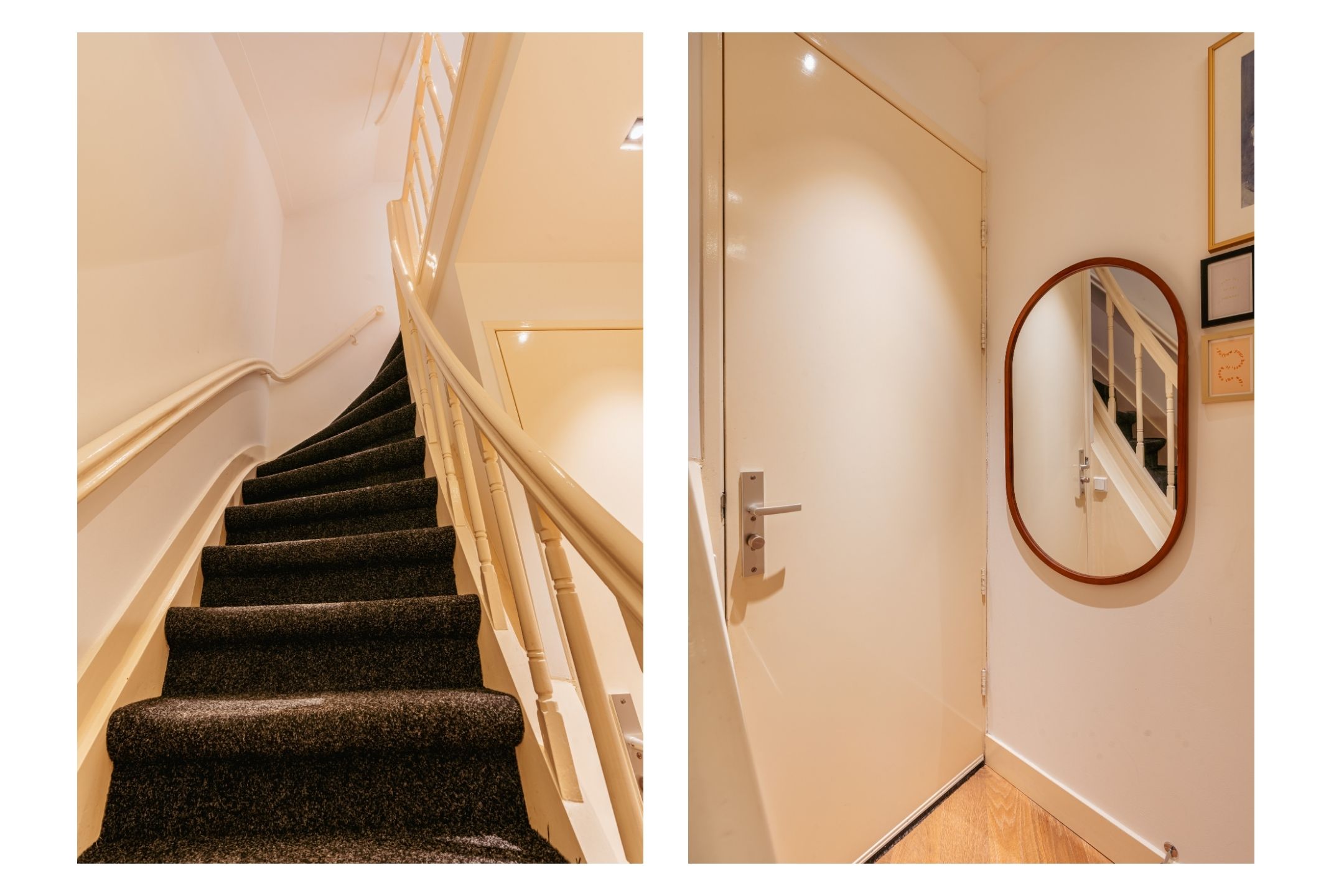 The private entrance on the second floor provides space for a wardrobe and a staircase leading to the upper floors. The hallway is bright and neatly finished, offering a warm welcome as soon as you step inside.