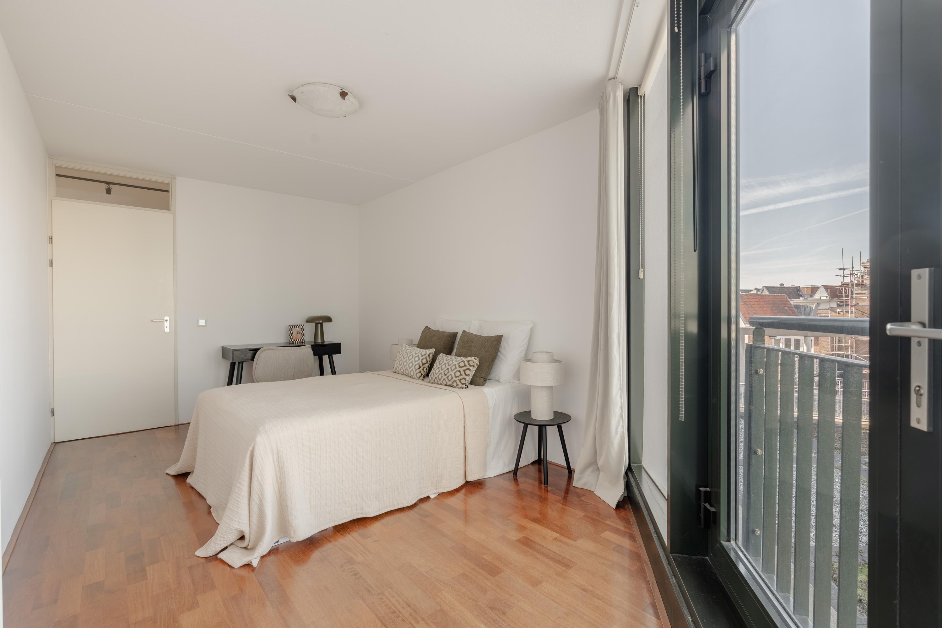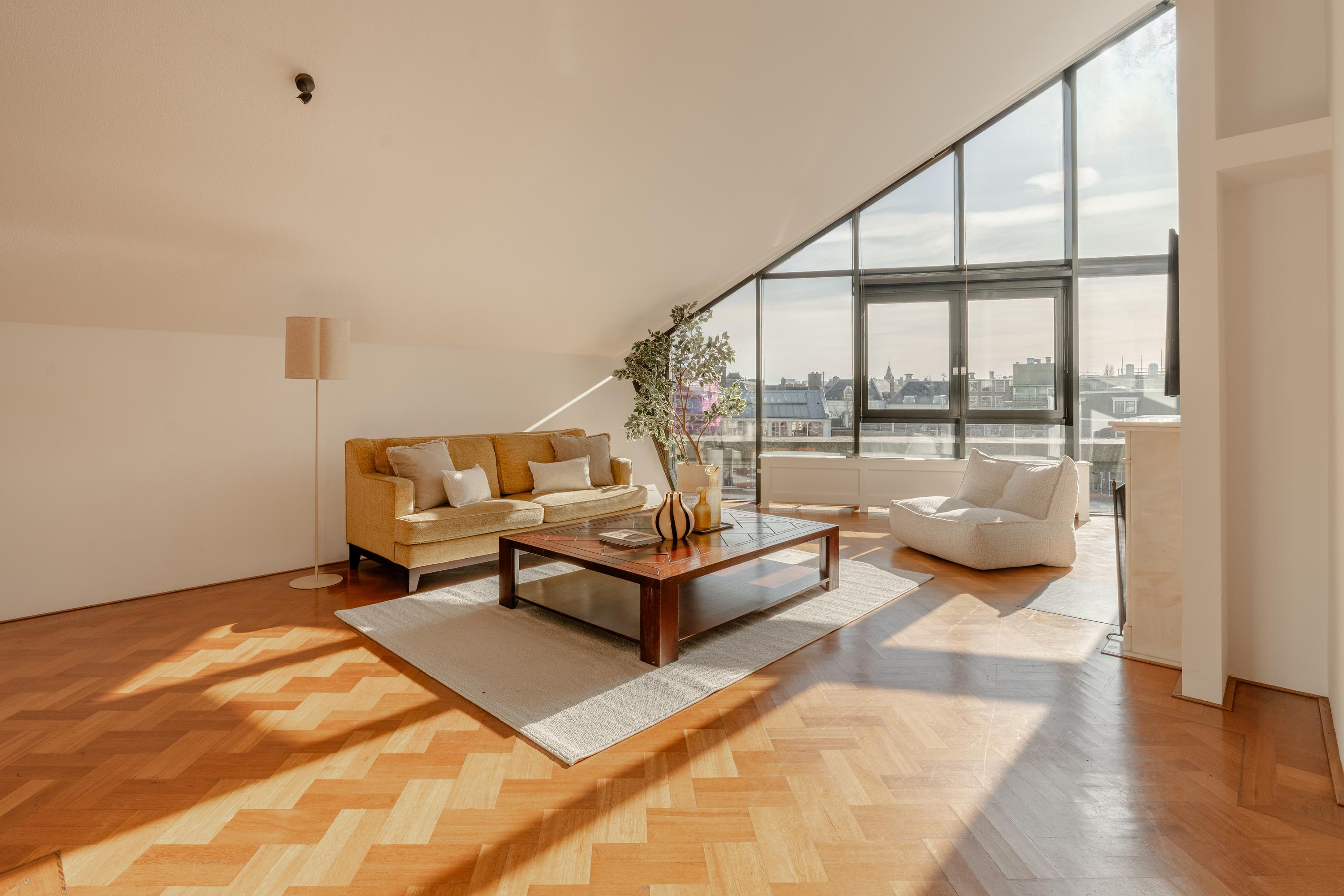 The apartment’s living level occupies the top floor, where large windows and generous ceiling heights invite daylight to animate the interiors. The living room opens to far-reaching views across the Singel and the city’s celebrated Flower Market, setting an atmosphere of refined urban calm. A half-open kitchen, complete with built-in appliances and an adjacent storage area, seamlessly connects to the dining space, ideal for gathering and entertaining.