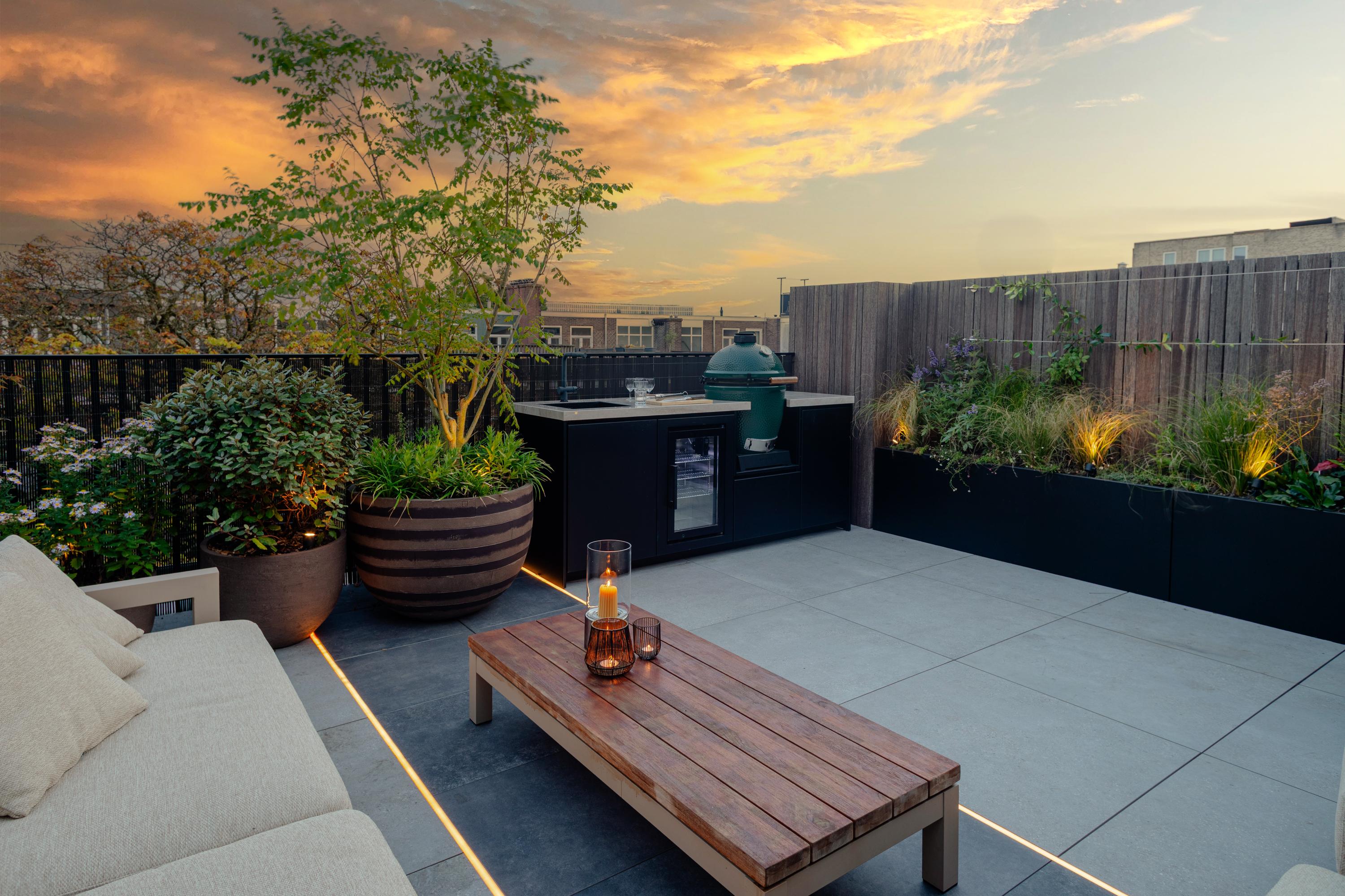 Designed by garden architect Erik van Gelder, the roof terrace is a rare and unique outdoor space in the city. Here, you can enjoy outdoor living in complete privacy. Equipped with an outdoor kitchen and a Green Egg barbecue, it is the ultimate setting for summer evenings spent enjoying drinks, dining and barbecuing with family and friends. The terrace also features an integrated irrigation system and elegant lighting.