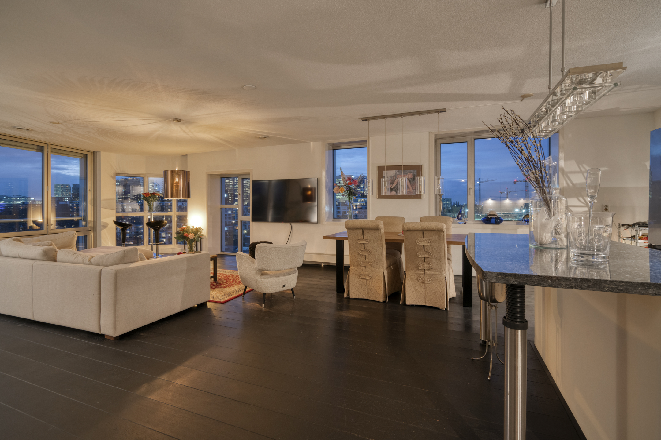 Luxurious three-room corner apartment of 117 m² with unobstructed views of the water and the Zuidas skyline, featuring two bedrooms, a high-end kitchen with cooking island, and an optional private parking space. The apartment is located on the seventh floor of the striking Gelderhof apartment complex, completed in 2004.