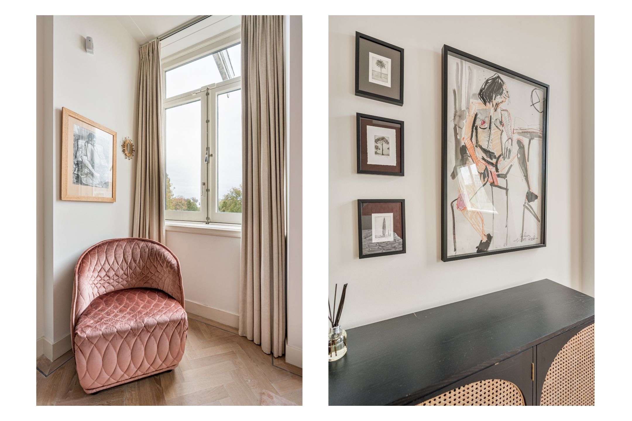 De grote raampartijen aan zowel de voor- als achterzijde van de woning zorgen voor een overvloed aan licht en een open, uitnodigende sfeer. Aan de voorzijde heeft u een uniek uitzicht over het groen van het Vondelpark, terwijl u aan de achterzijde uitkijkt over de weelderige binnentuinen. Elk seizoen kleurt het uitzicht anders en geeft de woning een nieuw karakter. Het ruime balkon en het dakterras bieden volop zon en privacy ,de ideale plekken om buiten te ontbijten, te ontspannen met een boek of te genieten van lange, zwoele zomeravonden met uitzicht over de stad.