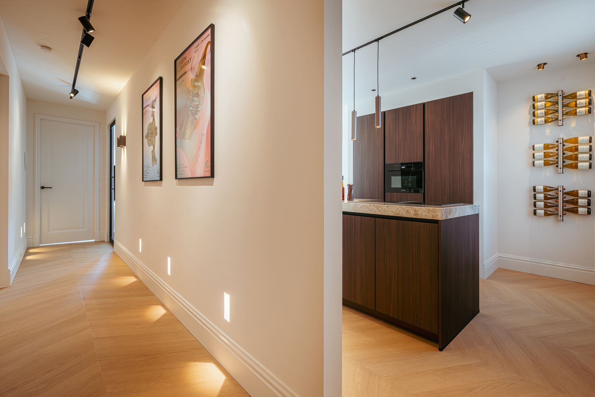 Via the communal staircase, you reach the entrance to the property on the third floor. From your private entrance, a neatly renovated staircase leads up to the apartment on the fourth floor. Upon entering, you immediately notice the warm and stylish ambiance, thanks to carefully chosen materials, atmospheric lighting, and impeccable finishes. The apartment has been renovated to a high and luxurious standard, with great attention to detail. Modern black steel doors combined with classic elements give the home a contemporary yet timeless feel, something that runs consistently throughout the property.