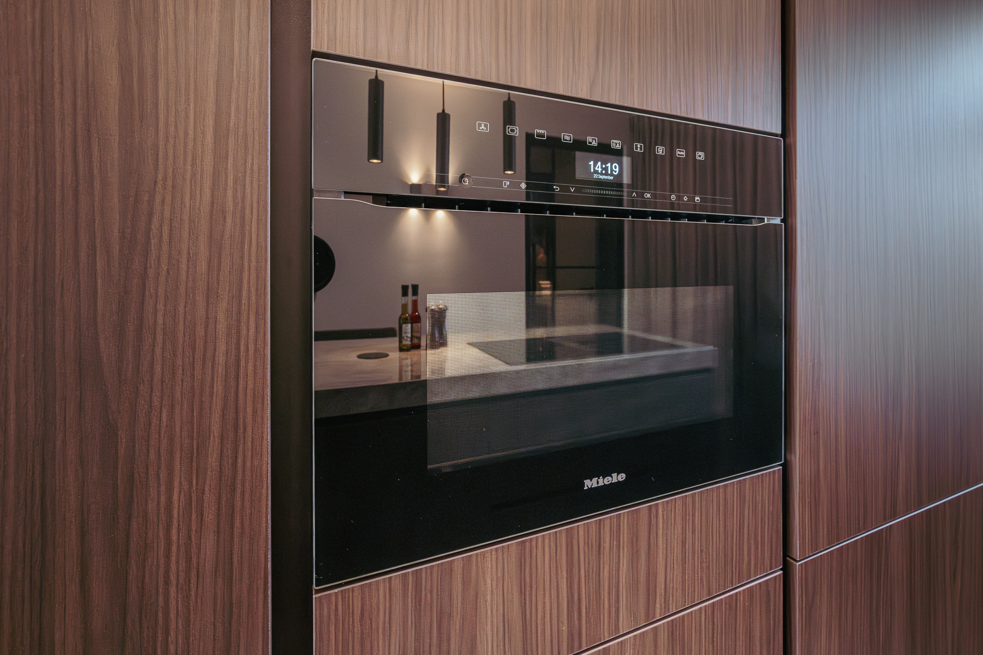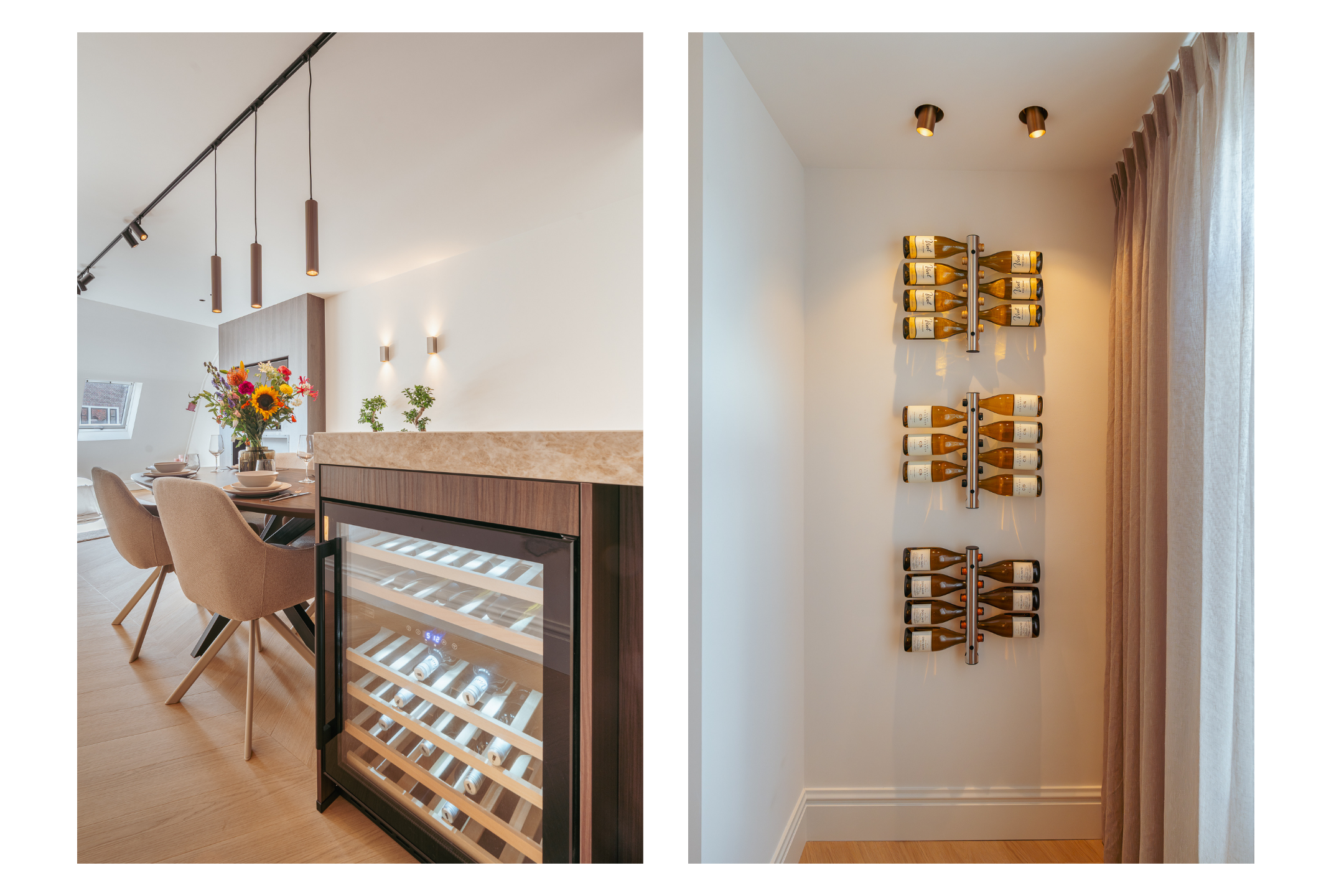 On the top floor, you enter through a sleek integrated sliding door into a beautiful, spacious hallway that provides access to all rooms. The heart of the home is the open-plan living and dining area, which spans the entire length of the apartment. With windows on both sides, the space is flooded with natural light. At the front is the sitting area, complete with a cozy bio-ethanol fireplace stylishly integrated into a built-in cabinet with TV. At the rear lies the modern open kitchen with a cooking island. Finished with a Dekton countertop, the kitchen is equipped with every luxury appliance imaginable, including a wine cooler, Quooker tap, dishwasher, fridge/freezer, Miele combi-oven, and a Miele induction hob with integrated extraction system. The bar section of the island also makes this a sociable spot to cook together or enjoy a glass of wine with family and friends.