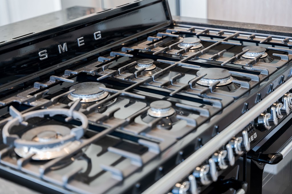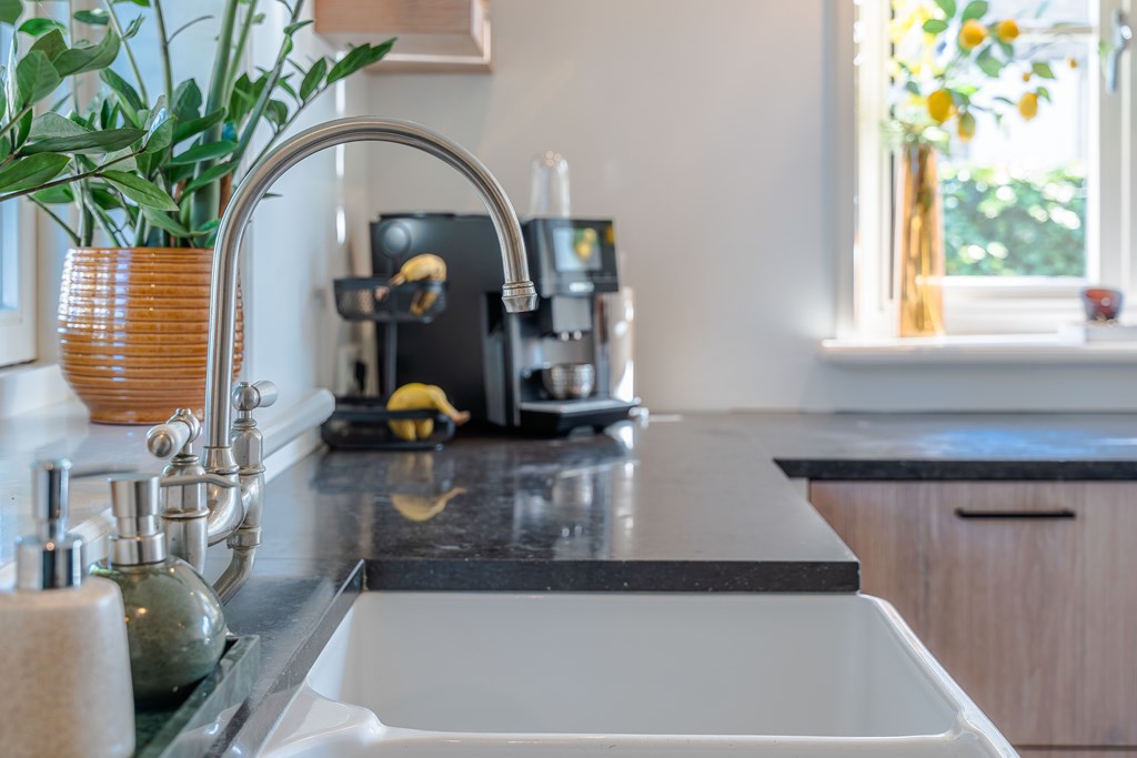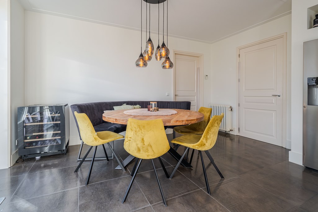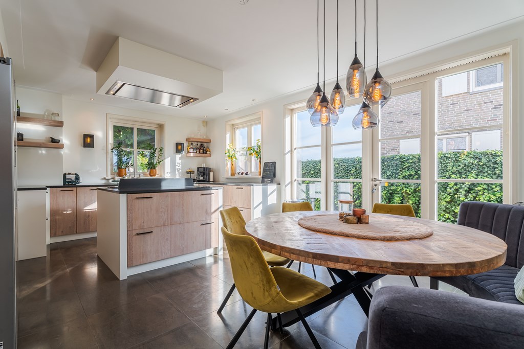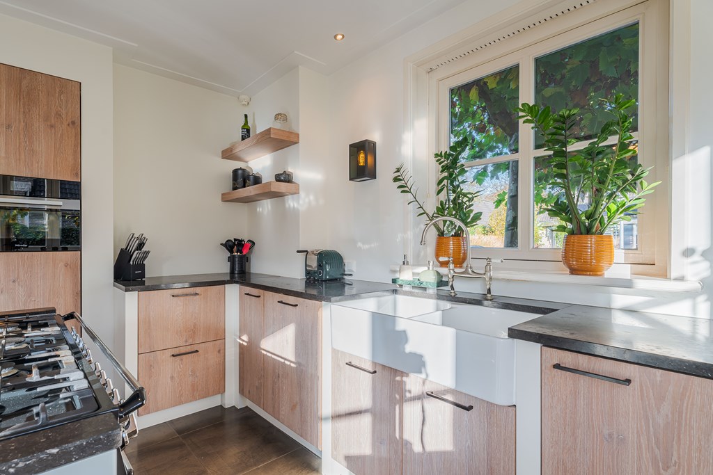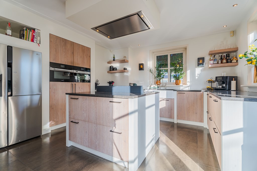 De gezellige leefkeuken is geplaatst in een hoekopstelling met kastenwand en kookeiland. De keuken is voorzien van een tegelvloer, 7-pits gasfornuis met diverse oven (SMEG), een afzuigkap, een dubbele gootsteen, een combi oven (Miele), een combi stoomoven (Miele) en diverse kastruimte en lades. Verder heeft de keuken een gezellige eethoek en heeft u middels openslaande tuindeuren toegang tot de zij tuin. Door de grote raampartijen is er ook in de leefkeuken veel natuurlijke daglichttoetreding.