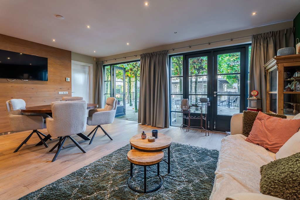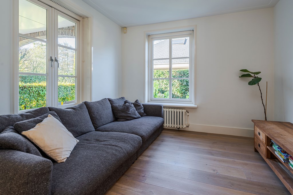 De living is onderverdeeld in een eetkamer, woonkamer en zitkamer. Opvallend zijn de grote en hoge raampartijen waardoor er veel natuurlijke daglichttoetreding in de woning is. De living is voorzien van een parketvloer, inbouwverlichting en een mooie gashaard met schouw. Er zijn maar liefst 3 openslaande tuindeuren waardoor u hier het absolute binnen-buiten gevoel kunt ervaren. De stijlvolle trapopgang is centraal geplaatst met uittreders richting zowel de woonkamer als eetkamer.