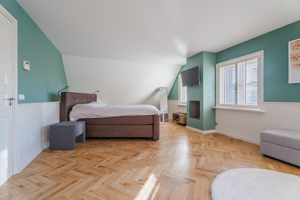 Slaapkamer 5 is gelegen aan de achterzijde van de woning. Deze kamer is gecompartimenteerd in twee ruimtes waardoor je als het ware een leef en slaapgedeelte hebt.