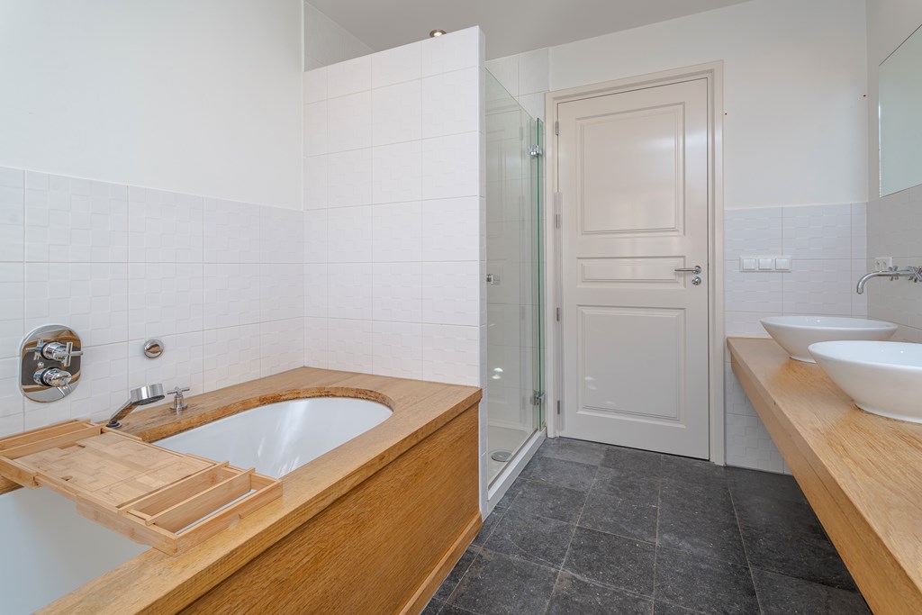 Deze badkamer is voorzien van een vloertegels, deels betegelde wanden, een fijne inloopdouche, twee wastafels met meubel, een wandcloset, inbouwverlichting en mechanische afzuiging.