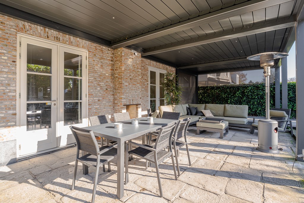 Dit is dé ideale tuin voor iedereen die van zowel het buitenleven als luxe en comfort houdt. Tegen de achtergevels is een mooie veranda geplaatst met open haard, verlichting en elektra. Deze open veranda is als het ware een schakel tussen de woonkamer en de tuin.