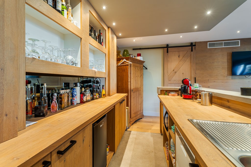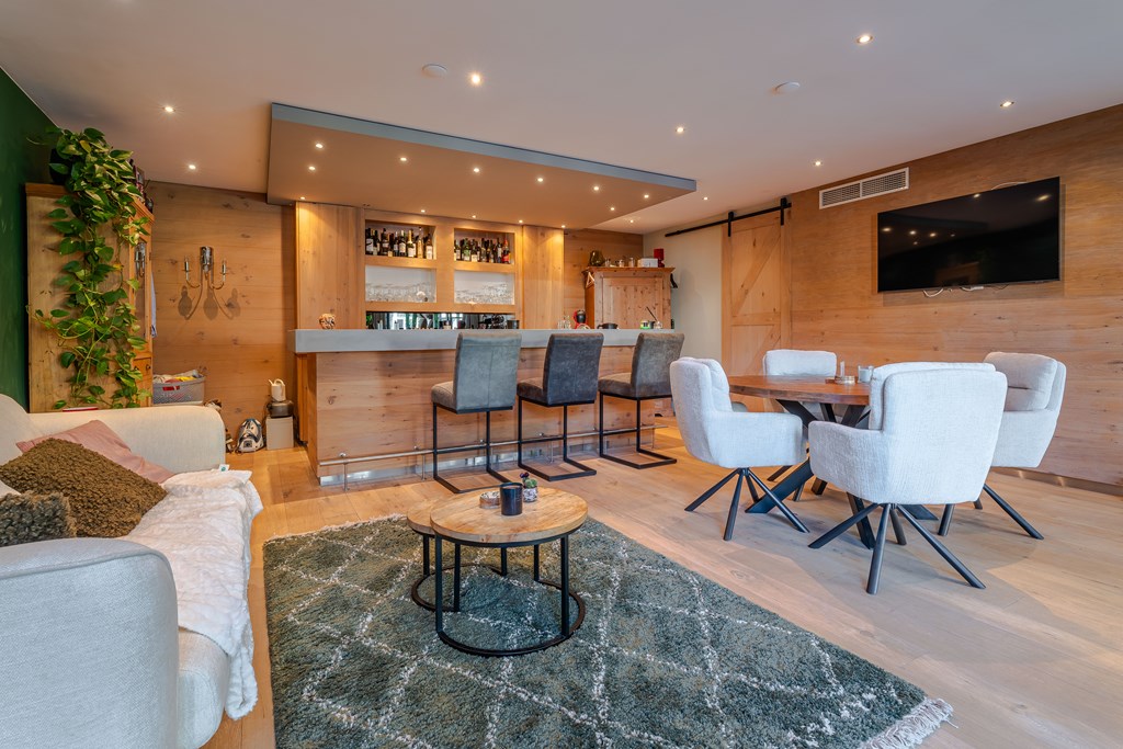 De absolute parel van deze tuin is de bijzonder luxe poolhouse. Dit bijgebouw is werkelijk van alle gemakken voorzien. Zo is er een prachtige leefruimte met een gezellige bar, een derde badkamer met inloopdouche en dubbele wastafel met meubel, een toiletruimte en een technische ruimte t.b.v. de zwembadinstallatie.