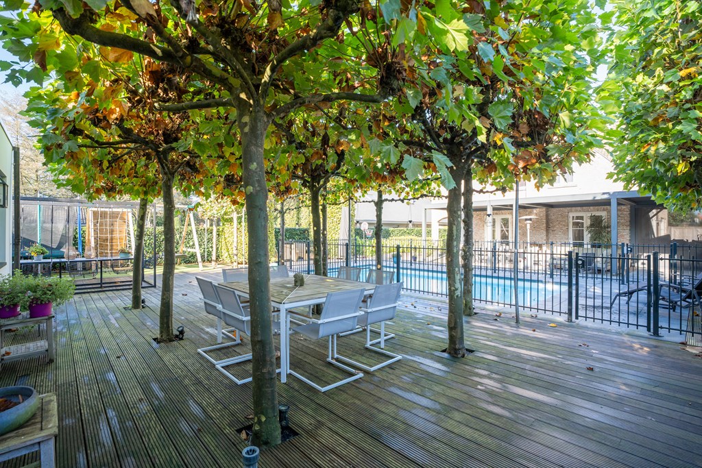 In het midden van de tuin ligt een verwarmd zwembad (Starline) met een elektrisch bedienbaar afdekscherm en verlichting. Het daaromheen geplaatste hekwerk kan relatief simpel verwijderd worden.