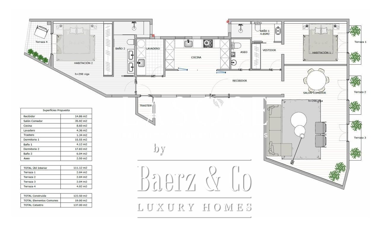 Two double bedrooms provide generous retreat, the primary suite enhanced by an integrated gallery, drawing in warmth and natural light. There are two full bathrooms complemented by a guest toilet, and thoughtful touches including wardrobes, laundry, and washing room elevate daily comfort. The apartment includes a terrace and is conveniently accessed by an elevator.