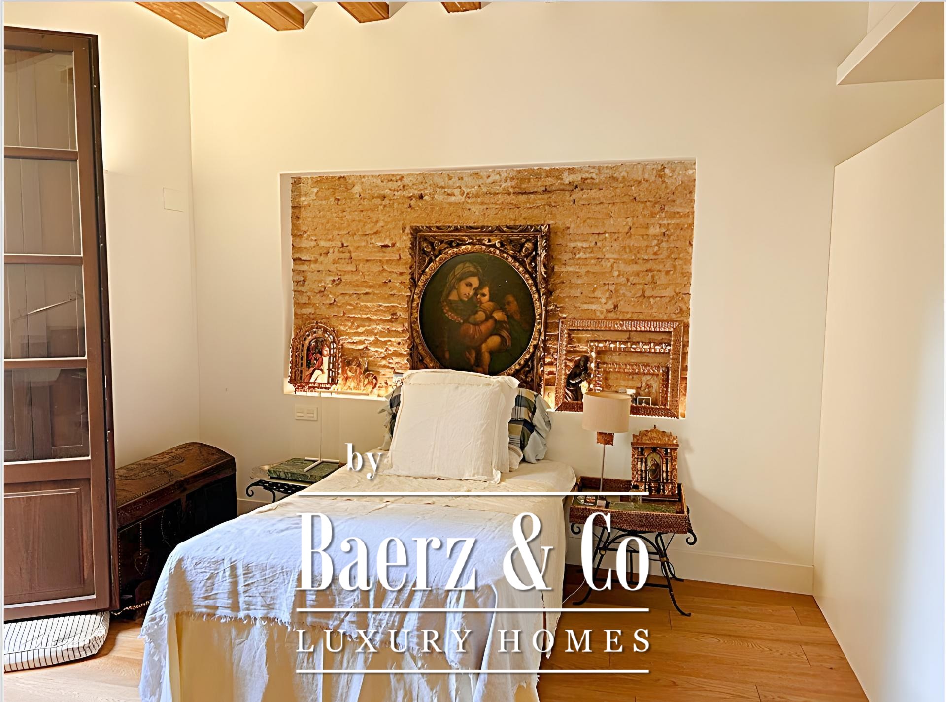 The semi-open kitchen, designed with poise, features a striking section of Barcelona’s ancient Roman wall, immediately instilling a sense of place and heritage. In the private quarters, two sunlit exterior bedrooms open to a southwest balcony, including a master suite with dedicated dressing space and an en suite bathroom. A second sophisticated bathroom provides further comfort.
