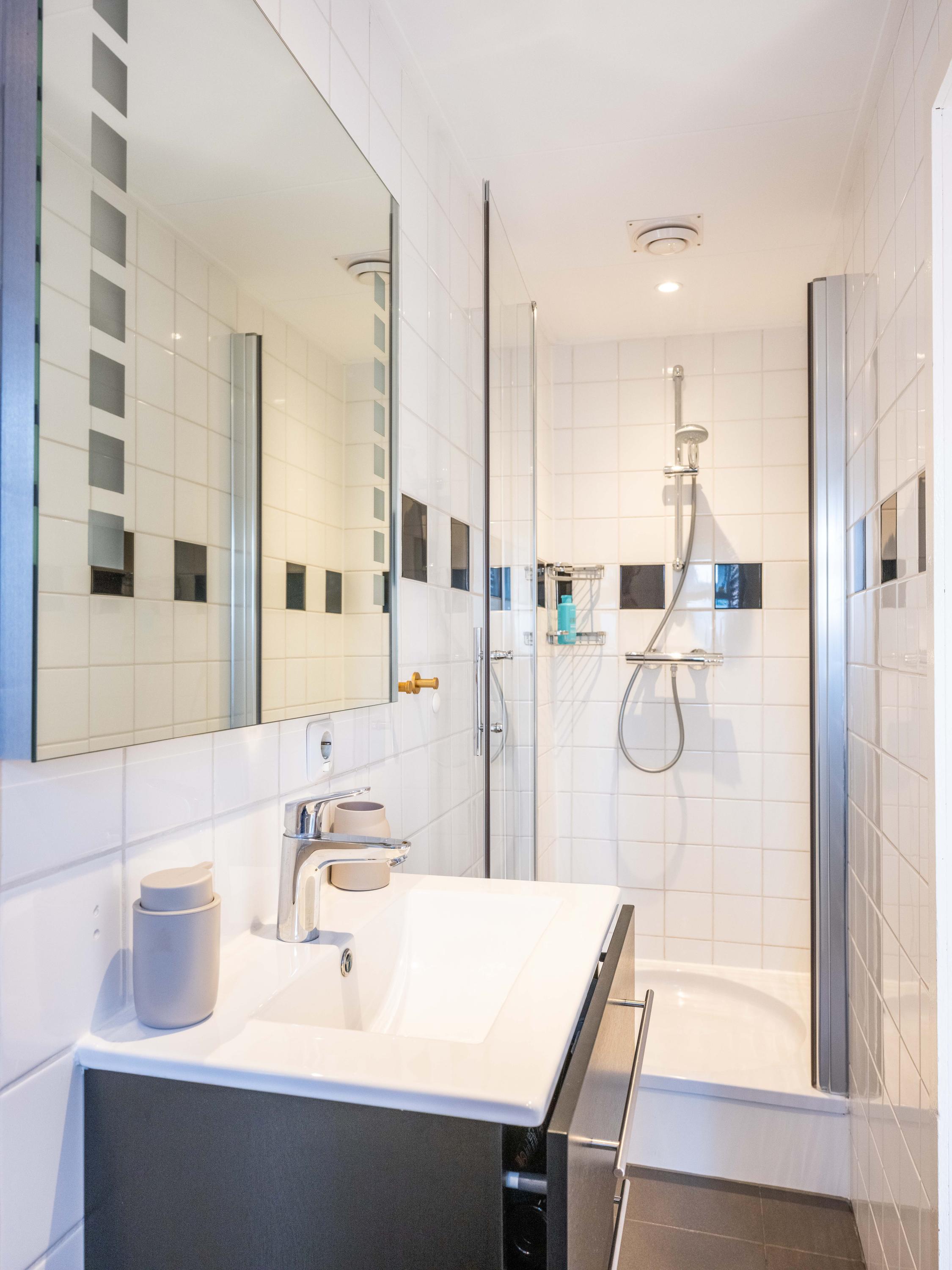 The apartment has two bedrooms, which can optionally be connected via a sliding door. The bathroom is compact and equipped with a shower, toilet, and vanity unit. In addition, the apartment has a sunny roof terrace – a unique place to enjoy the outdoors in peace and privacy.