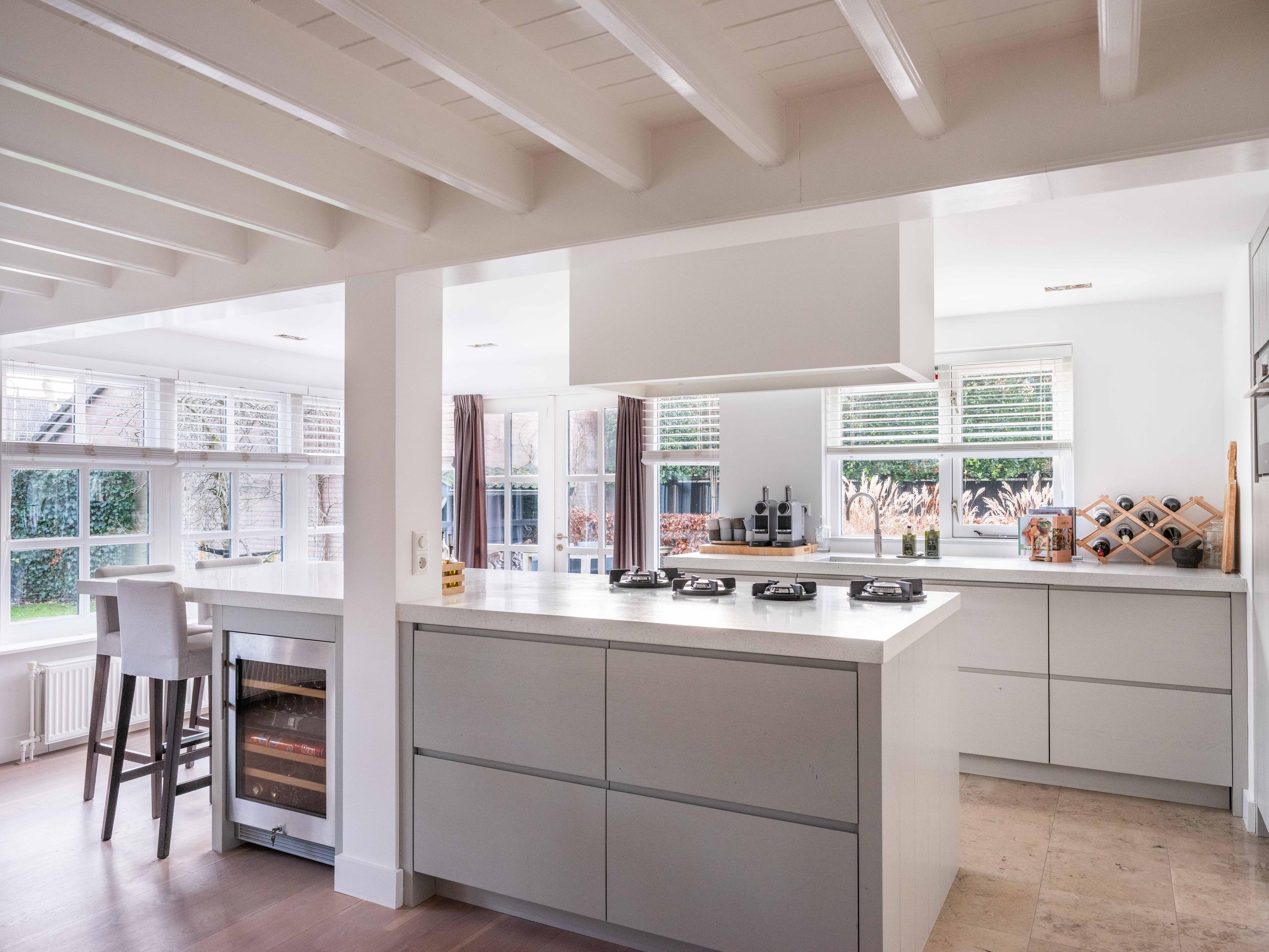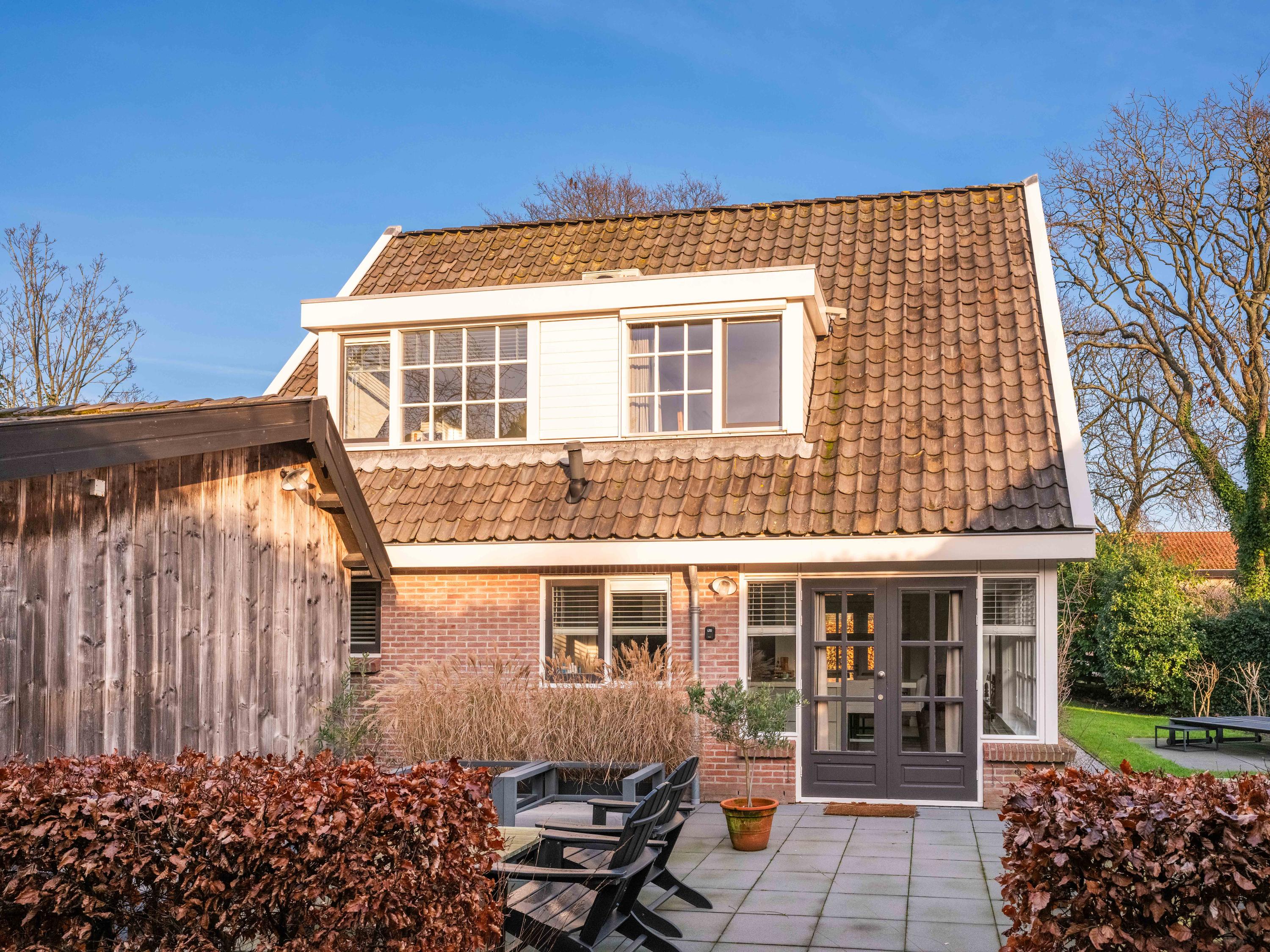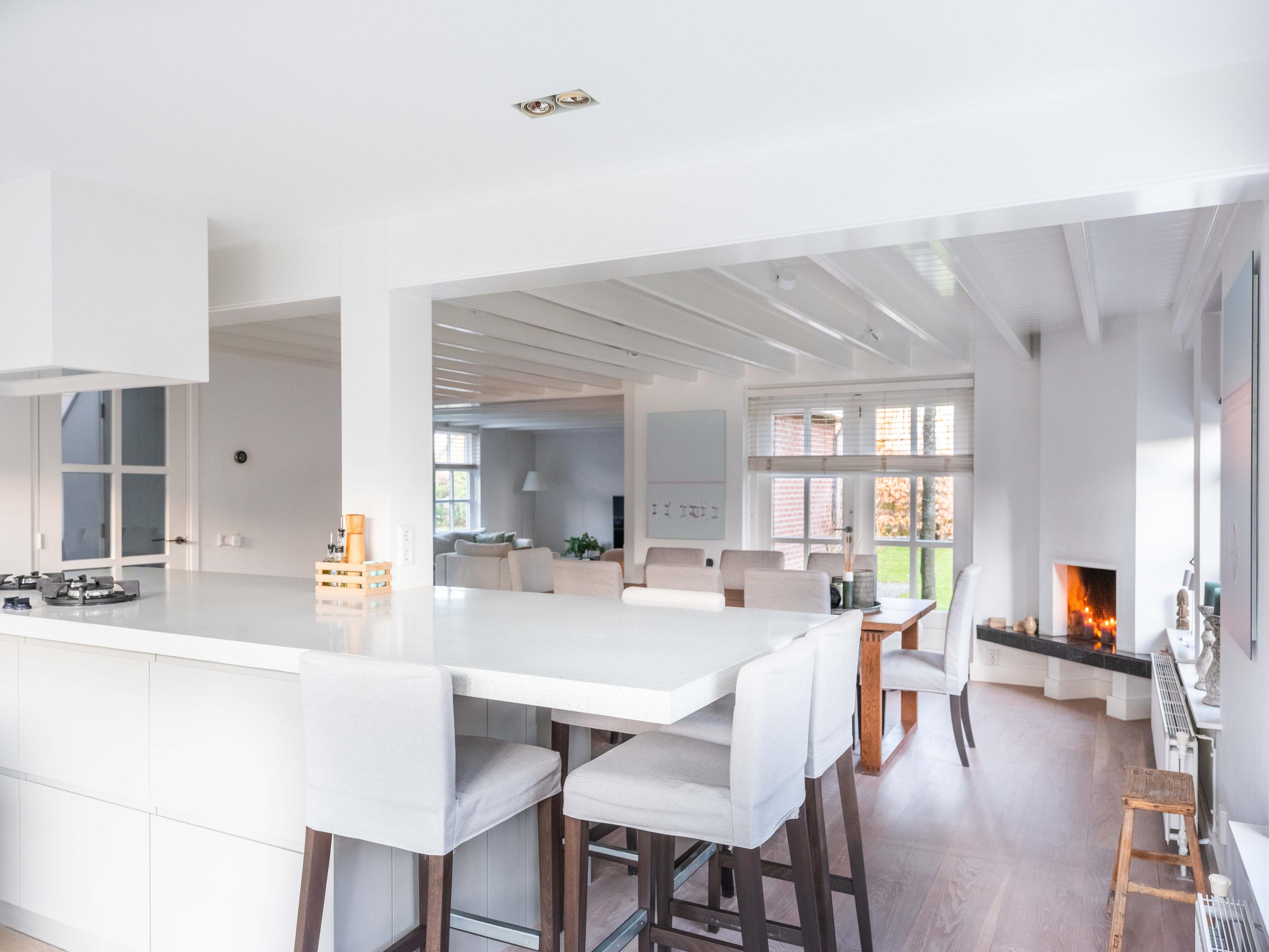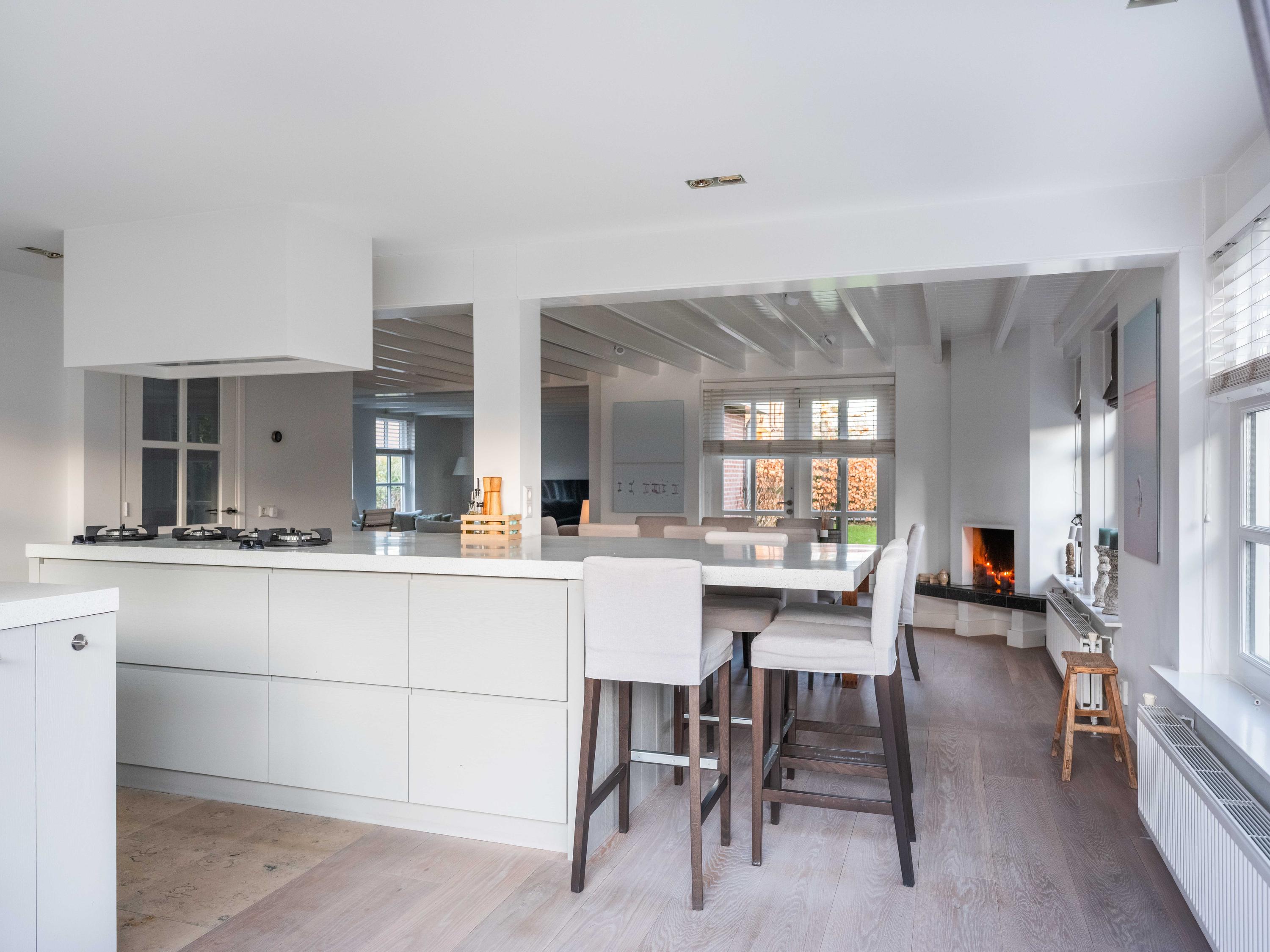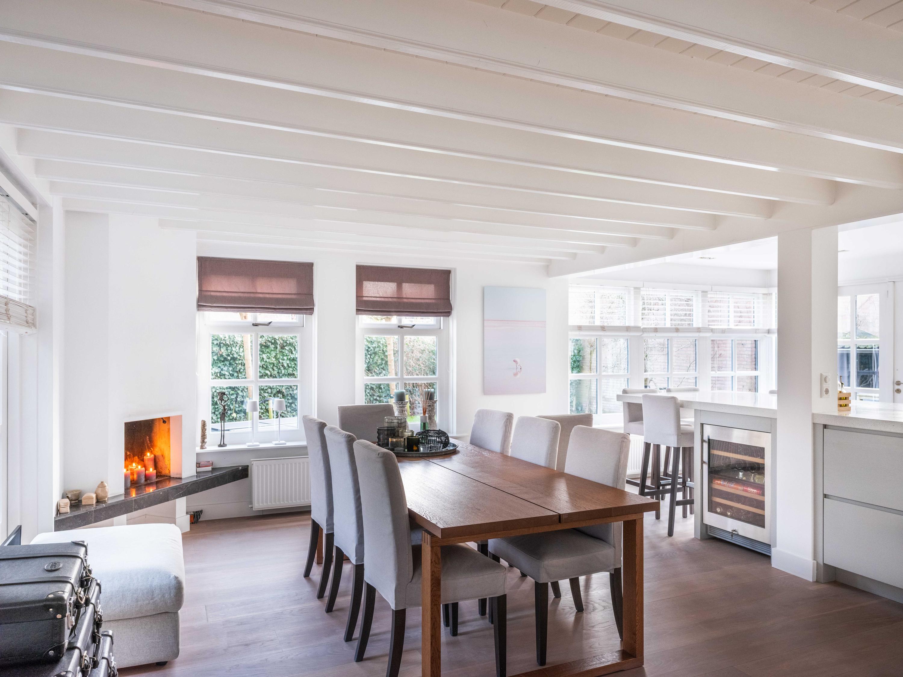 Upon entering, you immediately notice the pleasant atmosphere. The spacious hall with staircase and modern toilet provides access to the practical utility room and leads further to the dining room with fireplace. From here, double garden doors open onto the beautifully landscaped garden, allowing the indoors and outdoors to flow effortlessly into one another. The living room connects seamlessly to the designer kitchen by Piet Jan van den Kommer—a real eye-catcher that perfectly matches the country style of the house. The wooden floors and beamed ceilings enhance the feeling of warmth and character.