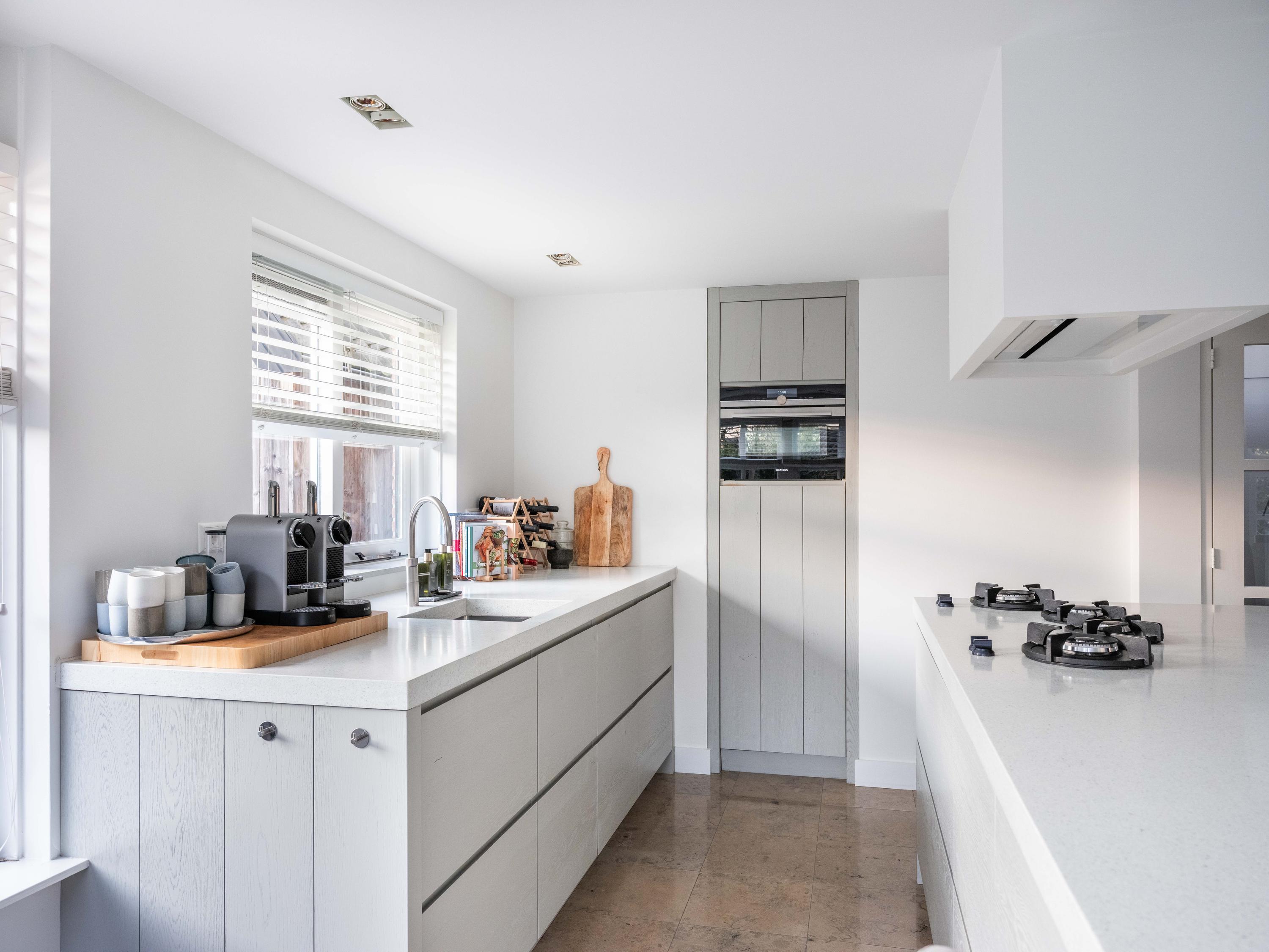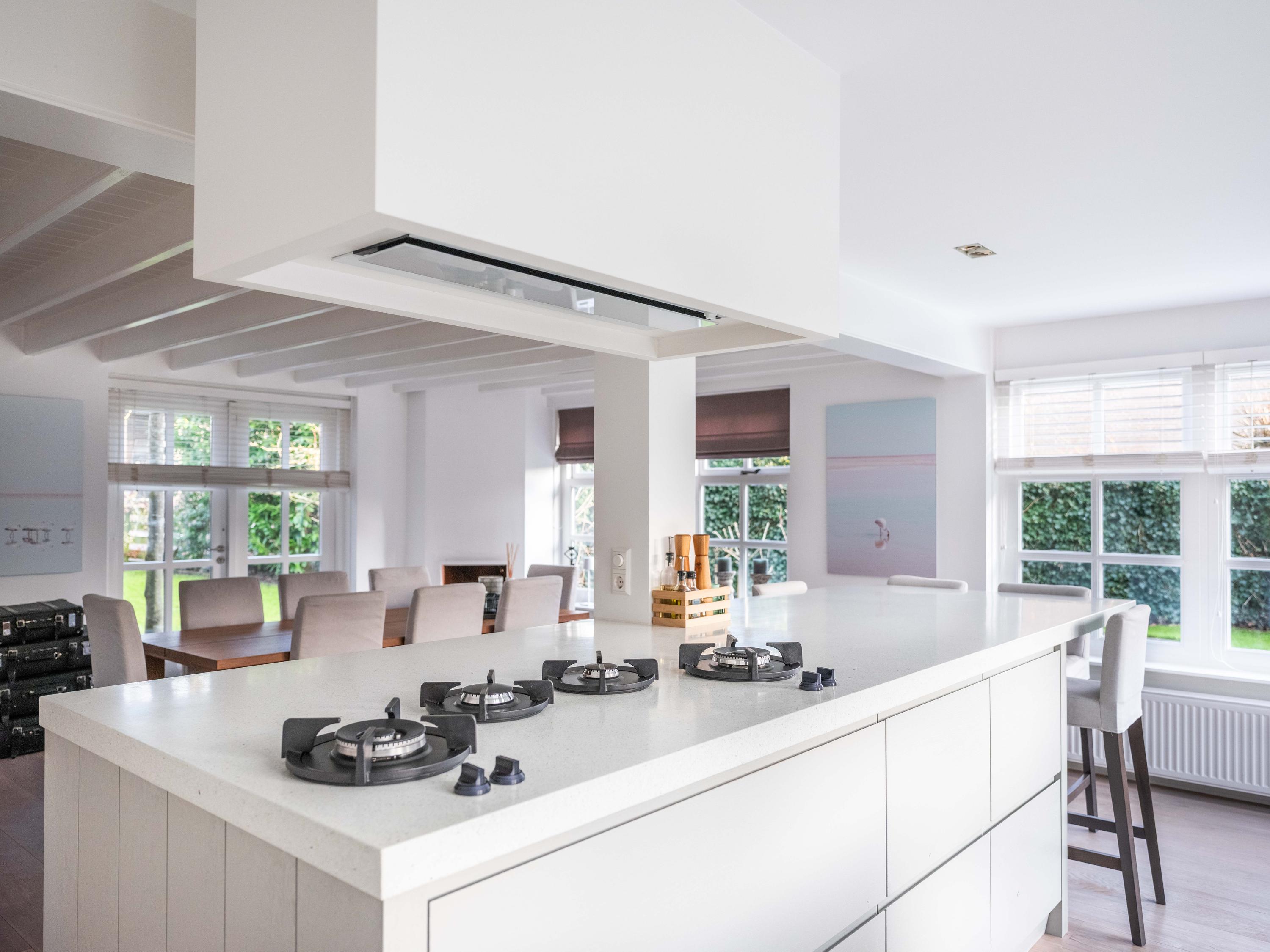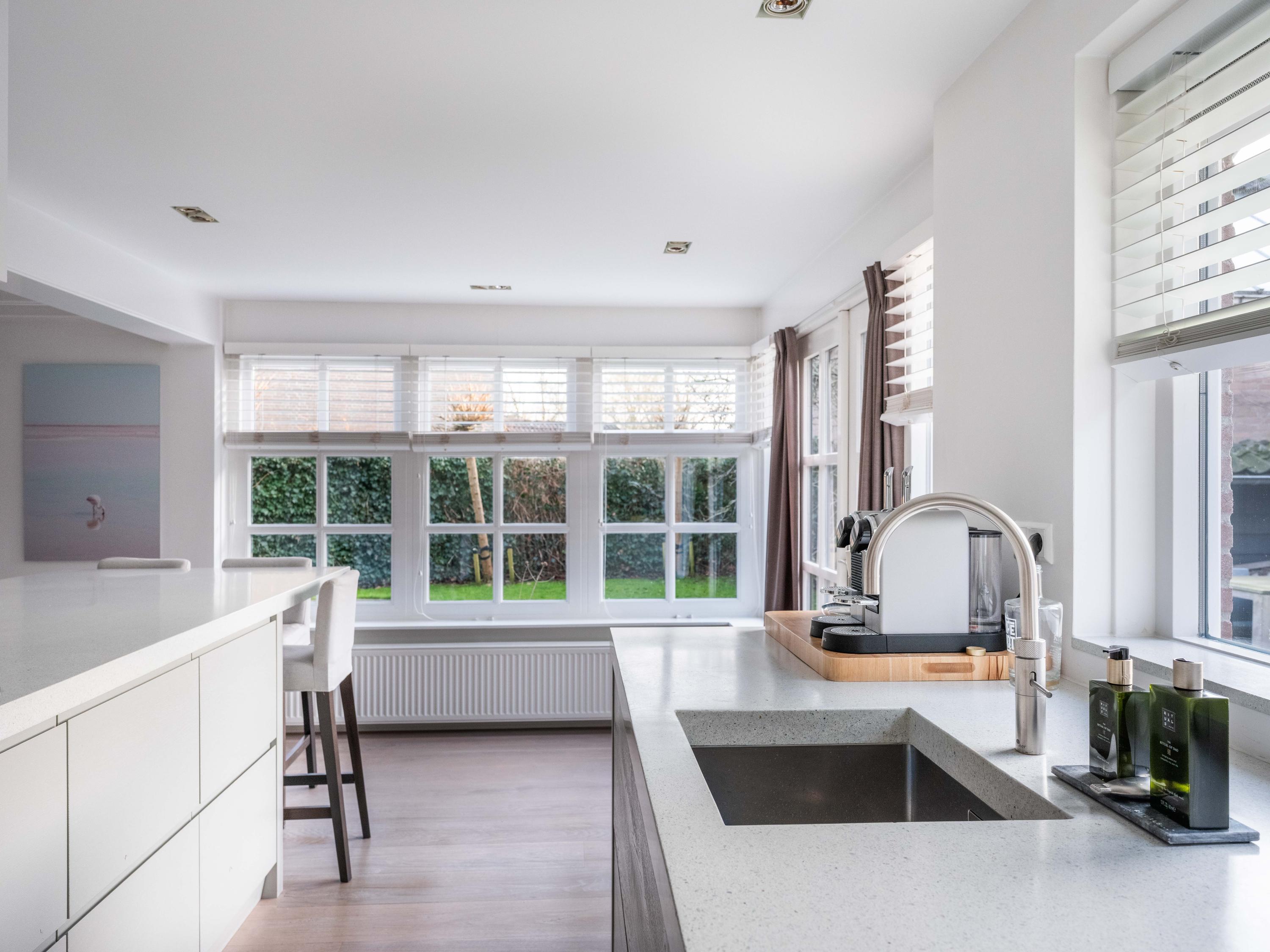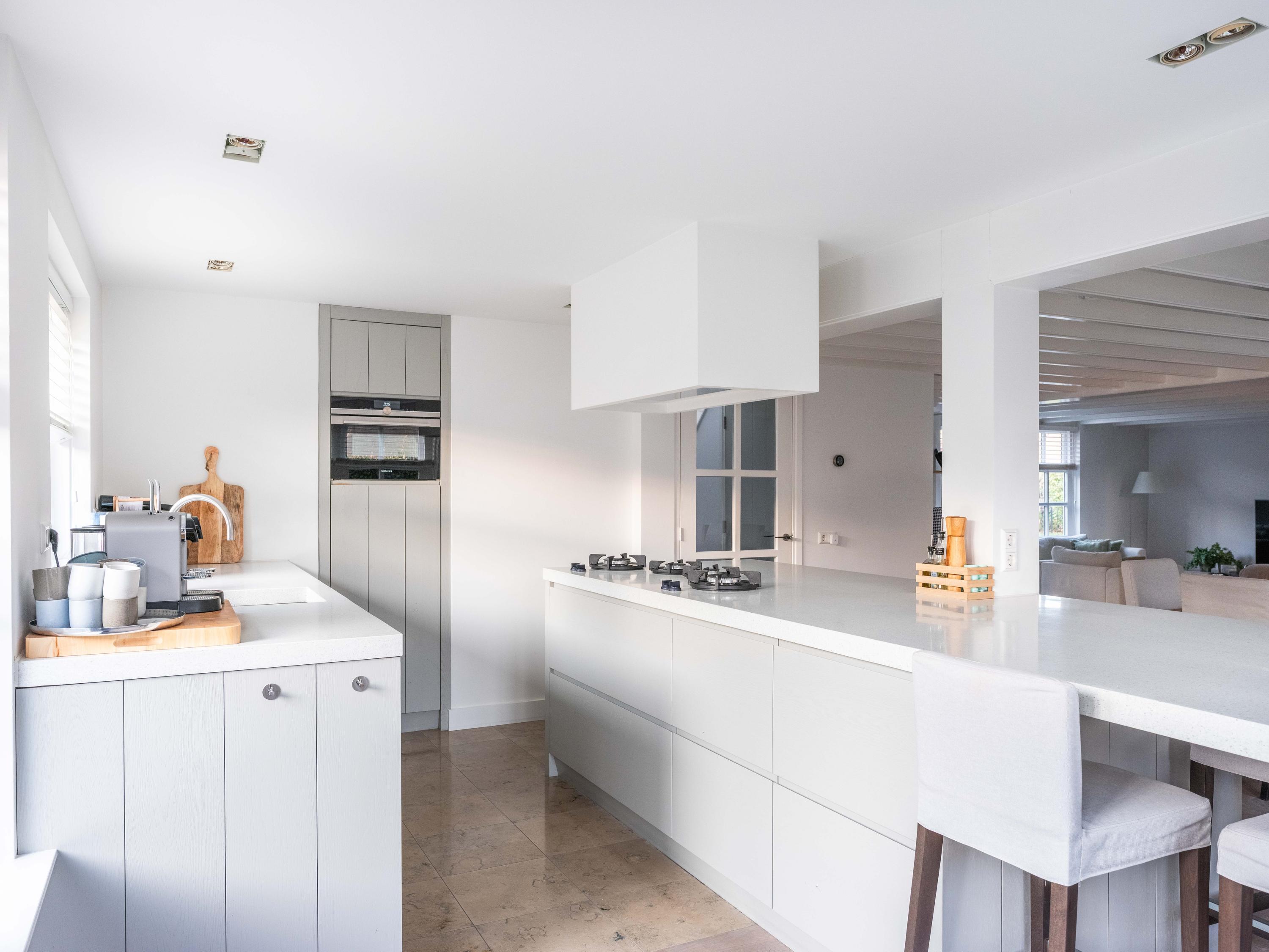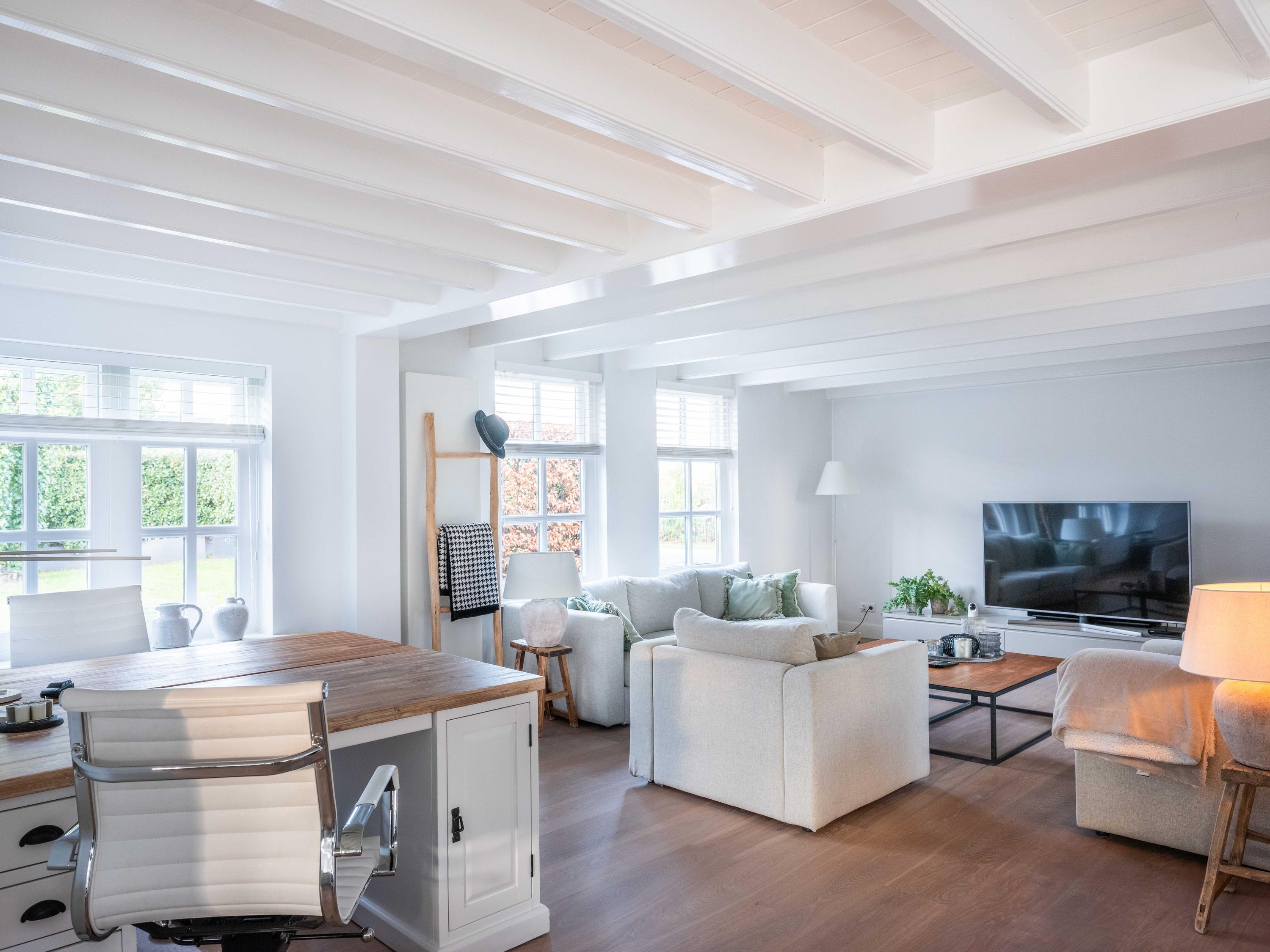Upon entering, you immediately notice the pleasant atmosphere. The spacious hall with staircase and modern toilet provides access to the practical utility room and leads further to the dining room with fireplace. From here, double garden doors open onto the beautifully landscaped garden, allowing the indoors and outdoors to flow effortlessly into one another. The living room connects seamlessly to the designer kitchen by Piet Jan van den Kommer—a real eye-catcher that perfectly matches the country style of the house. The wooden floors and beamed ceilings enhance the feeling of warmth and character.