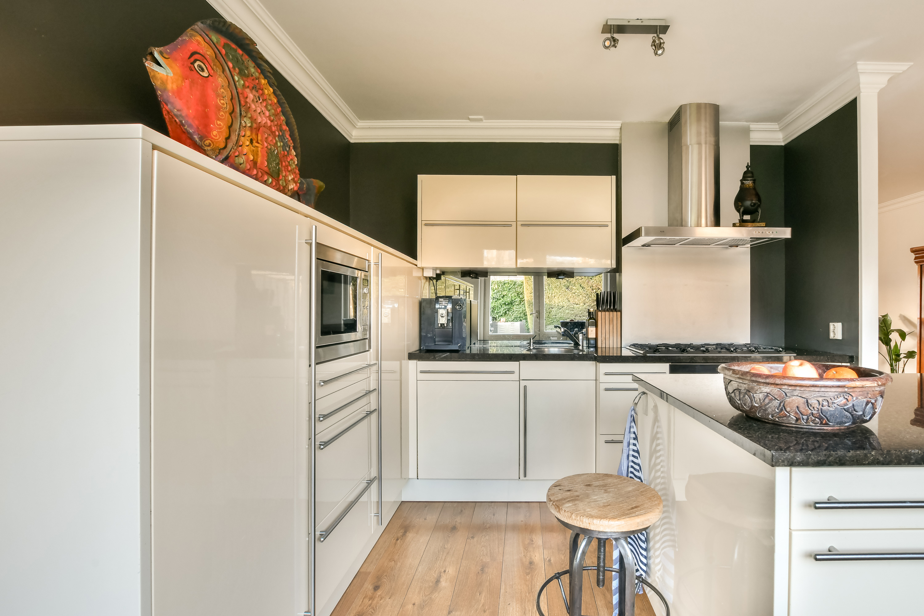 De open leefkeuken bevindt zich aan de achterzijde en is uitgerust met diverse inbouwapparatuur, waaronder een gasfornuis, afzuigkap, magnetron, oven, vaatwasser en koelkast.