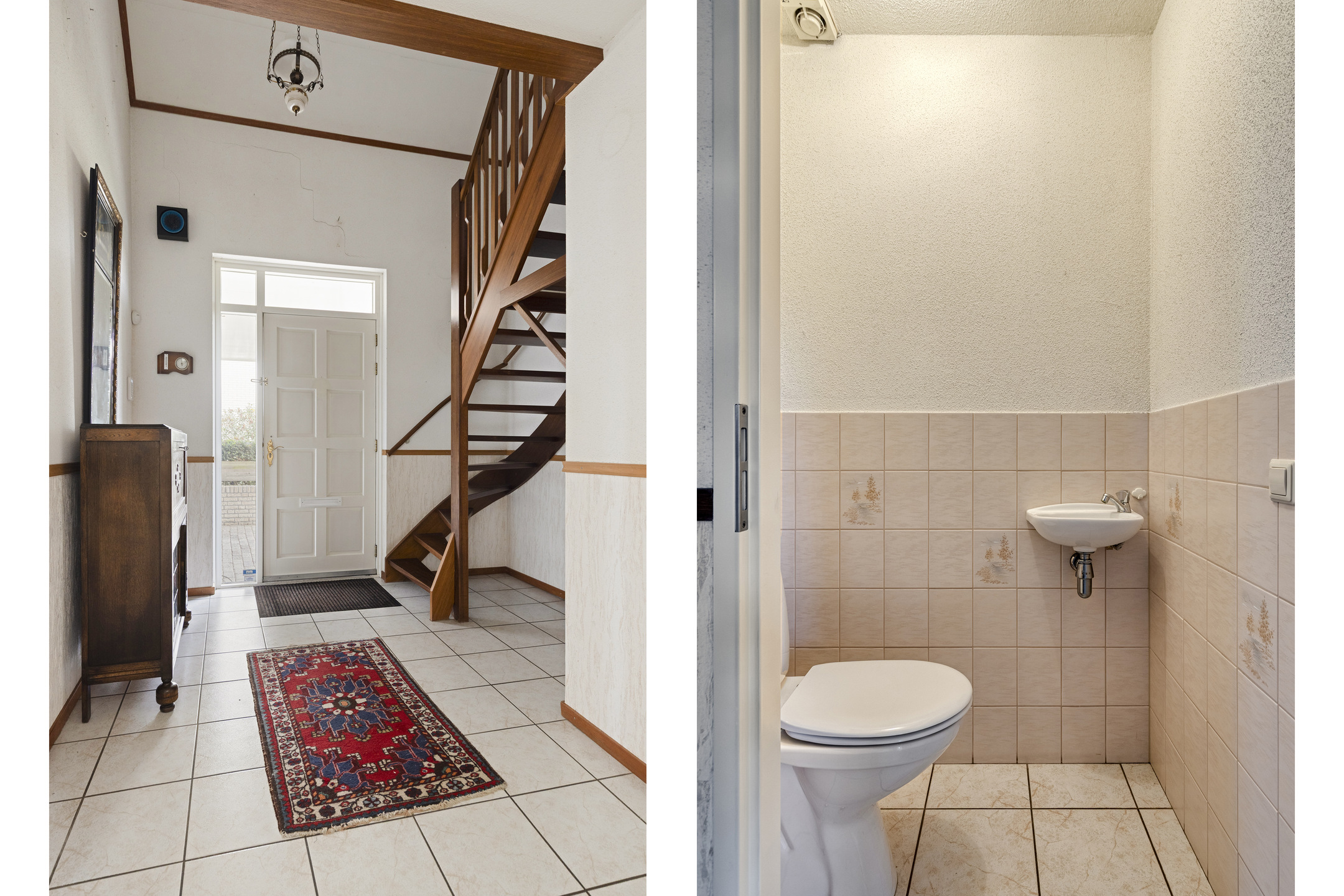 Entrance hall with toilet, staircase to the first floor, and access to the living room and kitchen.