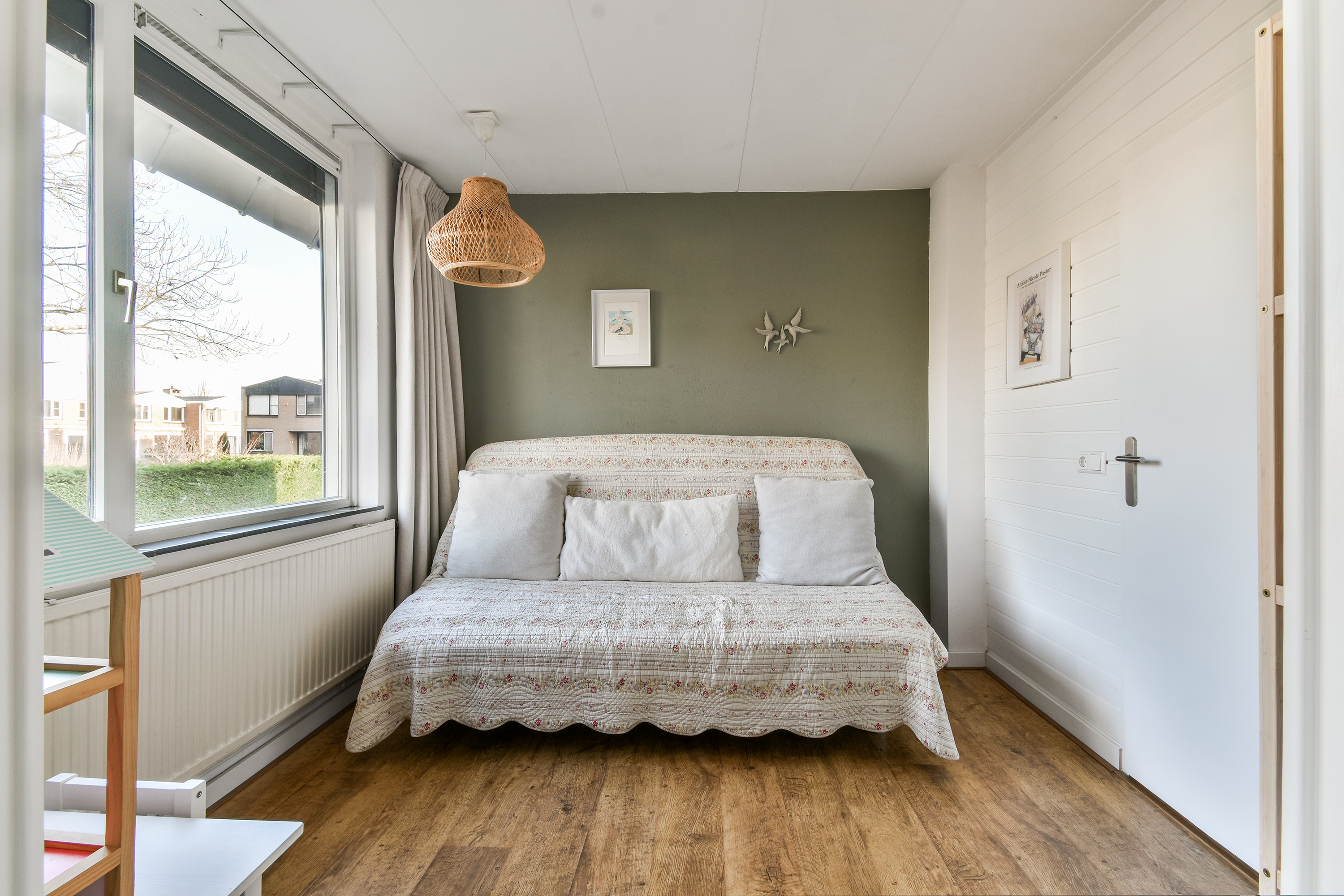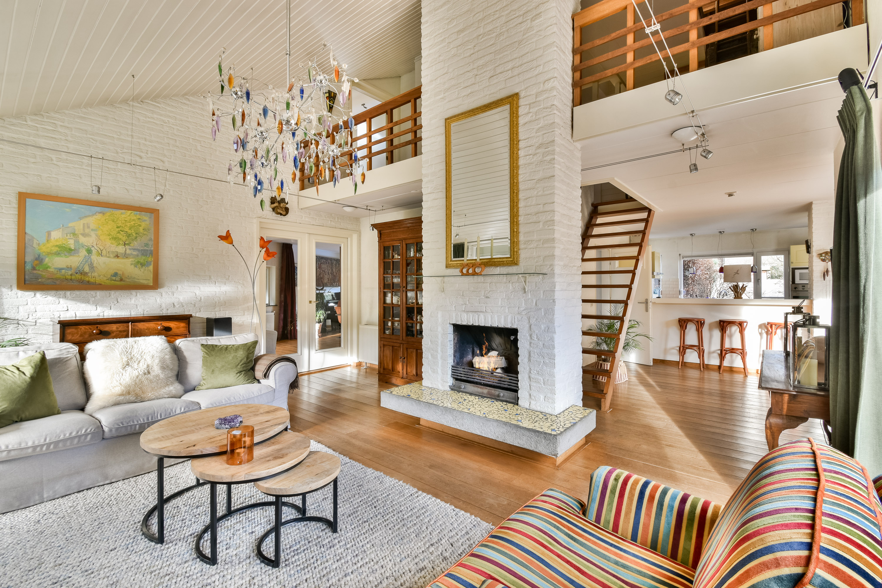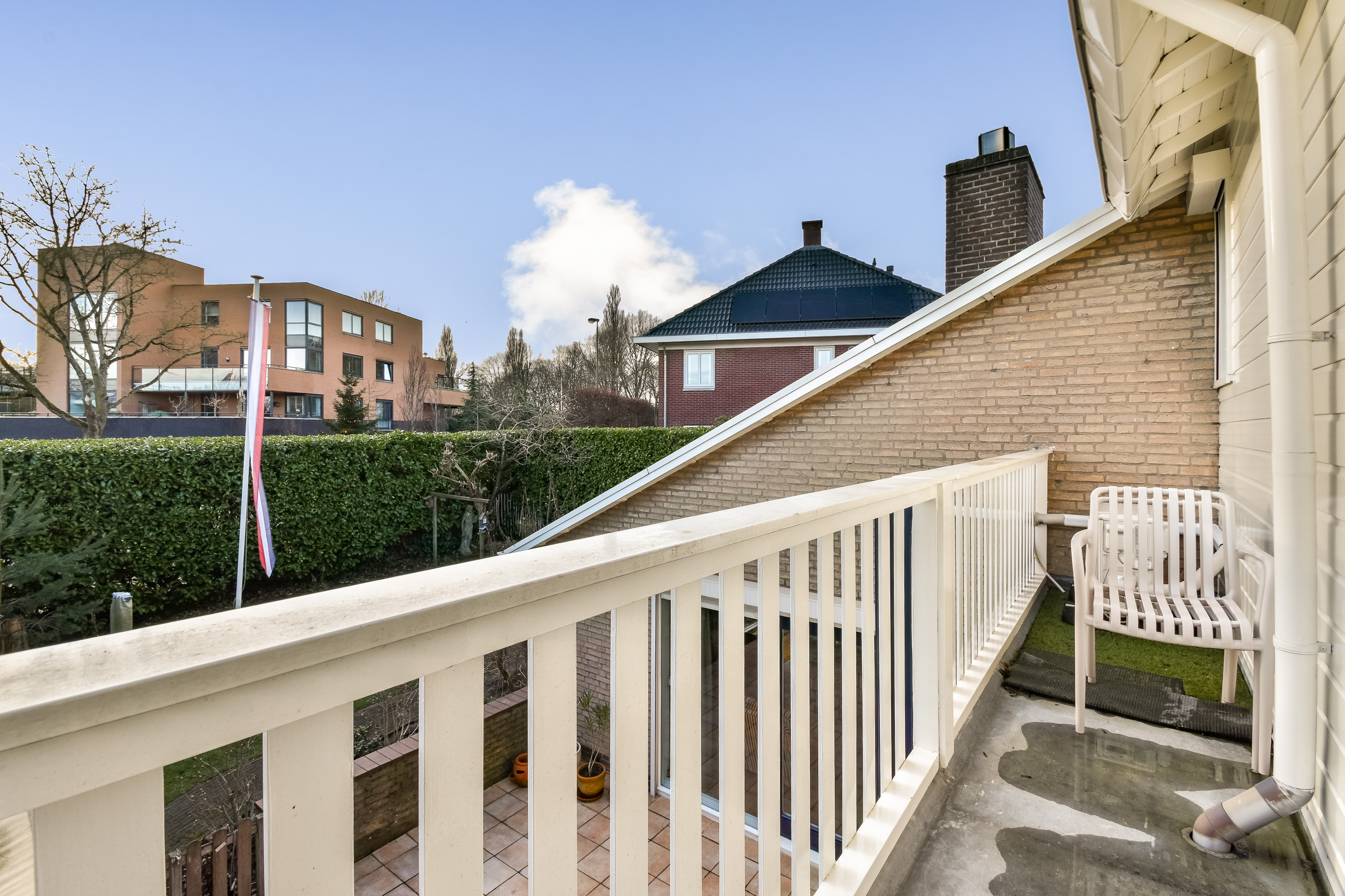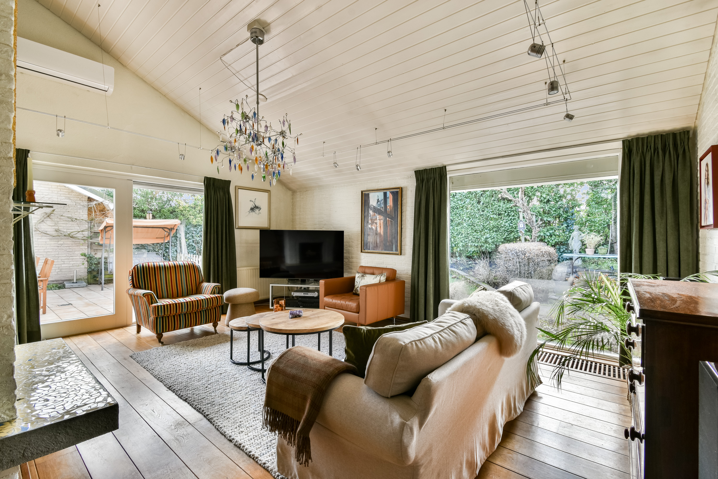 On the ground floor, the entrance opens into a spacious living room with air conditioning and a fireplace, complemented by wide doors leading directly to the garden and sunny patio. Adjacent to the kitchen equipped with built-in appliances lies a utility room and indoor storage. The massief oak flooring throughout the main level introduces warmth, while an extra versatile room opens onto the garden, providing possibilities for home office or creative pursuits.