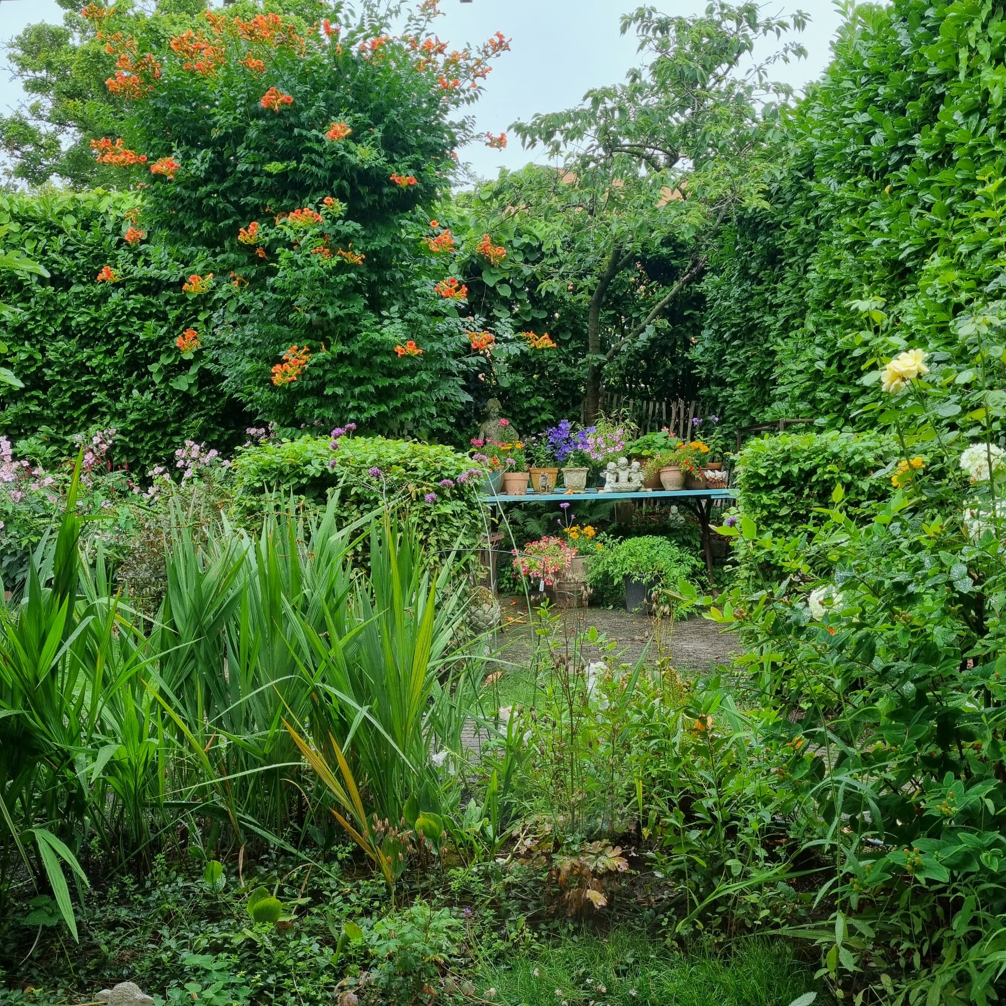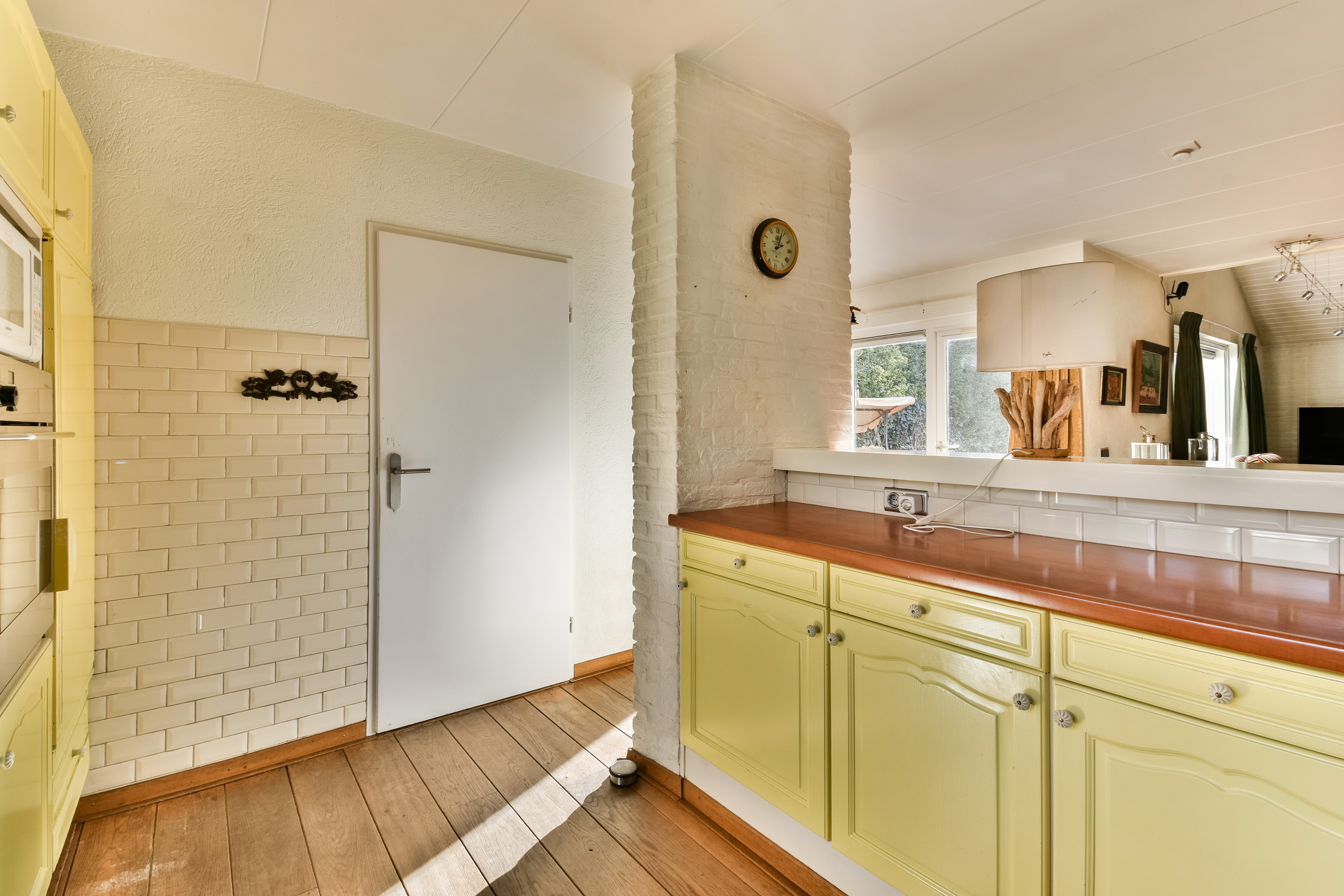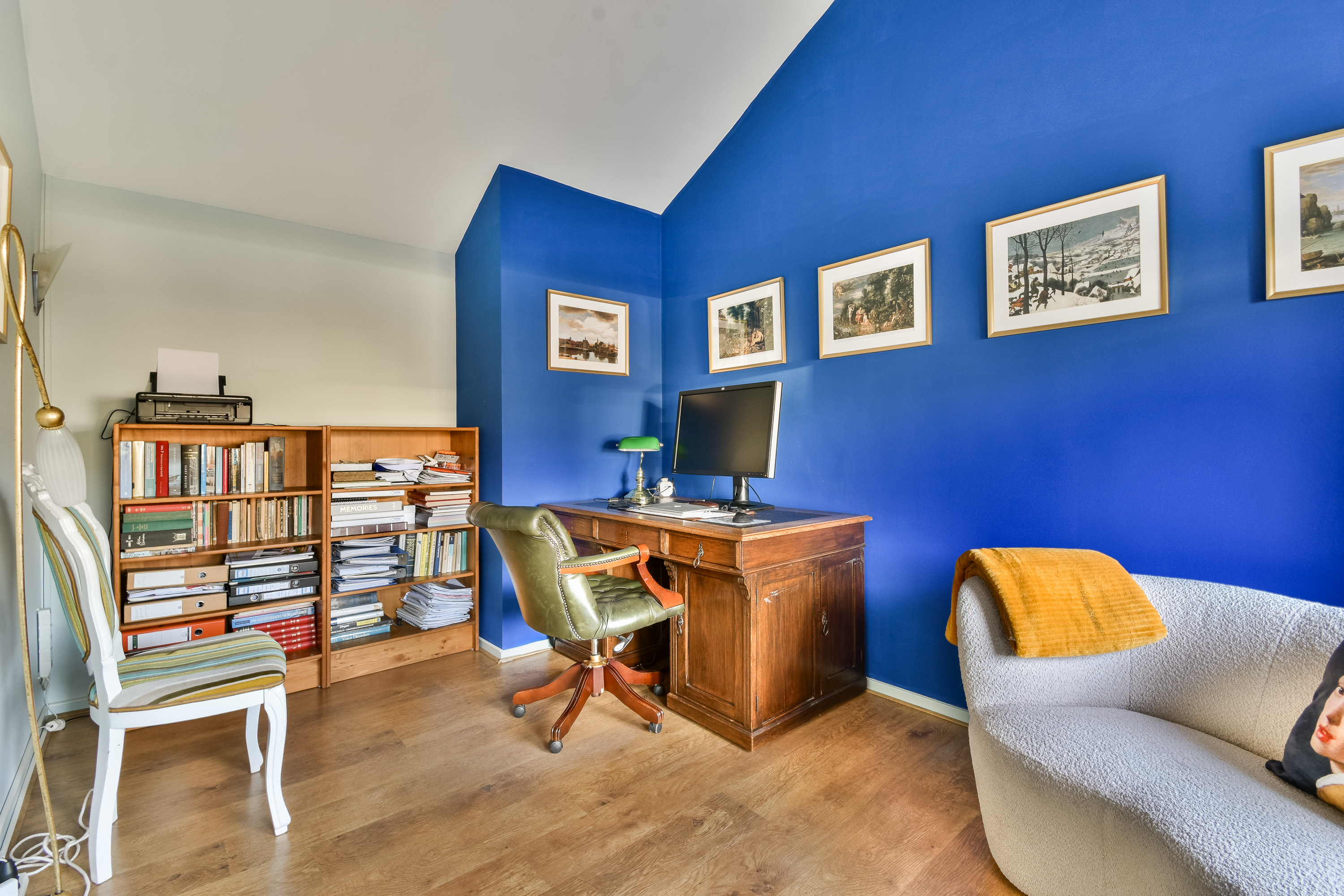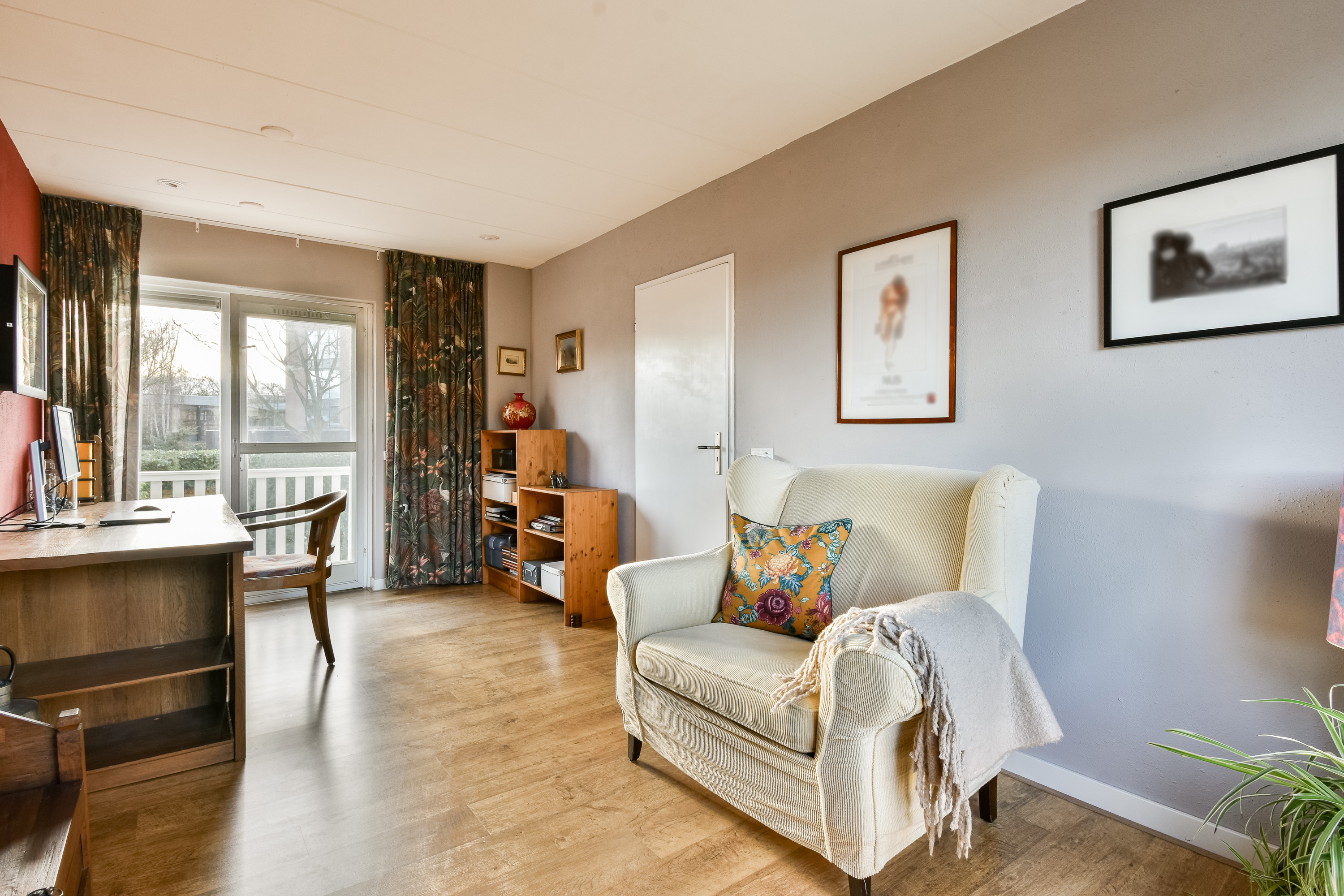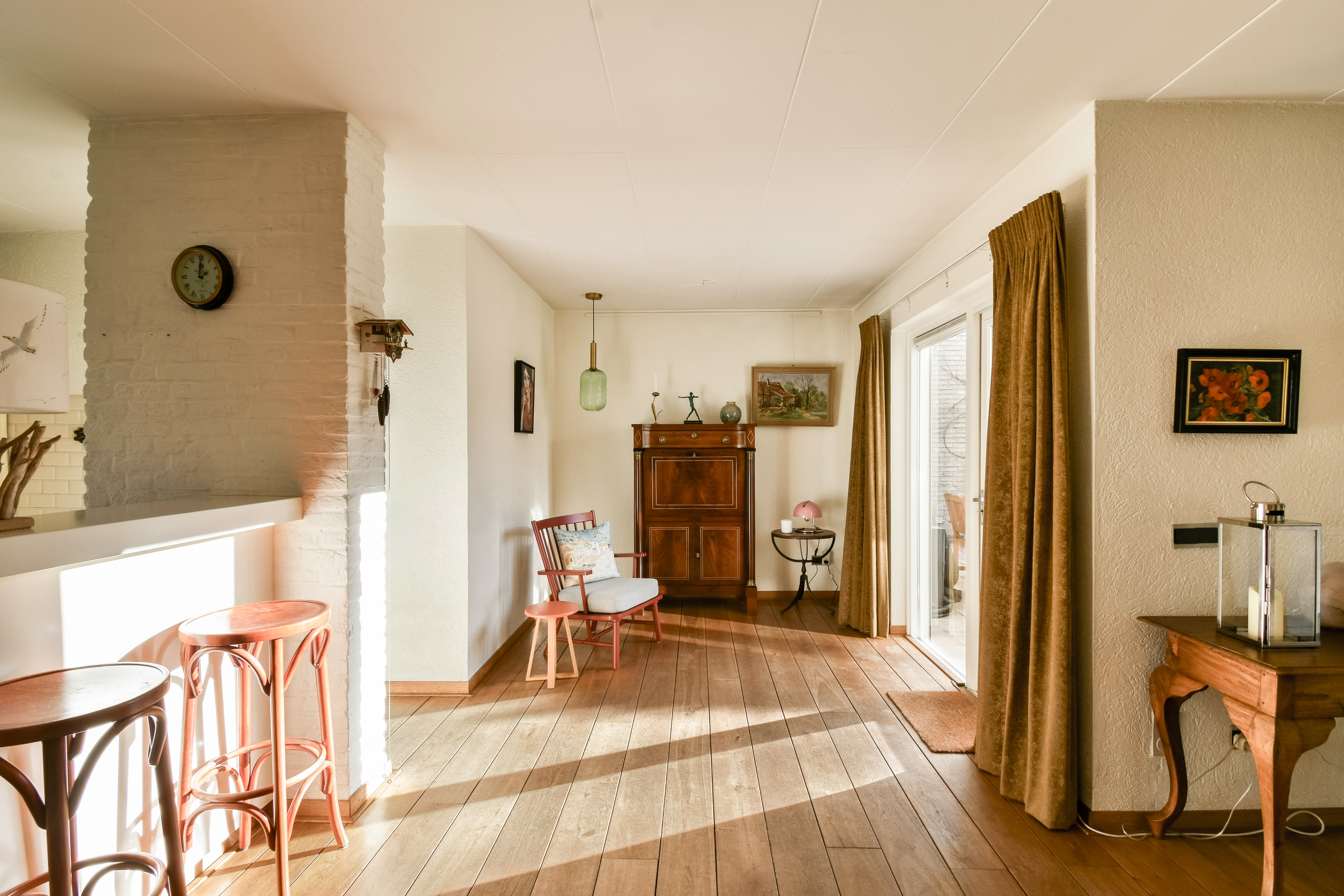 On the ground floor, the entrance opens into a spacious living room with air conditioning and a fireplace, complemented by wide doors leading directly to the garden and sunny patio. Adjacent to the kitchen equipped with built-in appliances lies a utility room and indoor storage. The massief oak flooring throughout the main level introduces warmth, while an extra versatile room opens onto the garden, providing possibilities for home office or creative pursuits.