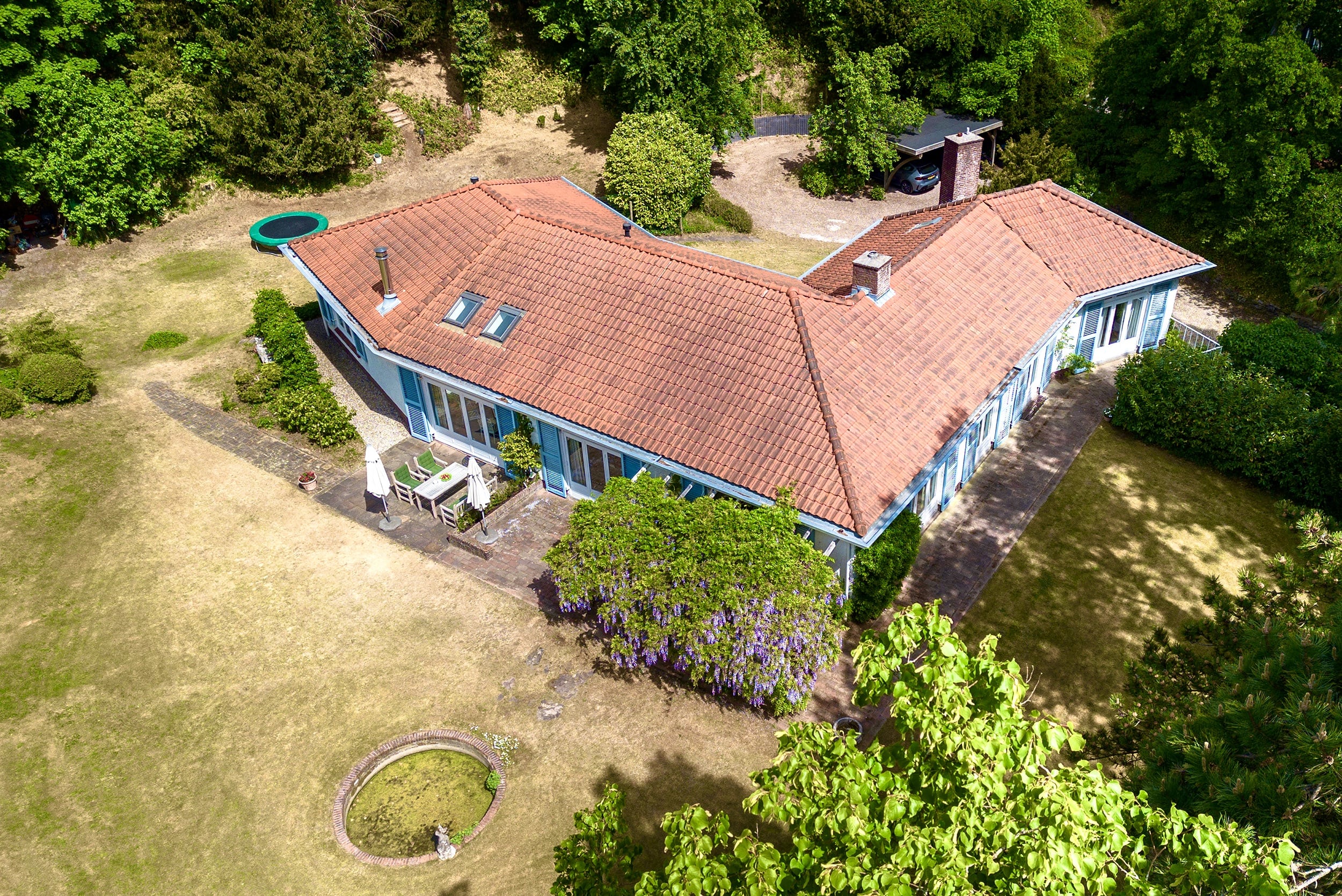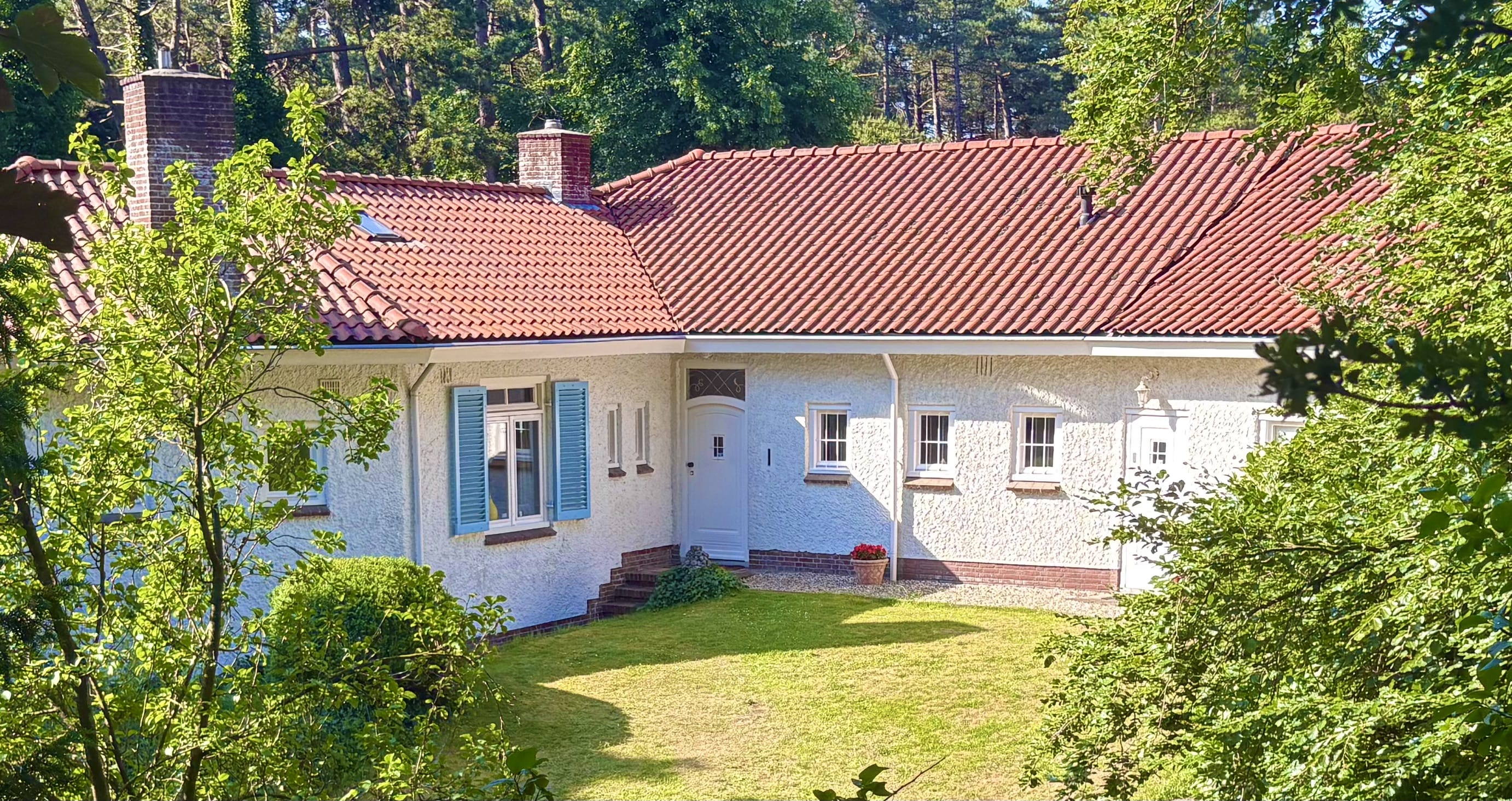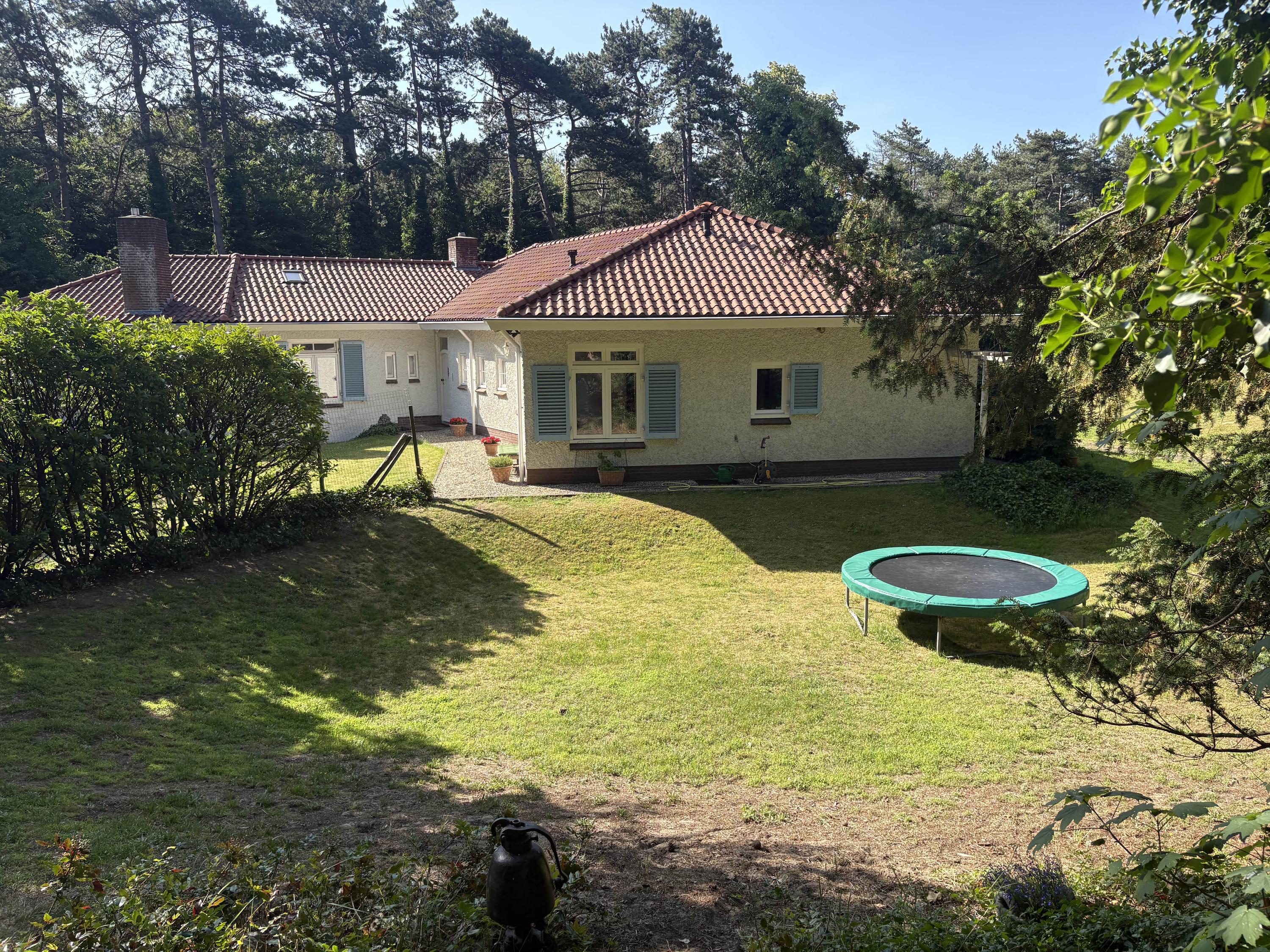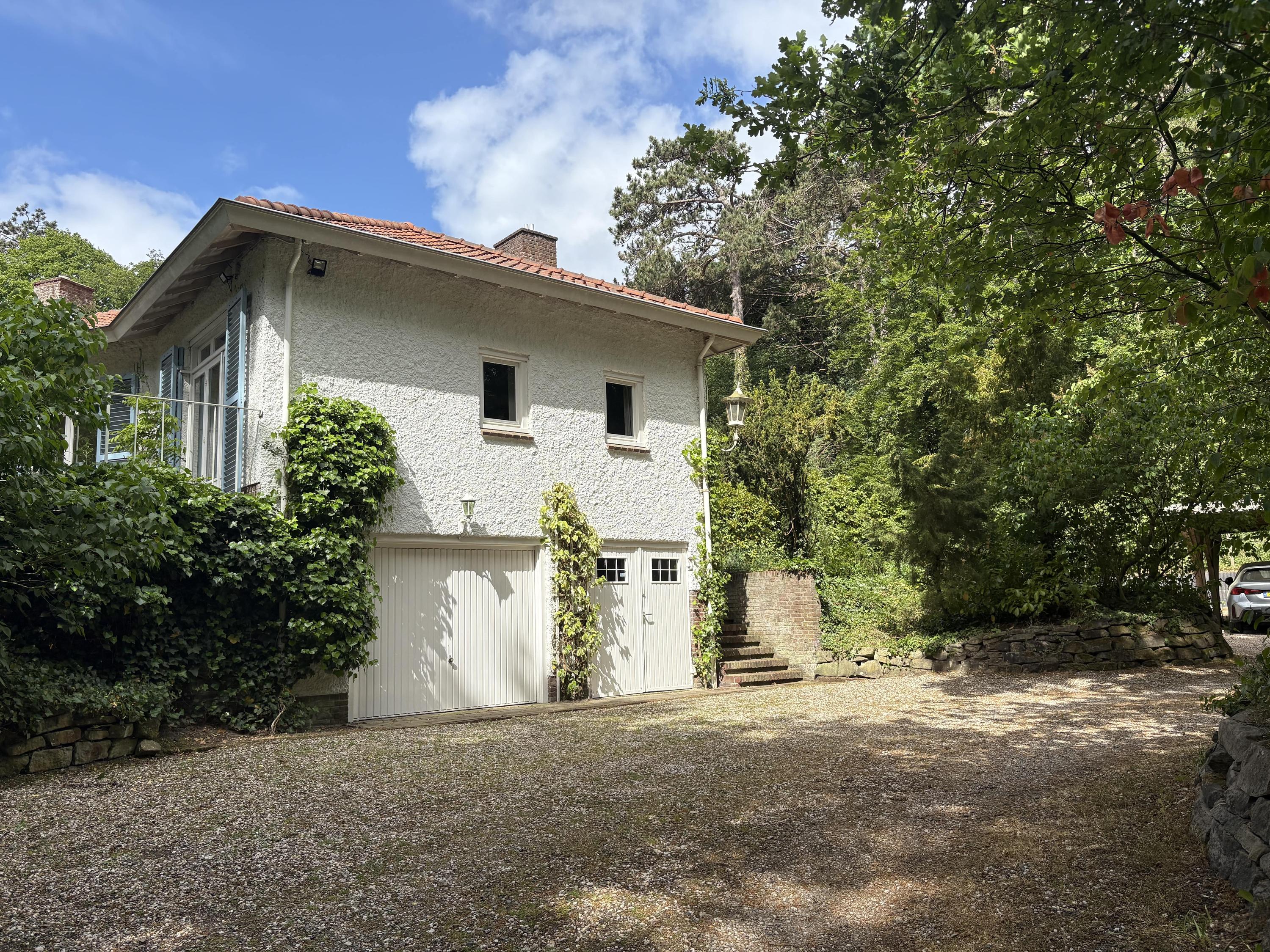 Detached villa Bloemendaal offers a refined architectural presence within the sought-after Duin en Daal villa park. Designed by H.W. van Kempen, this property evokes Mediterranean lightness with its subtle blue Louvre shutters, hipped roof, and the authentic character of French tiles in the hallway. Set on a substantial 4420 m² private plot, the house is surrounded by mature trees and elevated above the road, providing optimal privacy.