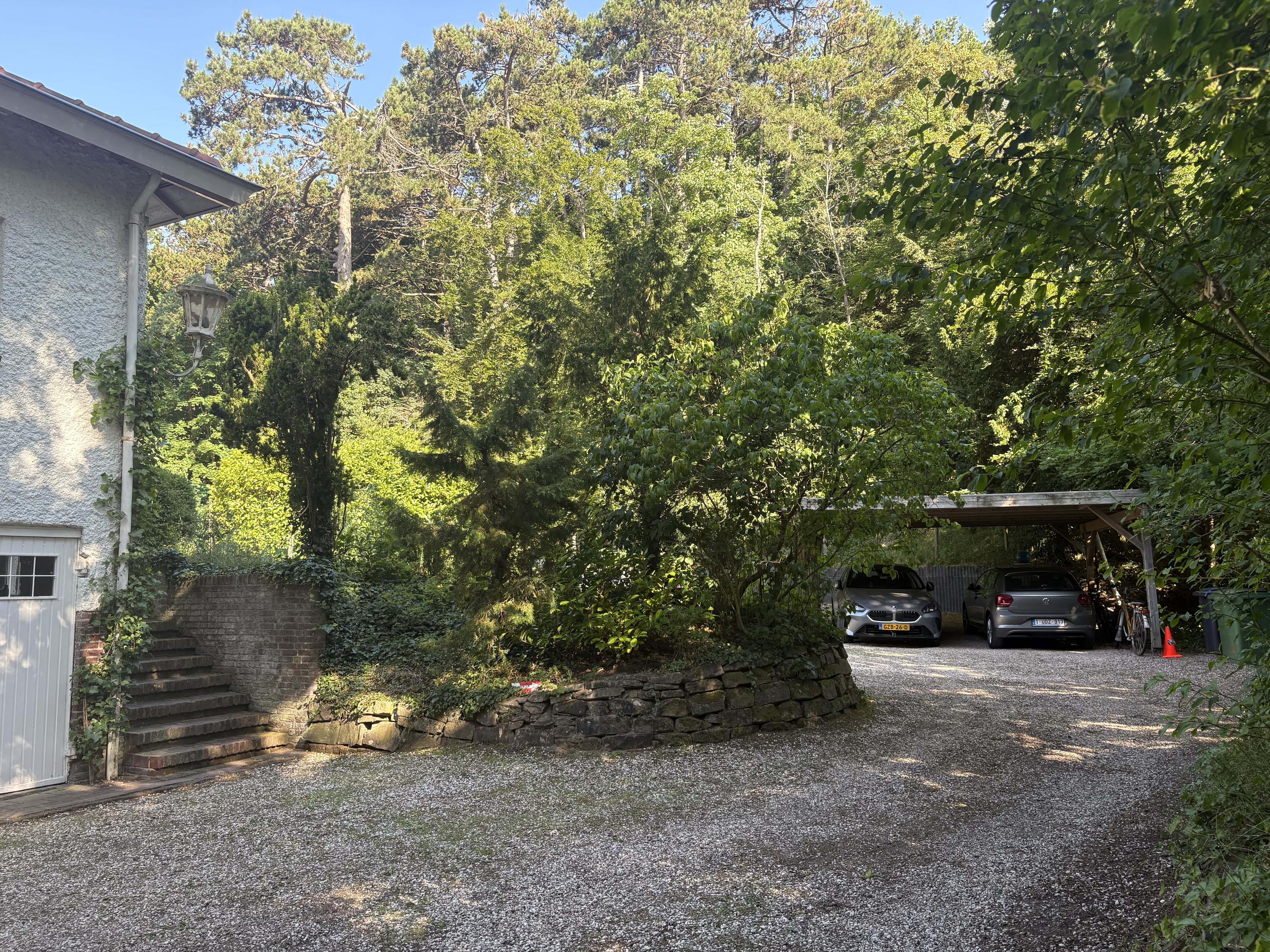 A sweeping driveway leads to a double carport with round point and ample parking, complemented by an indoor garage. The living area of 221 m² is arranged in both the original 1953 house and a 2001 extension, maintaining architectural continuity throughout. Interiors are composed for comfort: airy rooms are connected by French doors to the unusually varied and sunlit garden. The main living spaces blend parquet and terrazzo flooring, open fireplaces, and bespoke built-ins, shaping an atmosphere of understated warmth.