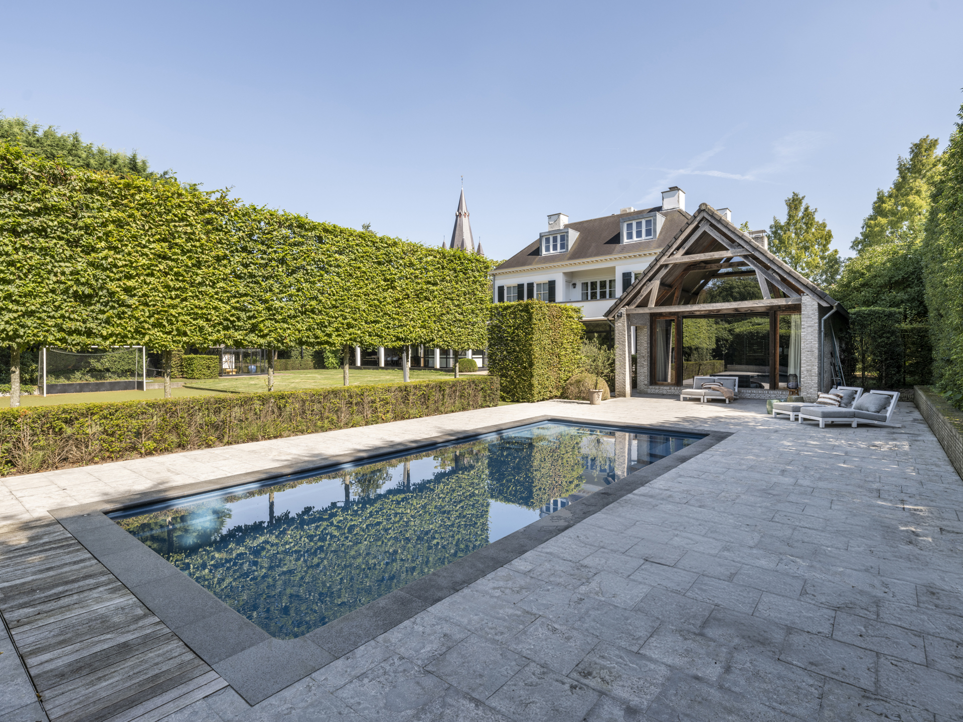 Behind the gate, you will discover the courtyard with plane trees and a wooden shed for 4 cars. The 850 m² large mansion was built in 2011 and showcases a combination of classical and modern architecture, reflecting stately allure and maximum modern living comfort. In the summer, the approximately 3,200 m² secured plot allows you to enjoy the swimming pool, the (covered) terraces, and the spacious lawn, which includes a synthetic grass hockey field for the children. In the winter, the light-filled rooms facing the garden provide a cozy space of peace and comfort, right in the charming Ginneken.