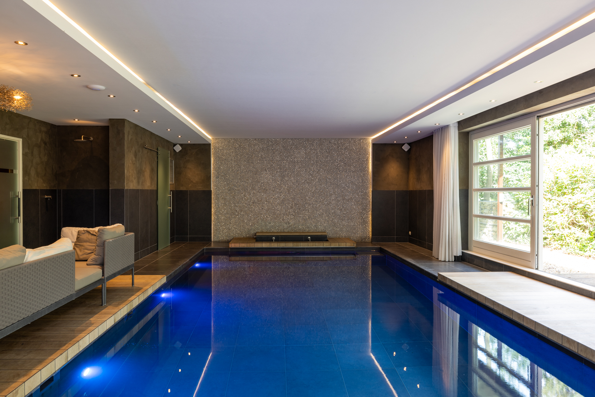 This space is equipped with two large sliding doors that can be opened, giving you the feeling of an outdoor swimming pool. This also creates a beautiful integration with the terrace, the great outdoor space and the garden.