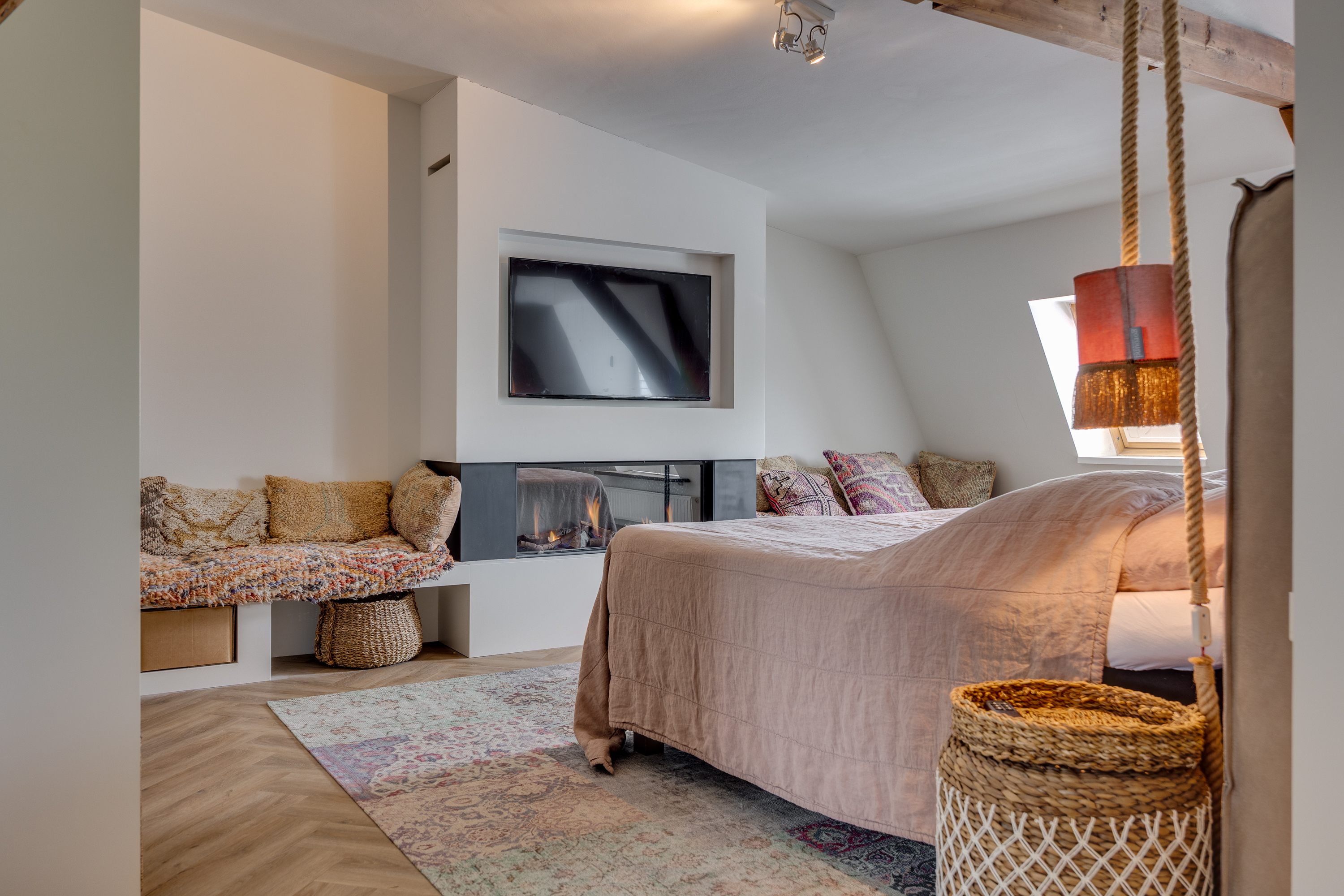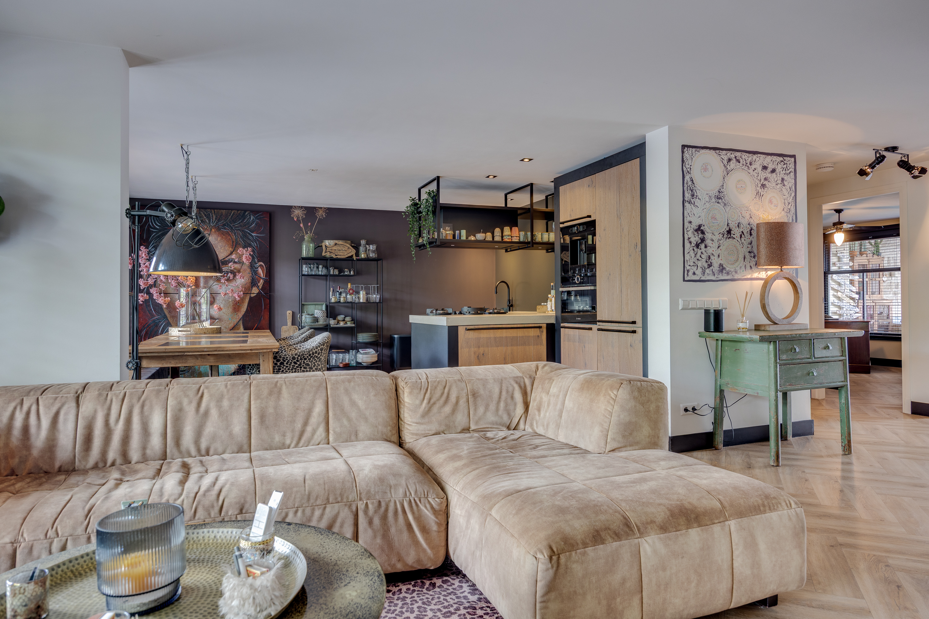 The spacious living room at the front is a real eye-catcher, with large windows that provide an abundance of natural light and offer a beautiful view of the lively Kerkbrink. The stylish PVC flooring that runs throughout the entire living area is immediately noticeable. This flooring combines a warm, soothing look with practical features such as durability and ease of maintenance. It forms the perfect basis for any interior. The modern gas fireplace creates a cozy ambiance, ideal for atmospheric evenings. In addition, the air conditioning ensures that the indoor climate remains pleasant throughout the year. Everything about this floor exudes comfort, style, and luxury.