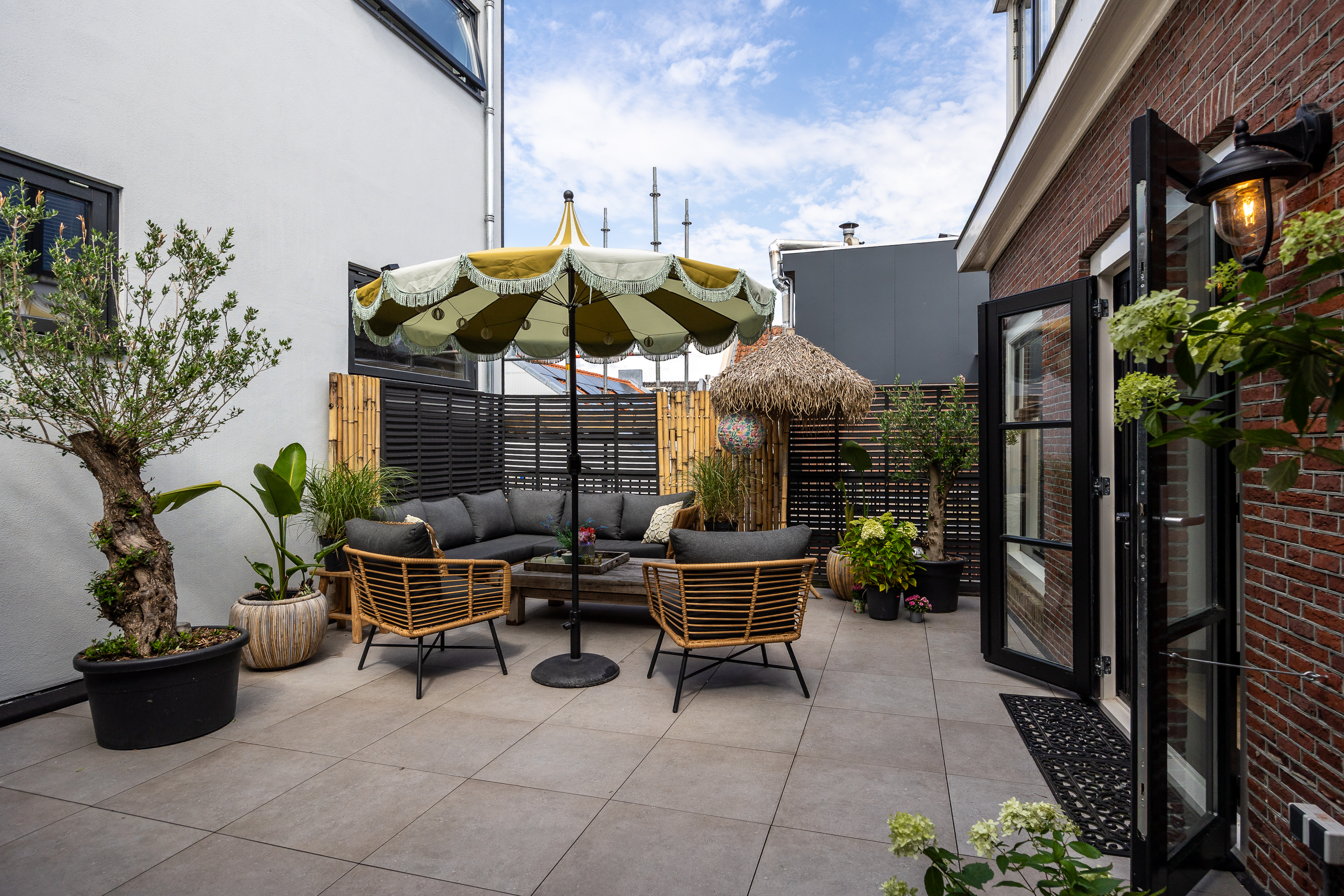 Through a hallway with built-in cupboards and space for an extra refrigerator, you step right onto the roof terrace. This spacious, sunny terrace is fully tiled and equipped with an attractive canopy, a fixed bench, and a custom-made table. Here you will experience complete peace and privacy, right in the center of town. A wonderful outdoor retreat, perfect for dinners, drinks, or a cup of coffee in the morning sun.